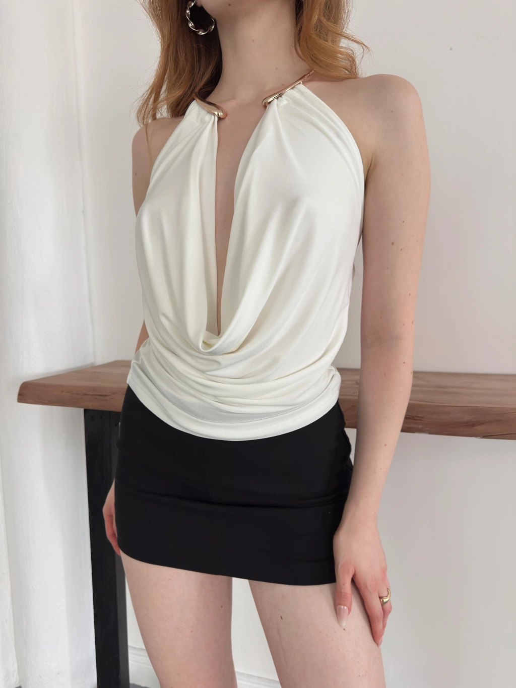 Aksesuar Detaylı Boyundan Bağlamalı Bluz Beyaz
