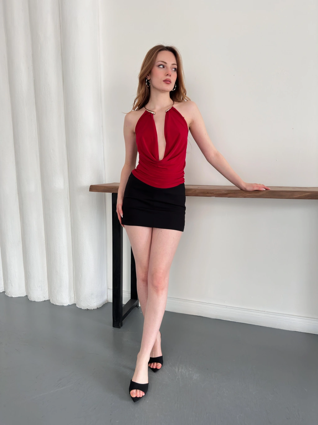 Aksesuar Detaylı Boyundan Bağlamalı Bluz Bordo