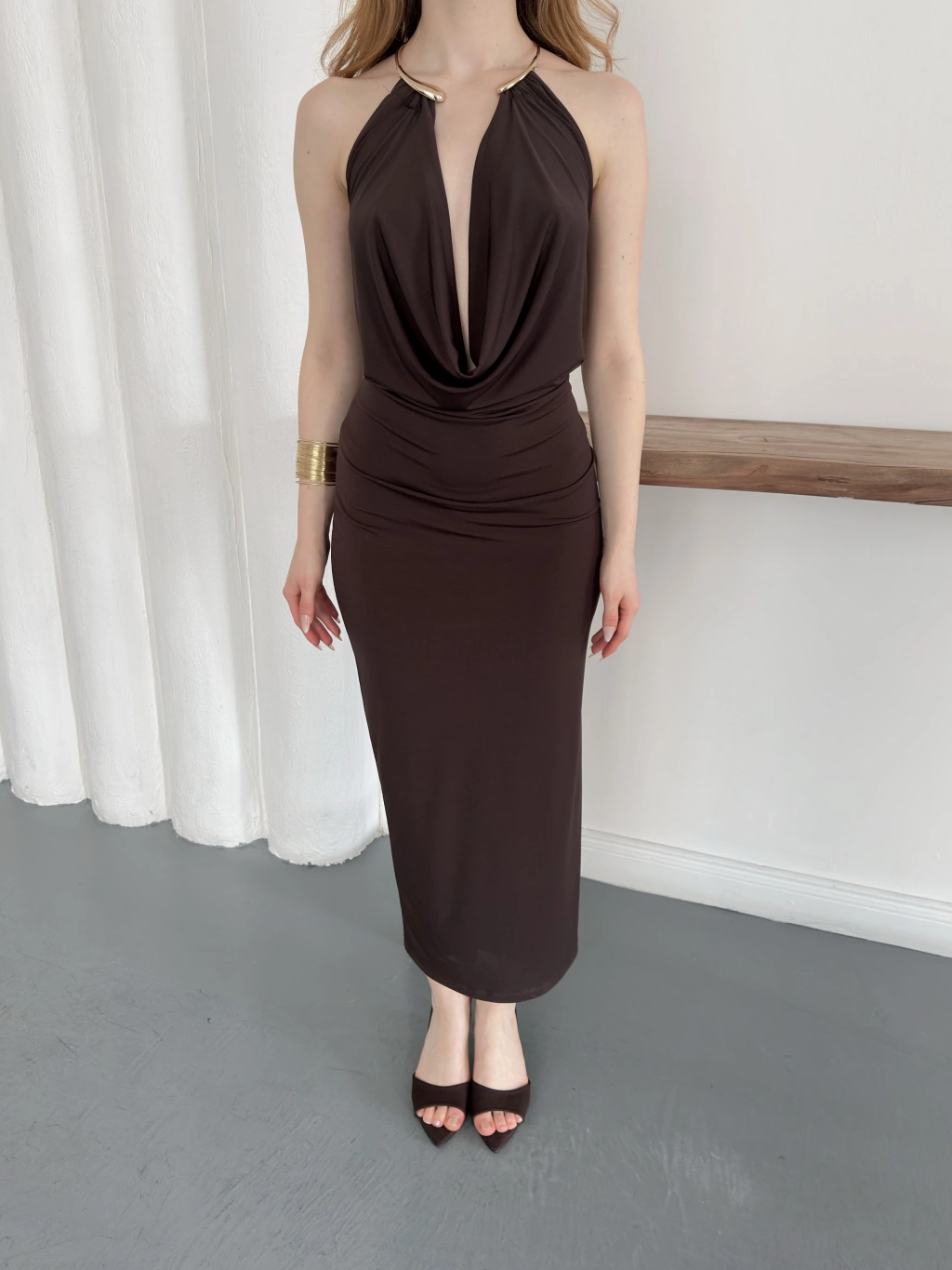 Aksesuar Detaylı Boyundan Bağlamalı Dekolte Elbise Kahve