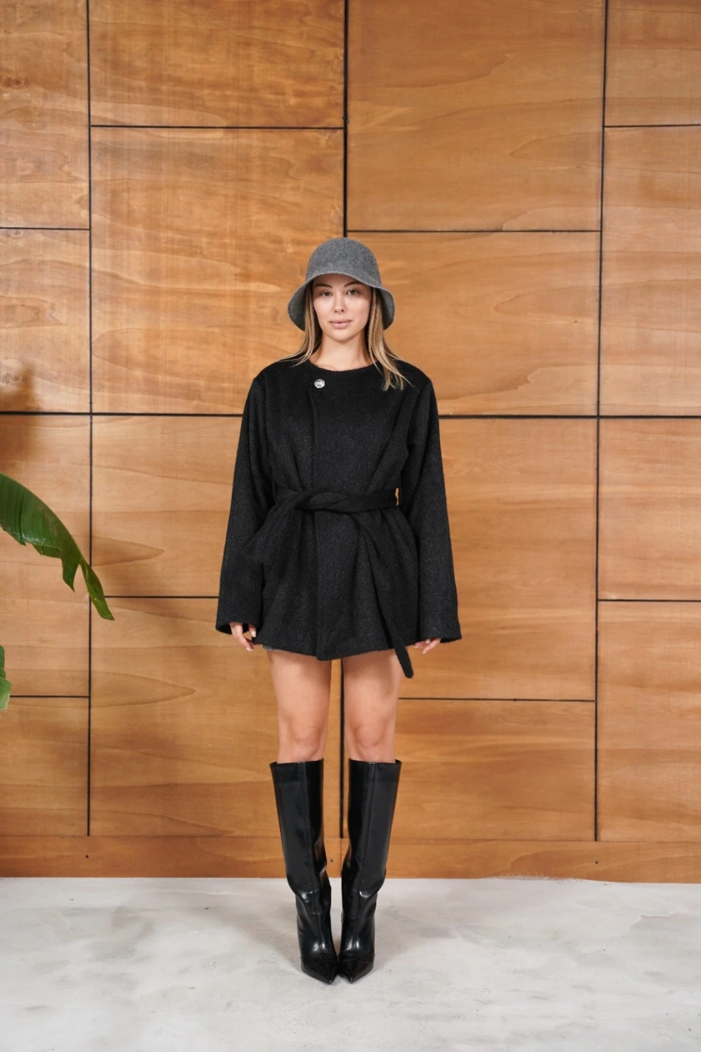 Aksesuar Detaylı Kuşaklı Fox Ceket Siyah