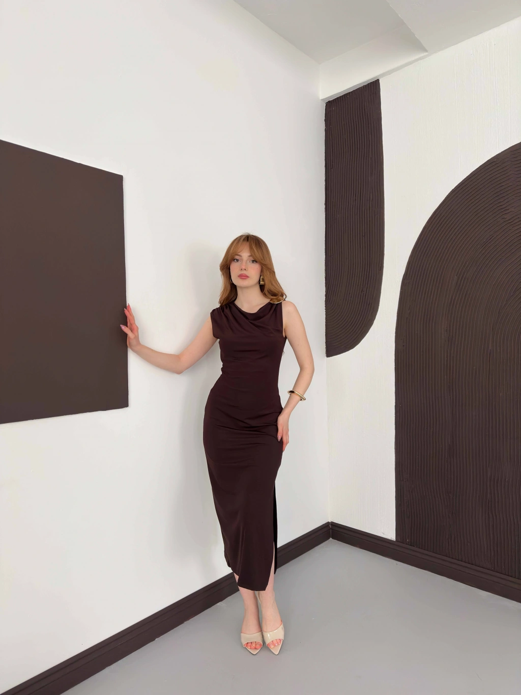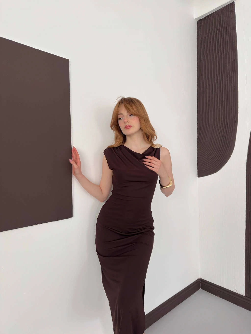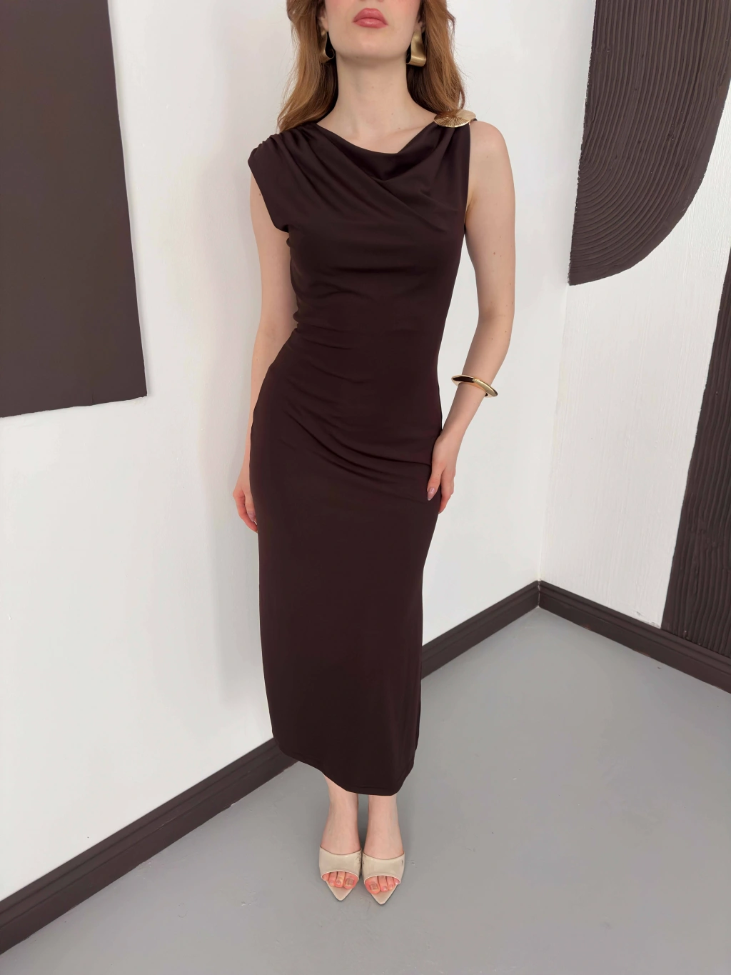 Aksesuar Detaylı Tek Omuz Sandy Elbise Kahve