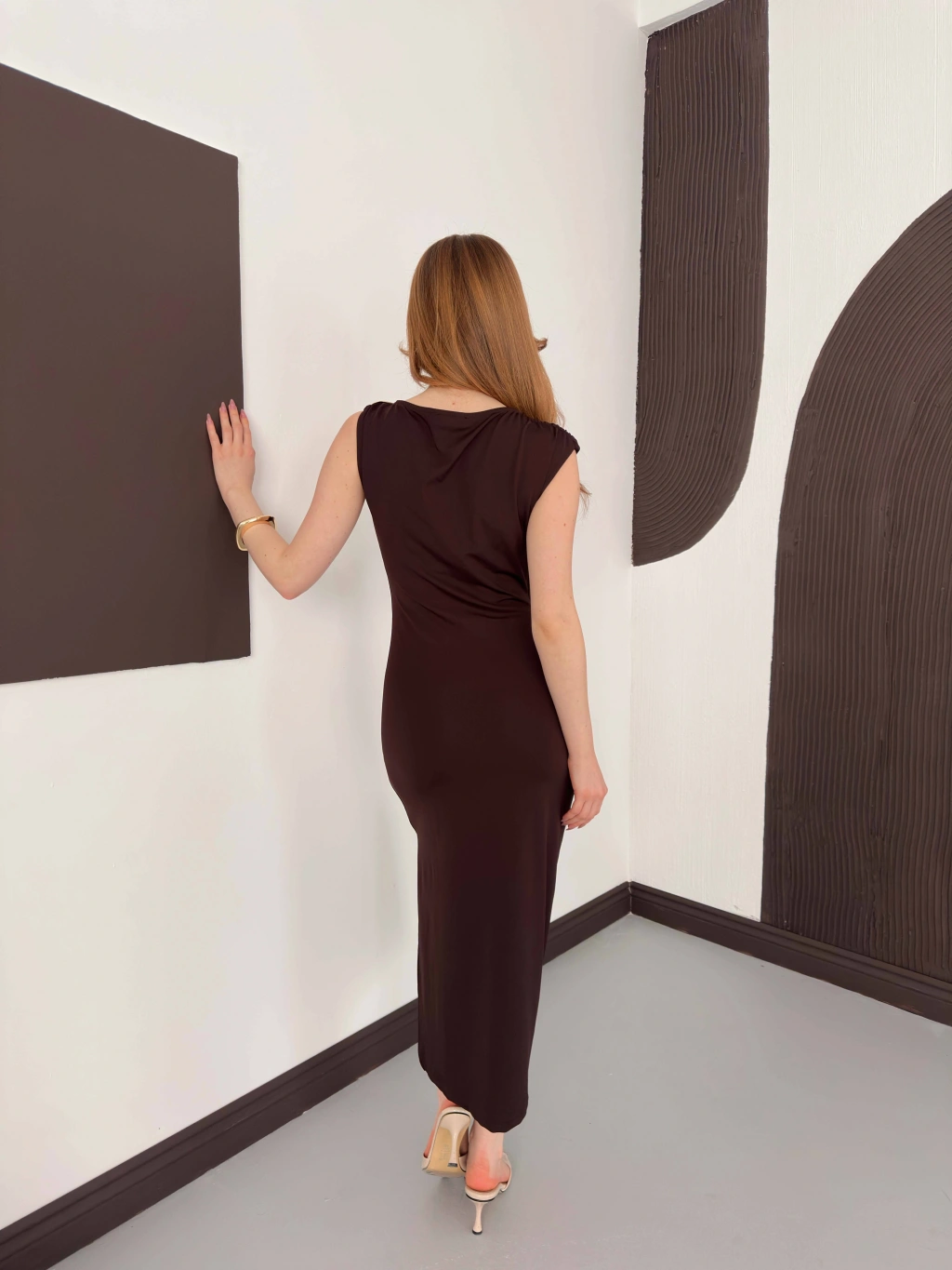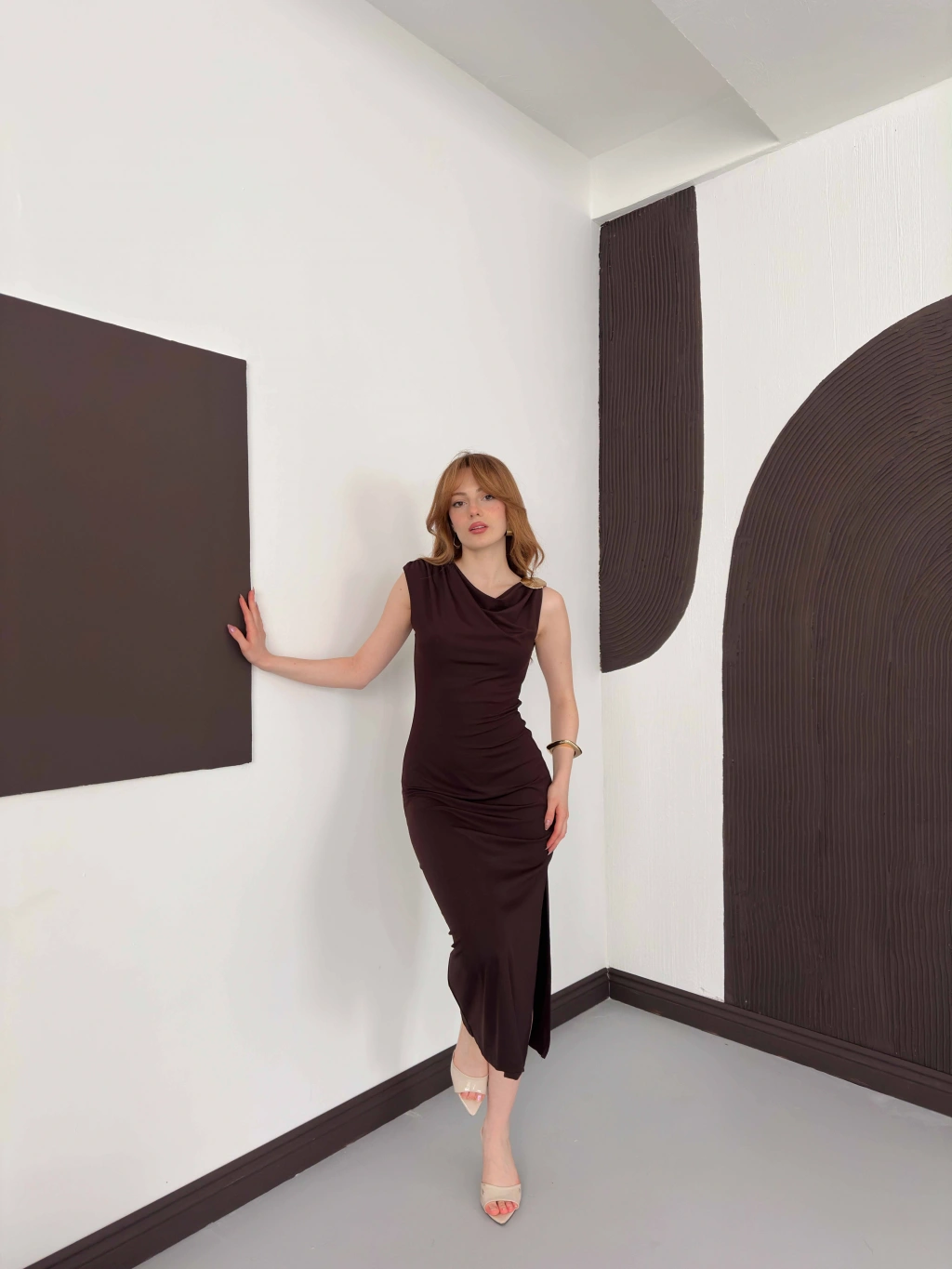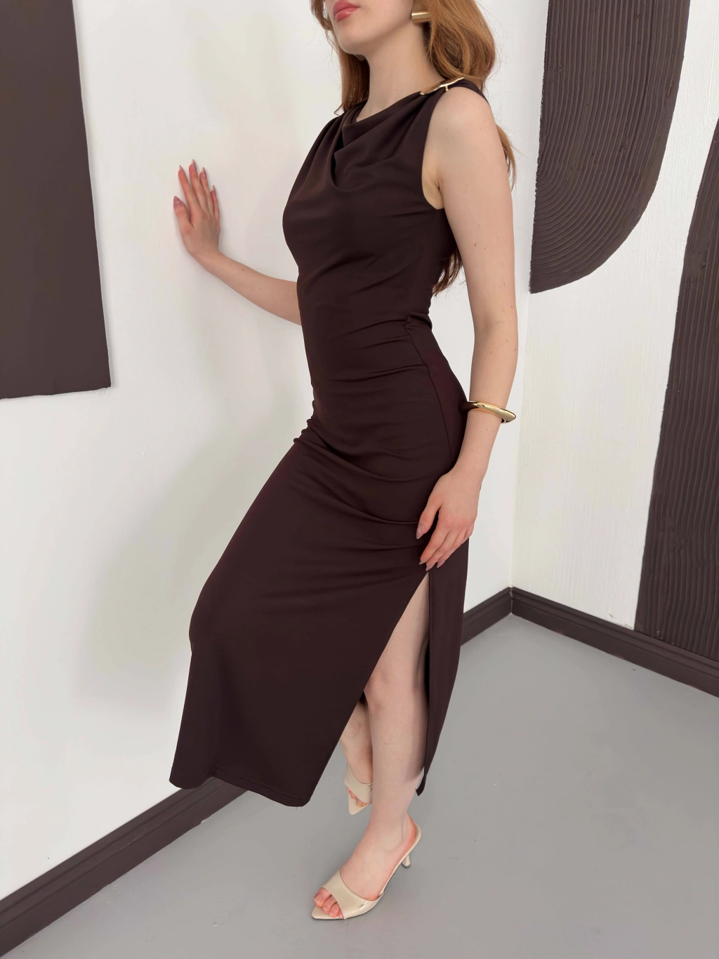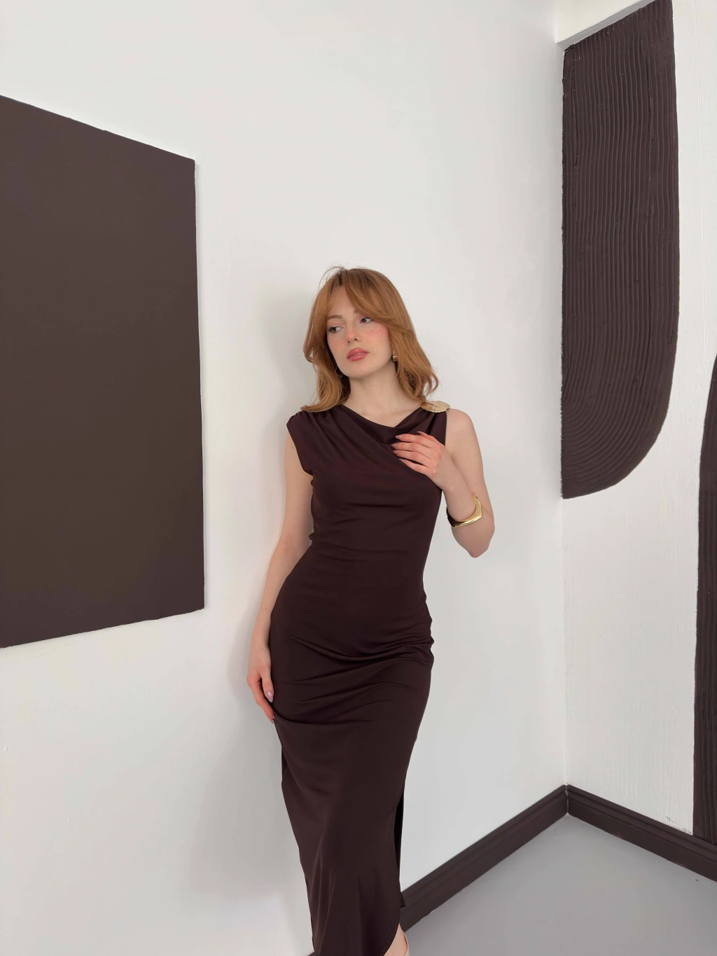 Aksesuar Detaylı Tek Omuz Sandy Elbise Kahve