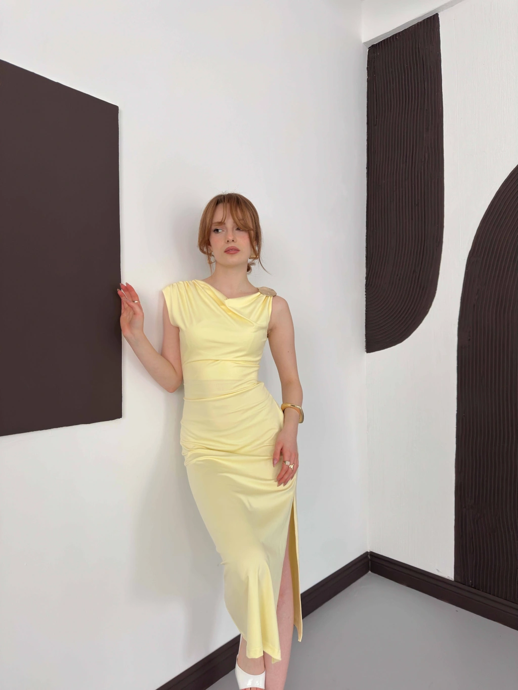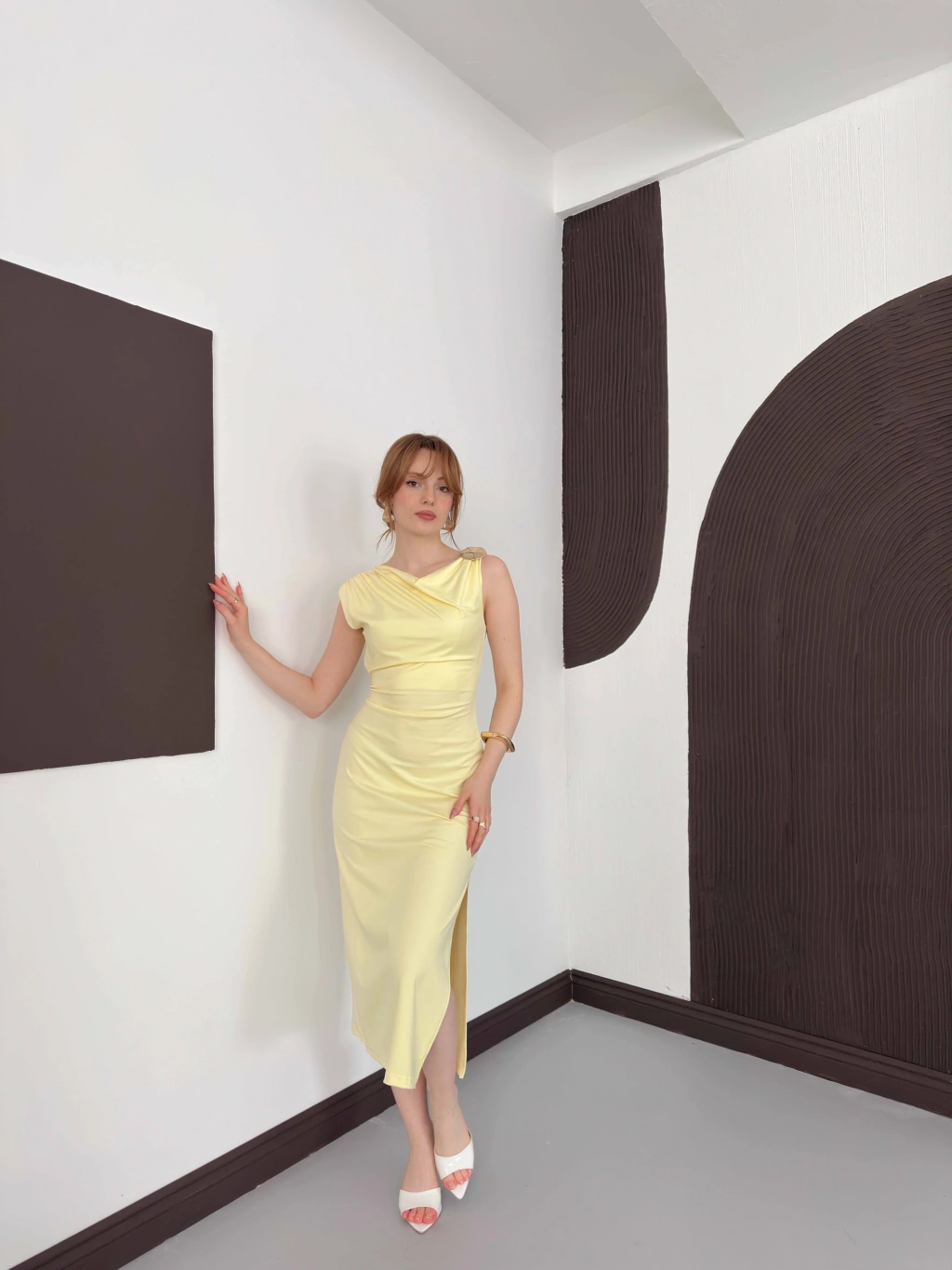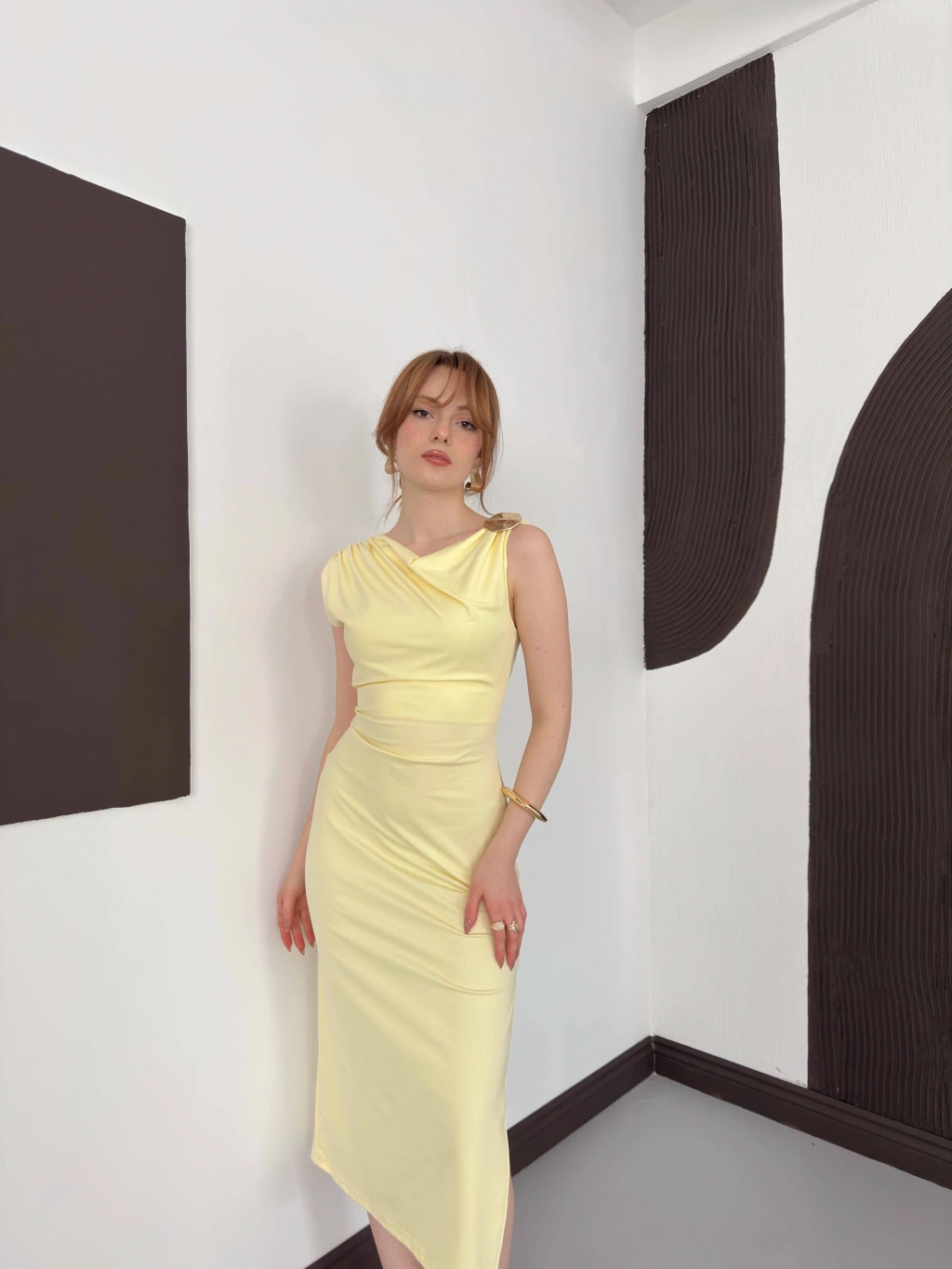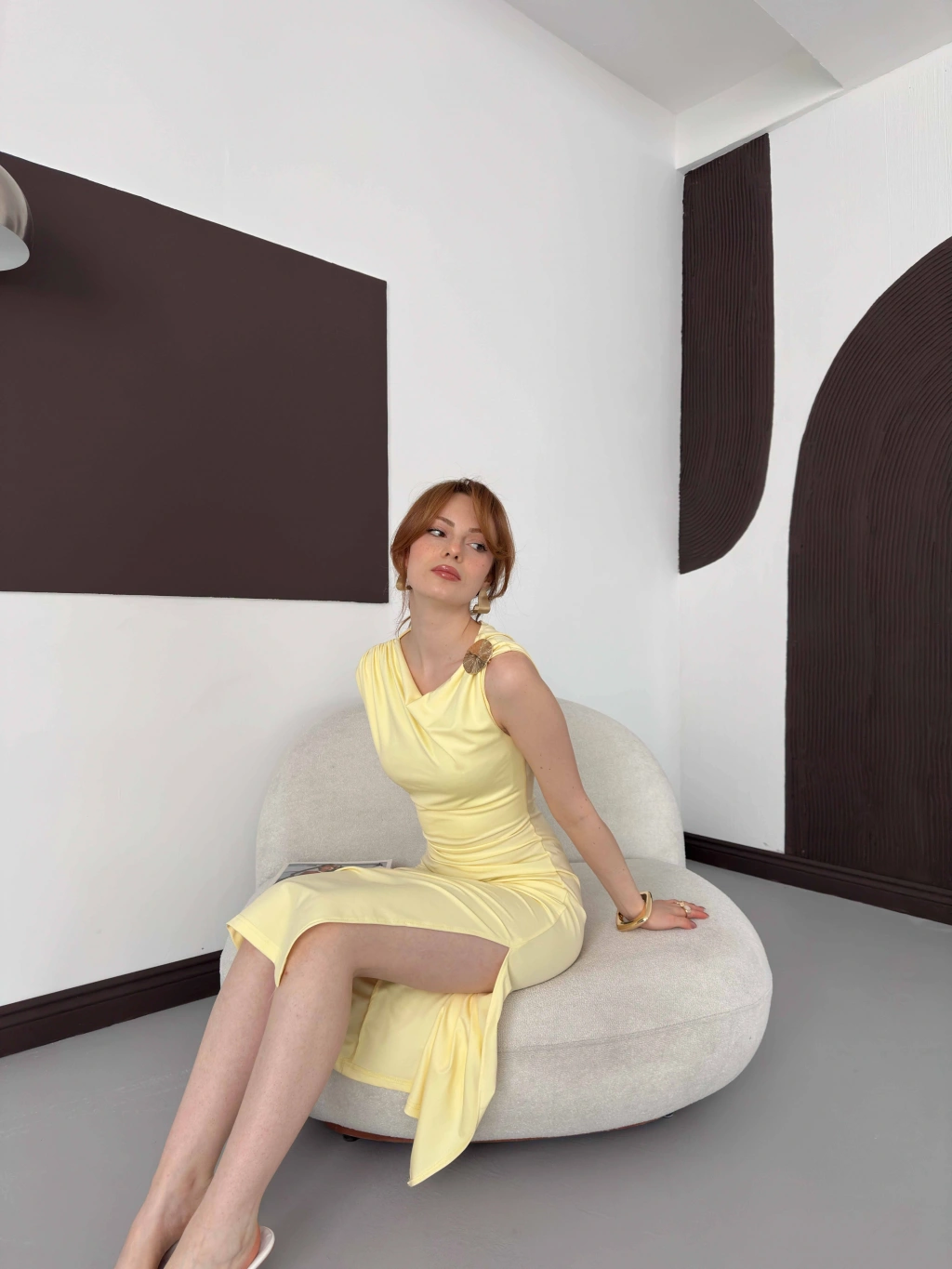 Aksesuar Detaylı Tek Omuz Sandy Elbise Sarı