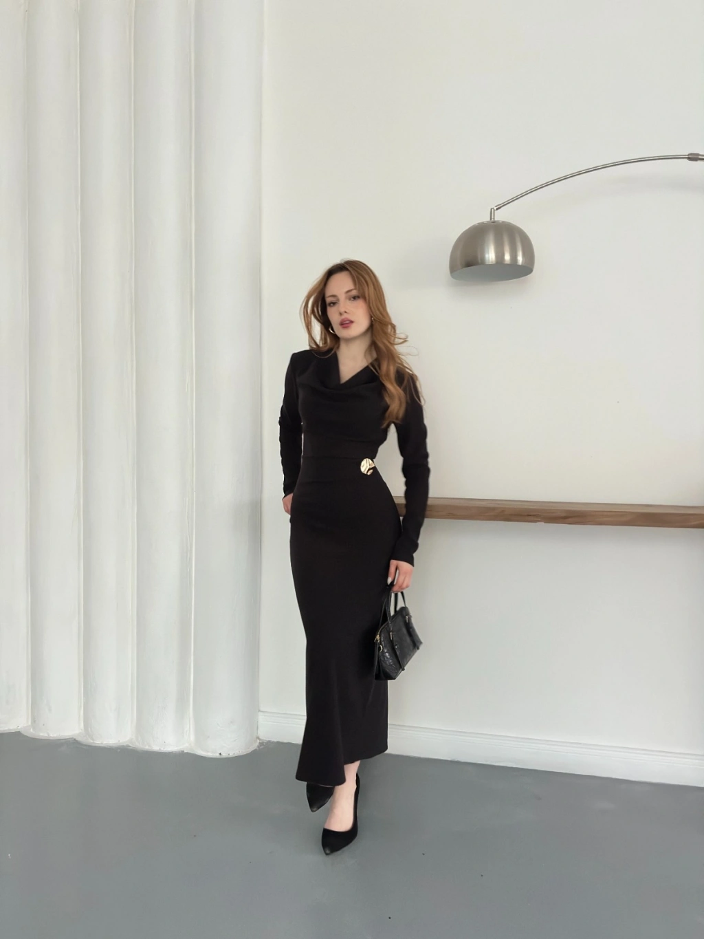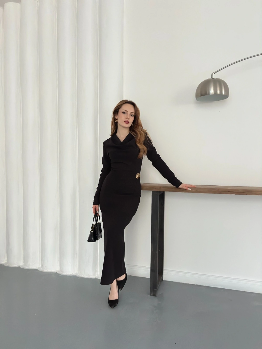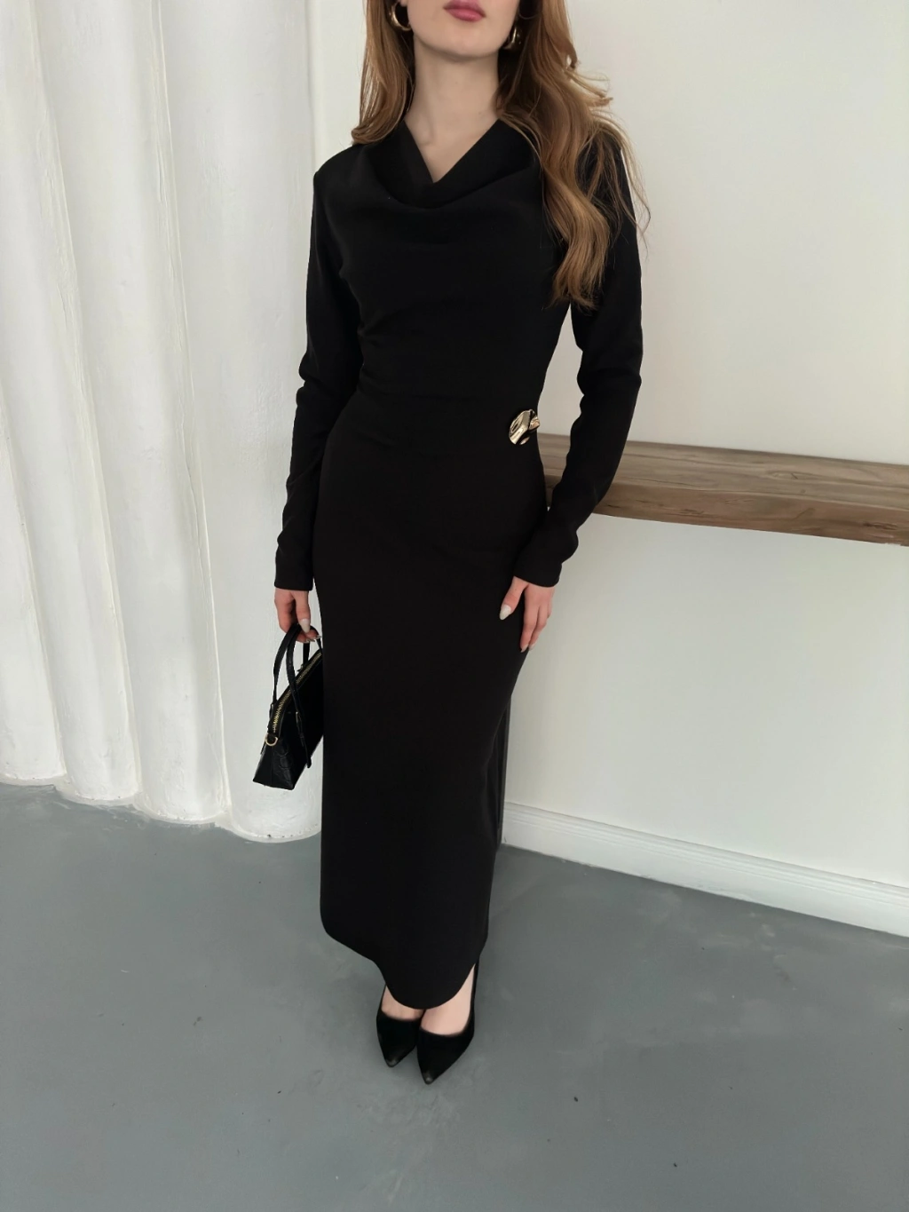 Aksesuar Detaylı Uzun Kol Elbise Siyah