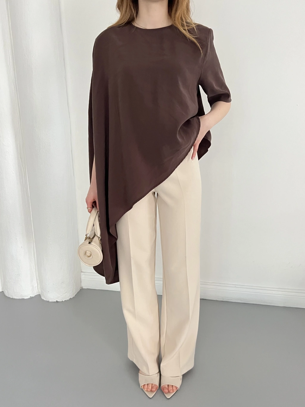 Asimetrik Kesim Vatkalı Tasarım Bluz Kahve
