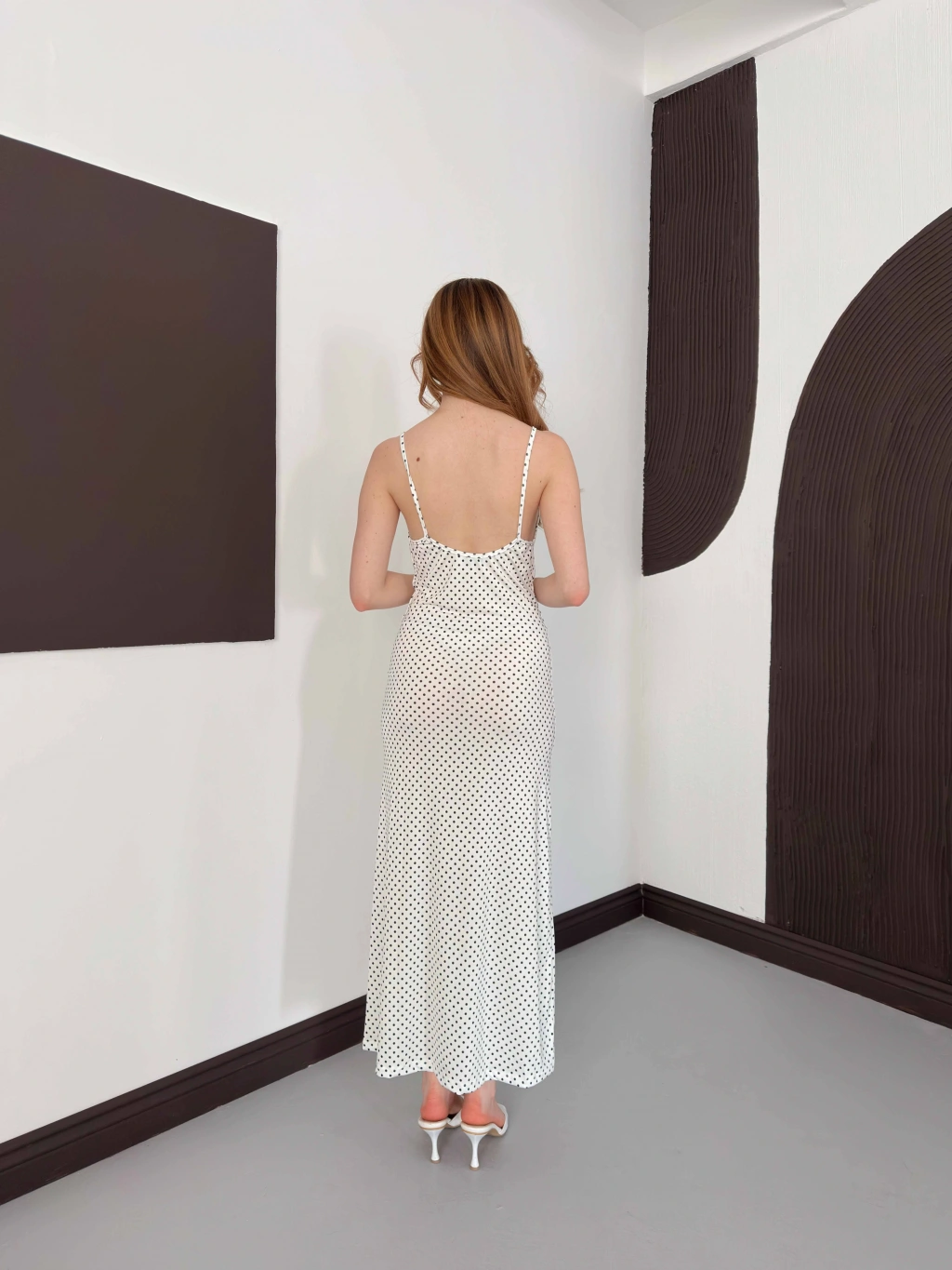 Askılı Yırtmaç Detaylı Puantiyeli Elbise Beyaz