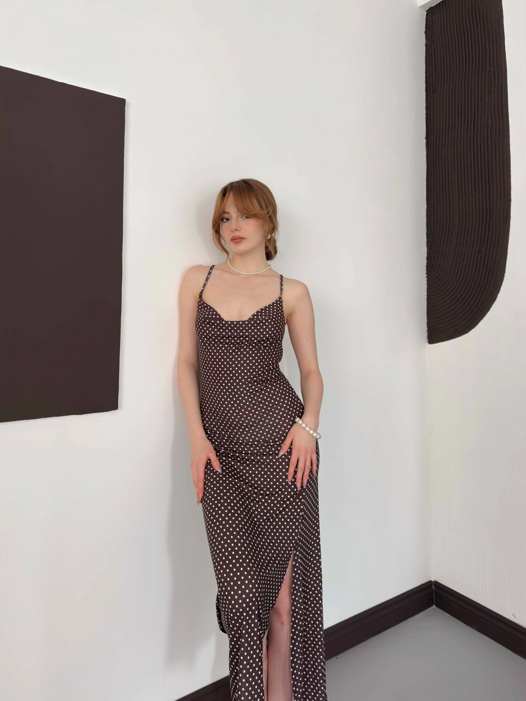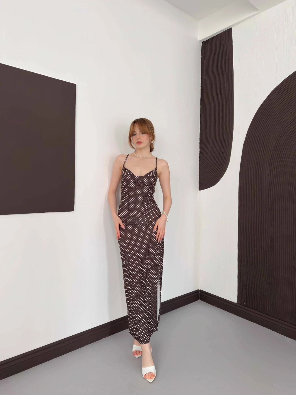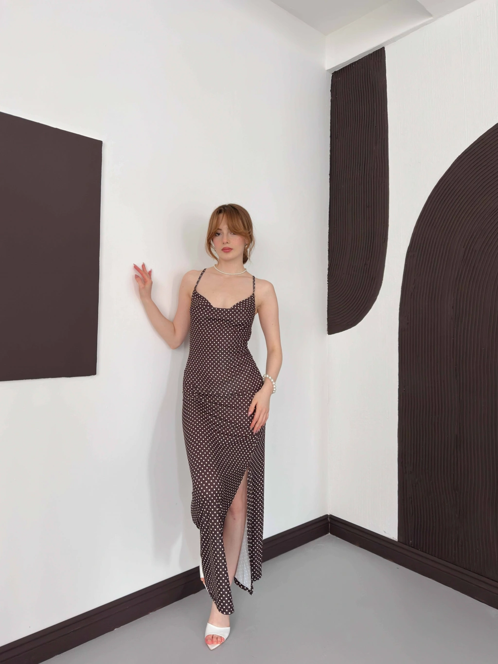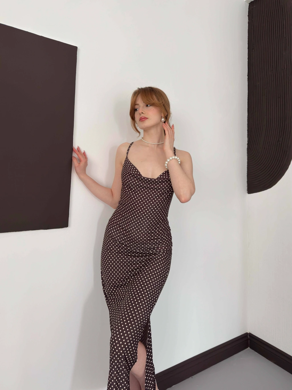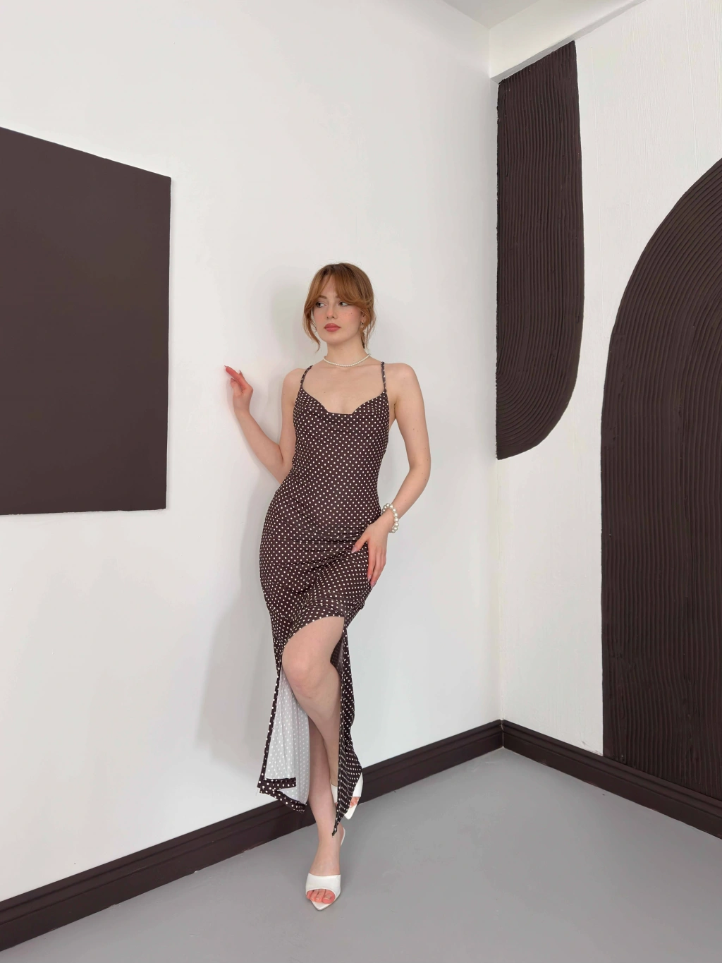 Askılı Yırtmaç Detaylı Puantiyeli Elbise Kahve