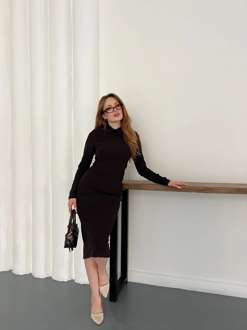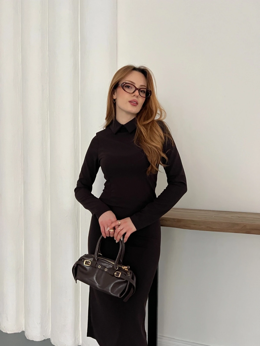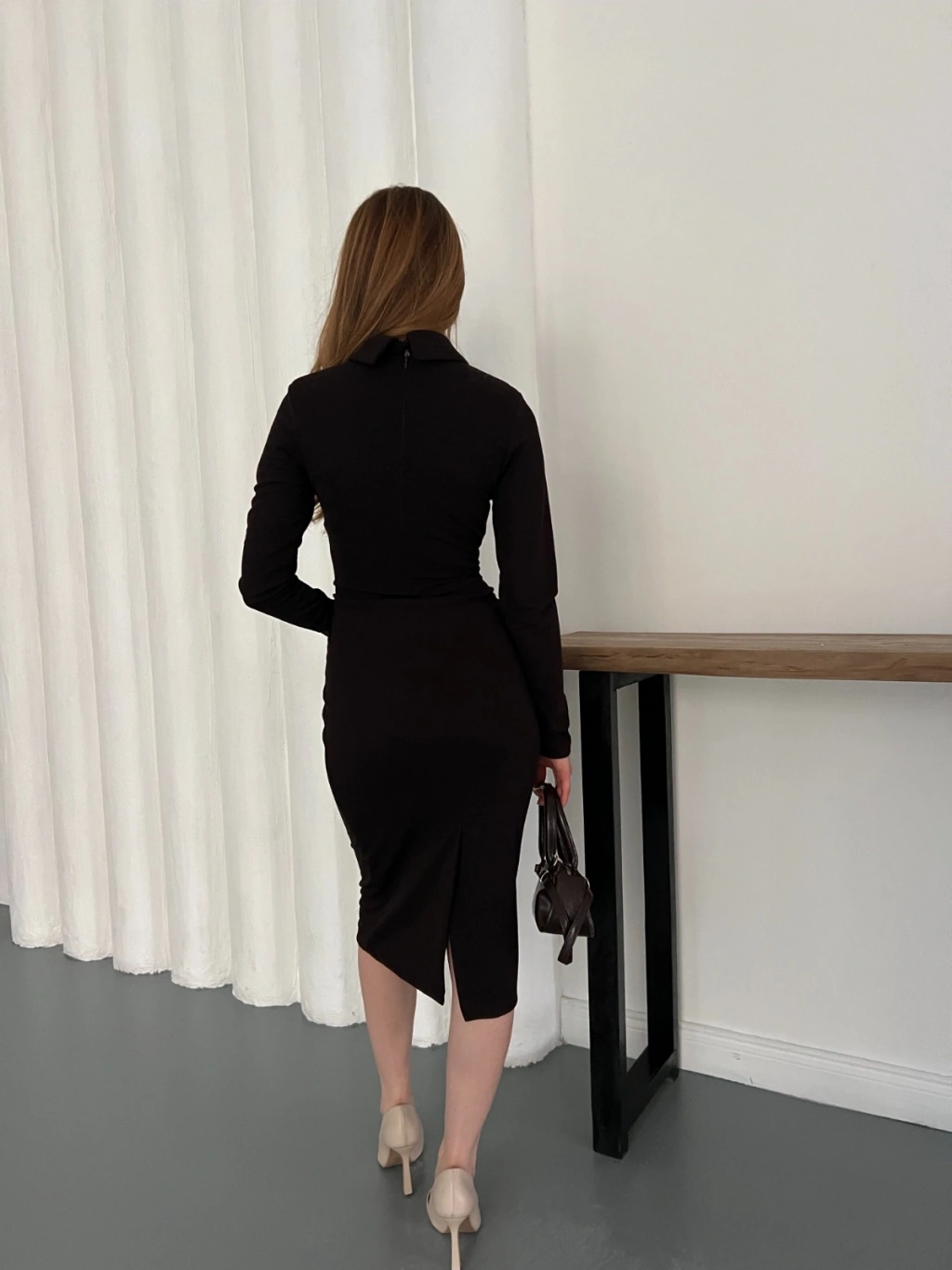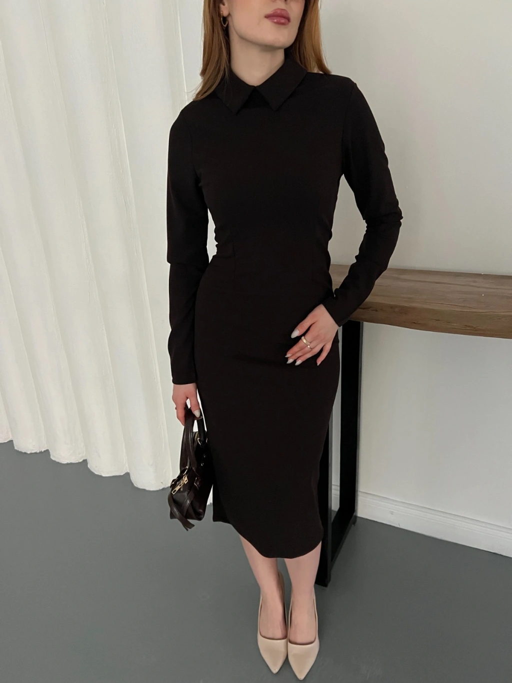 Bebe Yaka Uzun Kol Düğme Detaylı Elbise Kahve
