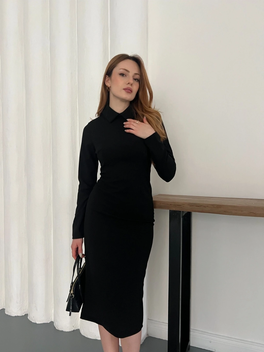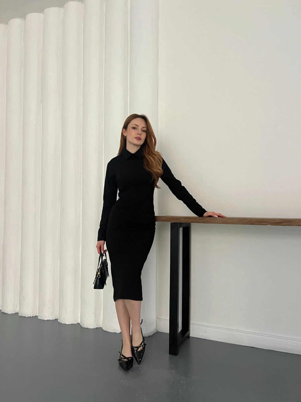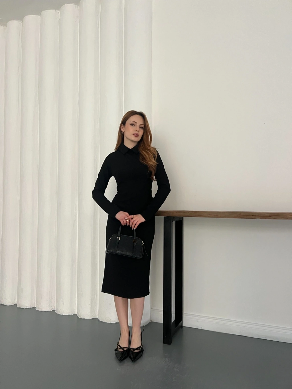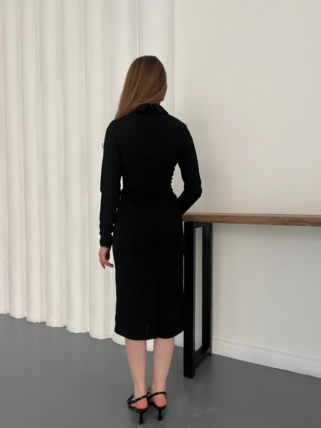 Bebe Yaka Uzun Kol Düğme Detaylı Elbise Siyah