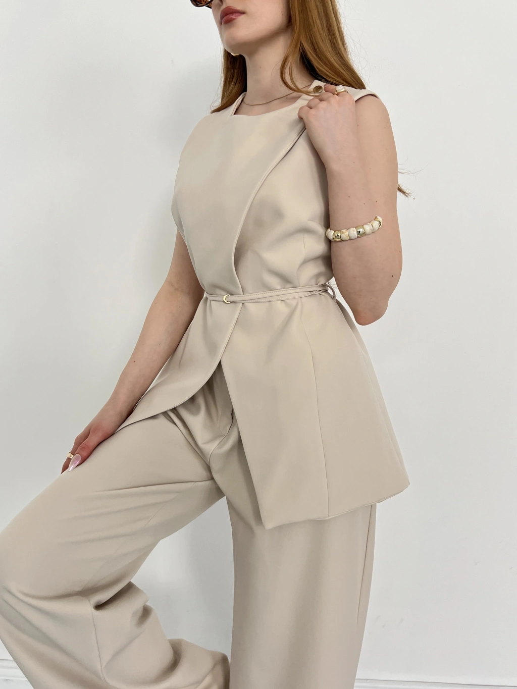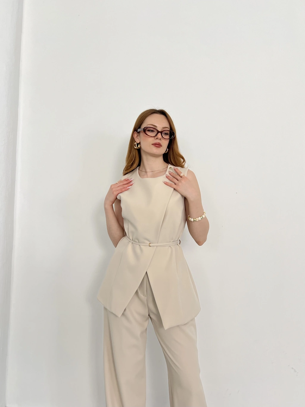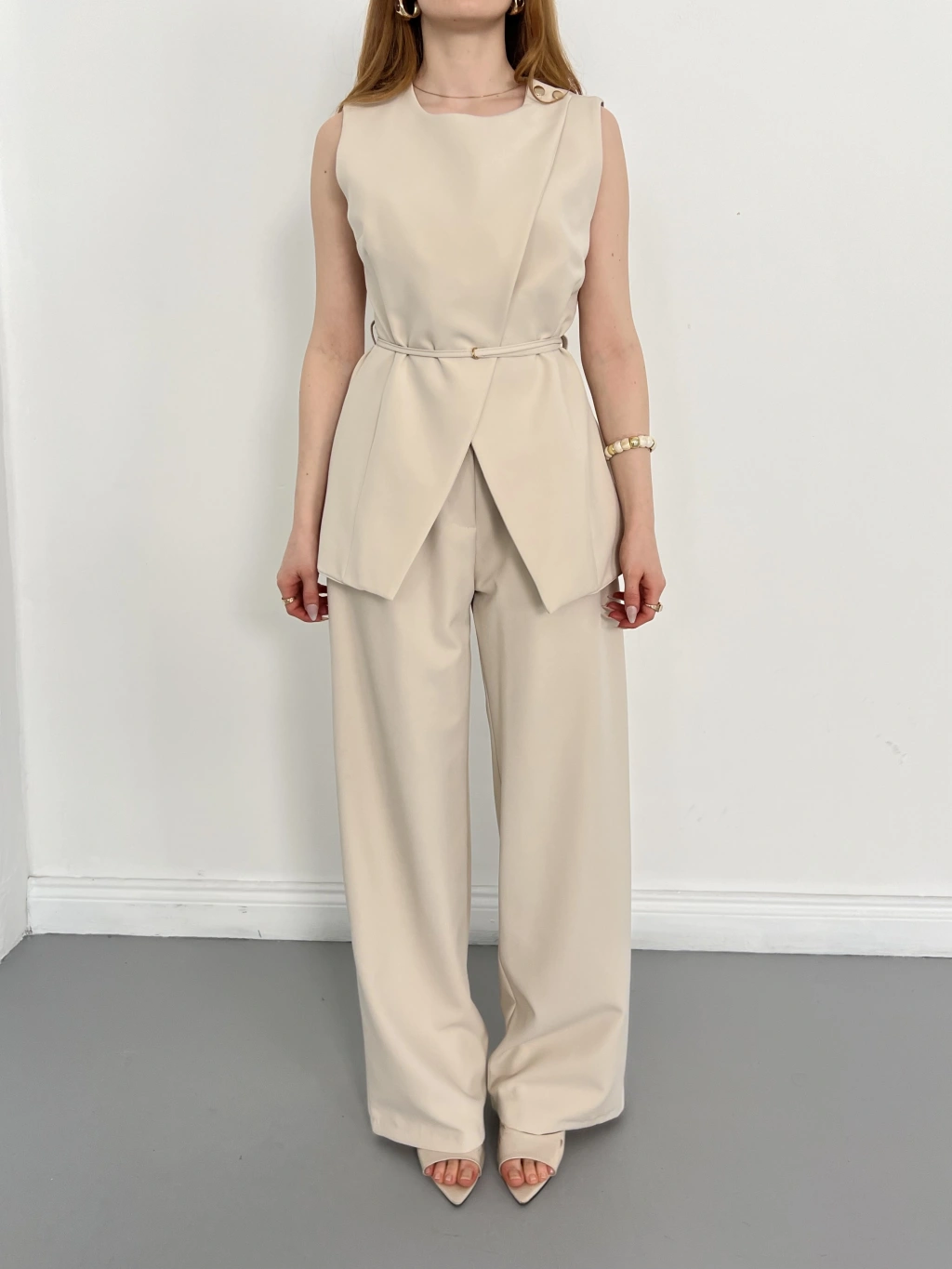 Bel Kemerli Asimetrik Kesim Yelekli Takım Bej