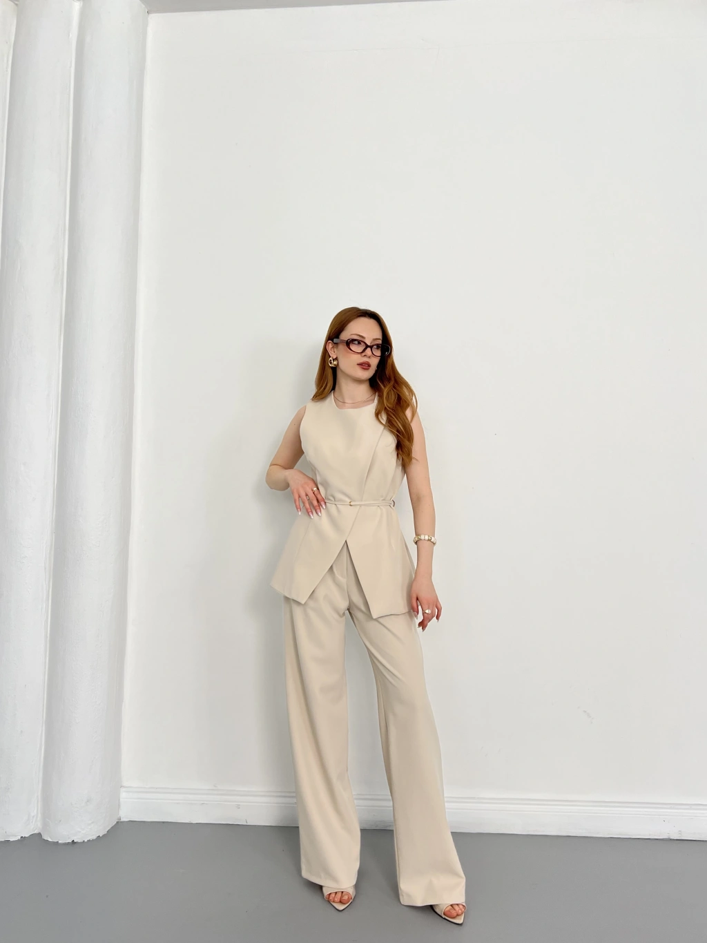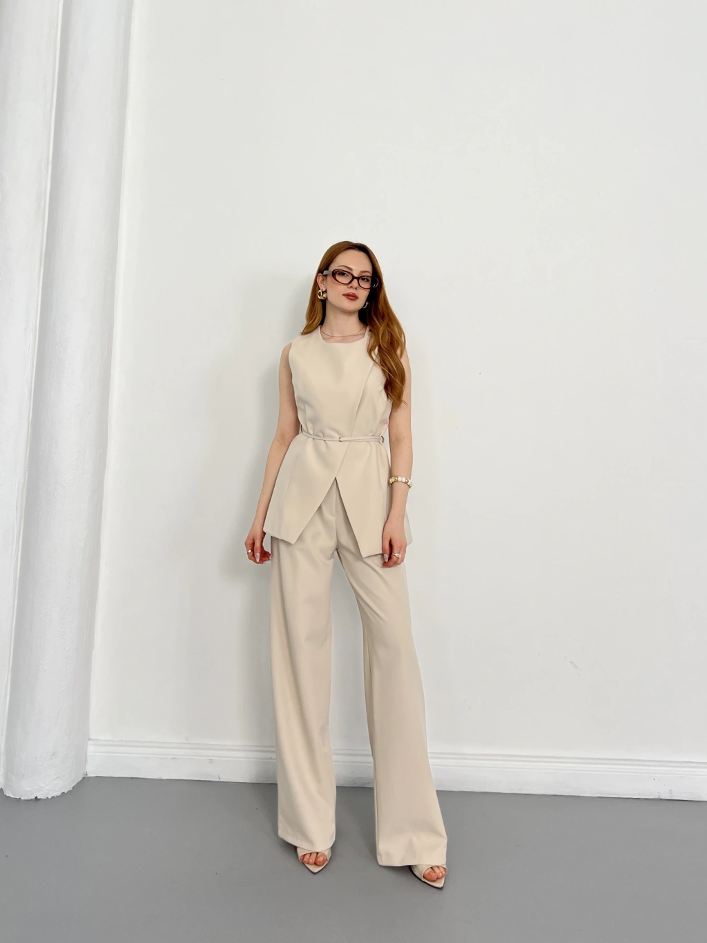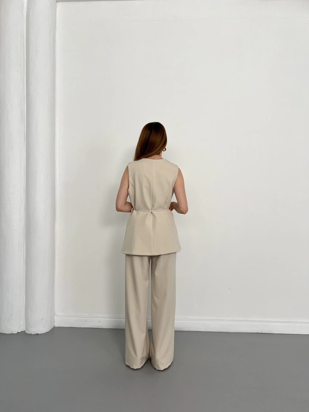 Bel Kemerli Asimetrik Kesim Yelekli Takım Bej