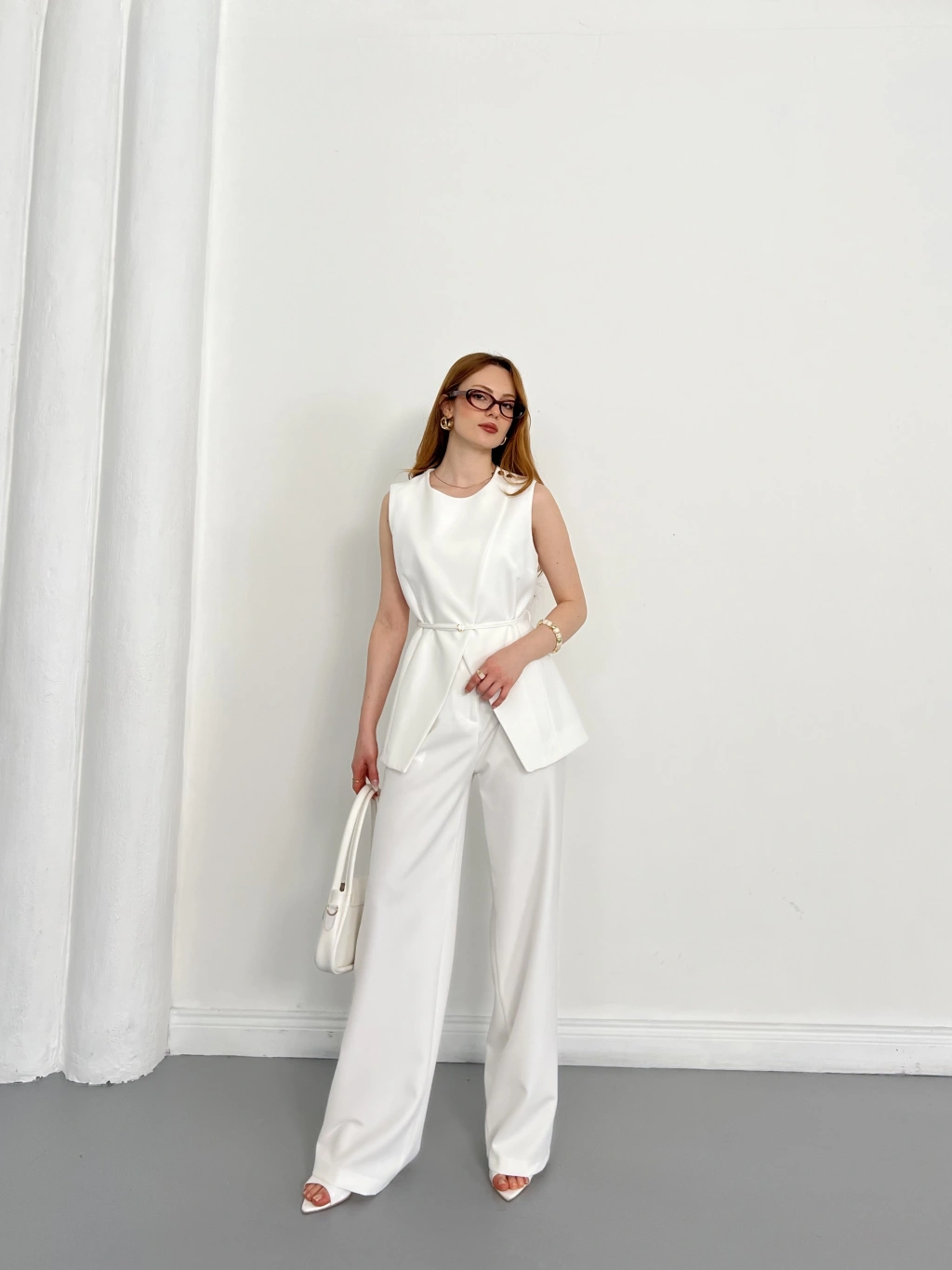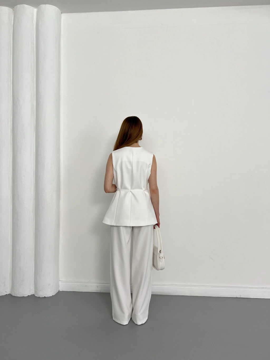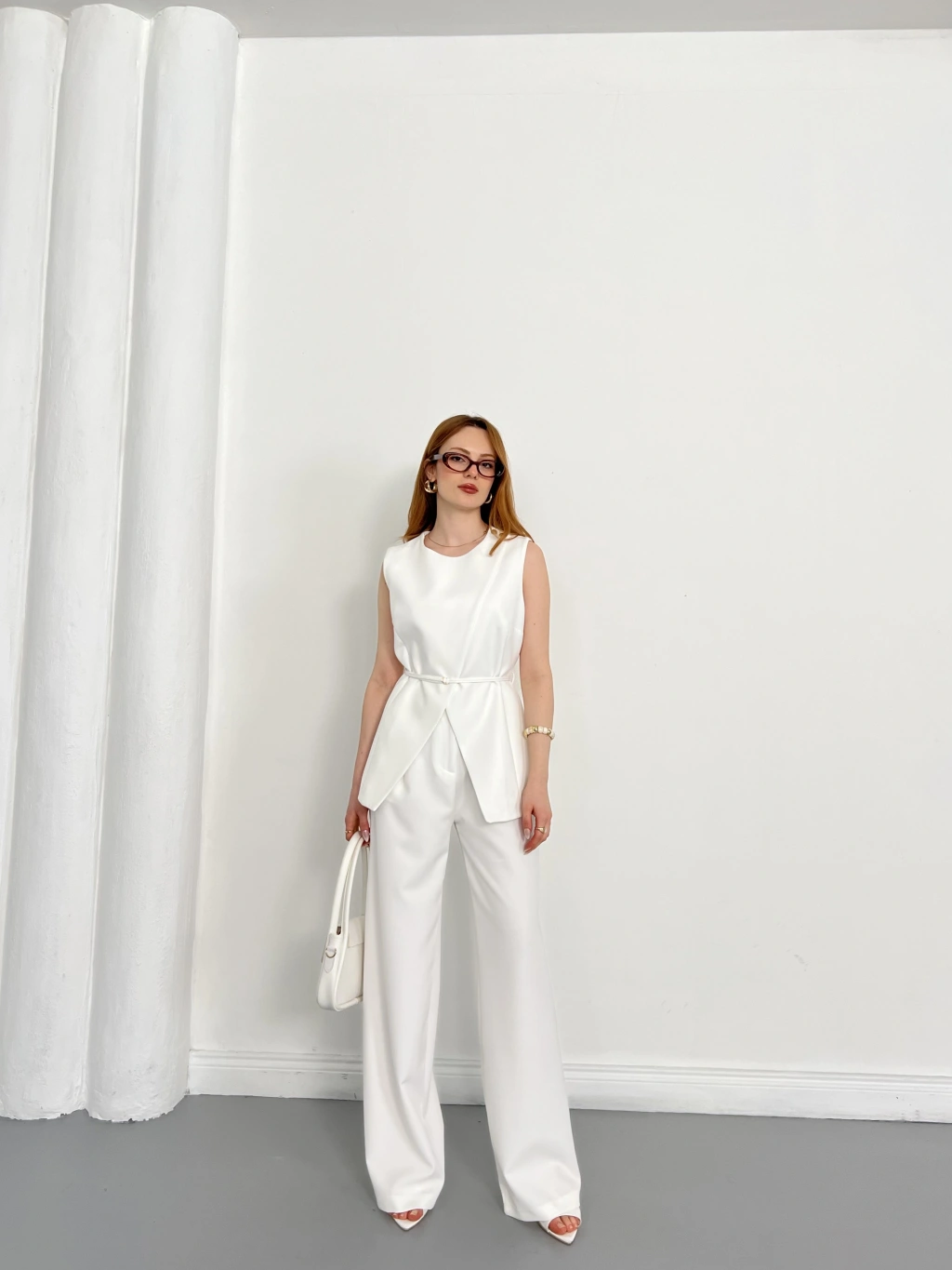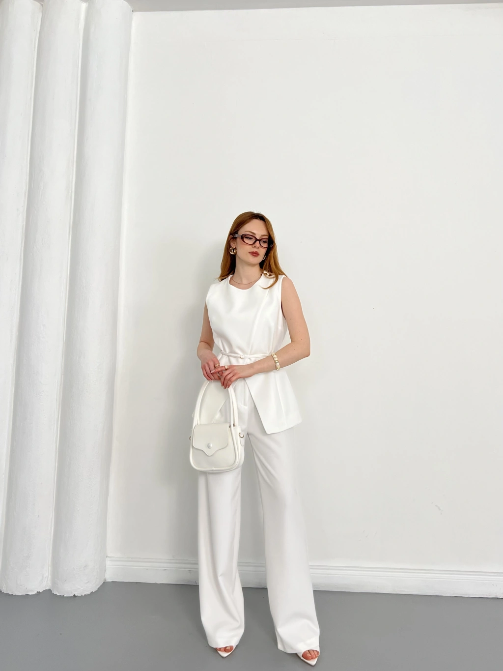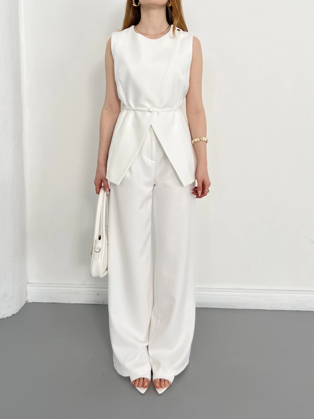Bel Kemerli Asimetrik Kesim Yelekli Takım Beyaz