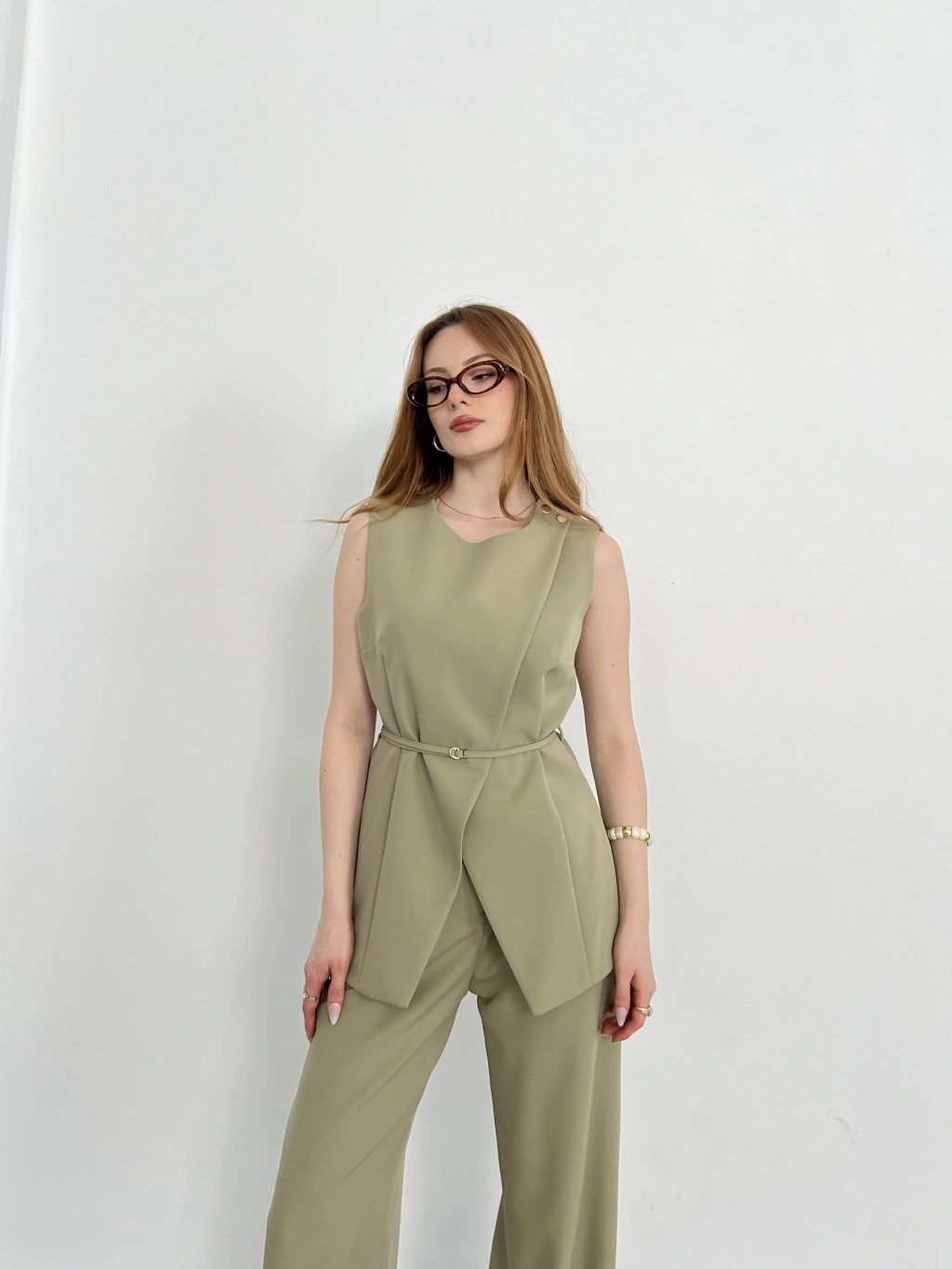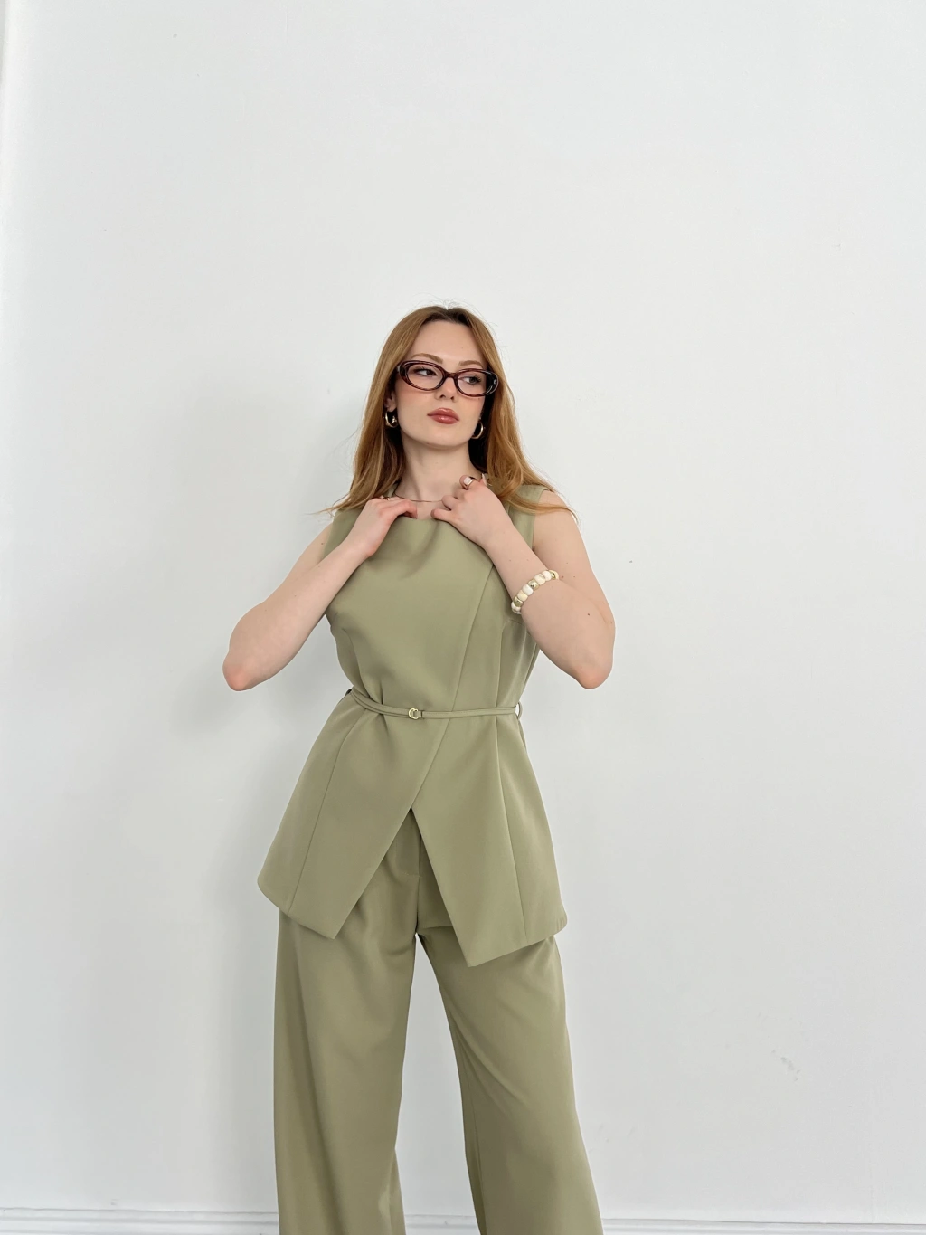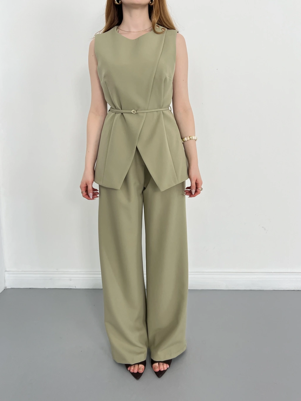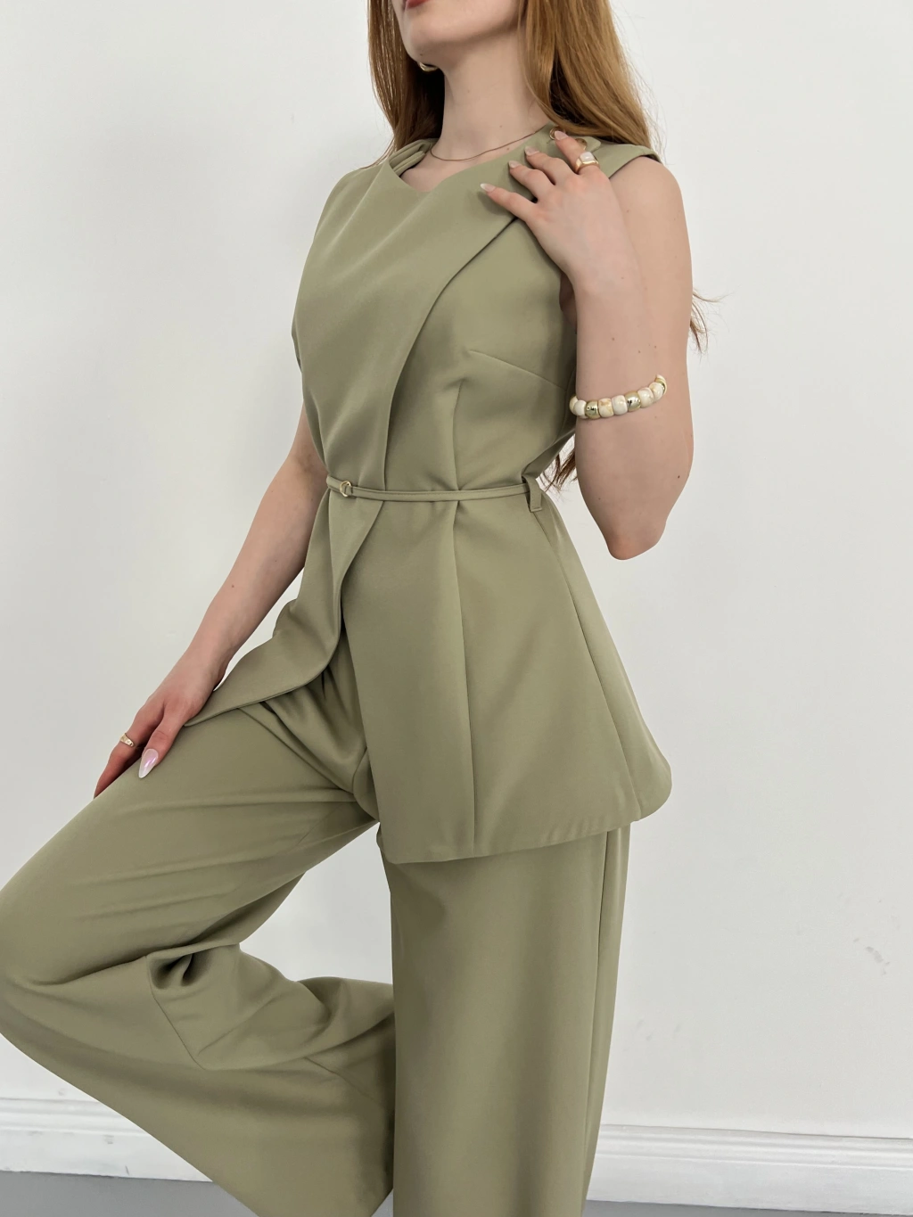 Bel Kemerli Asimetrik Kesim Yelekli Takım Haki