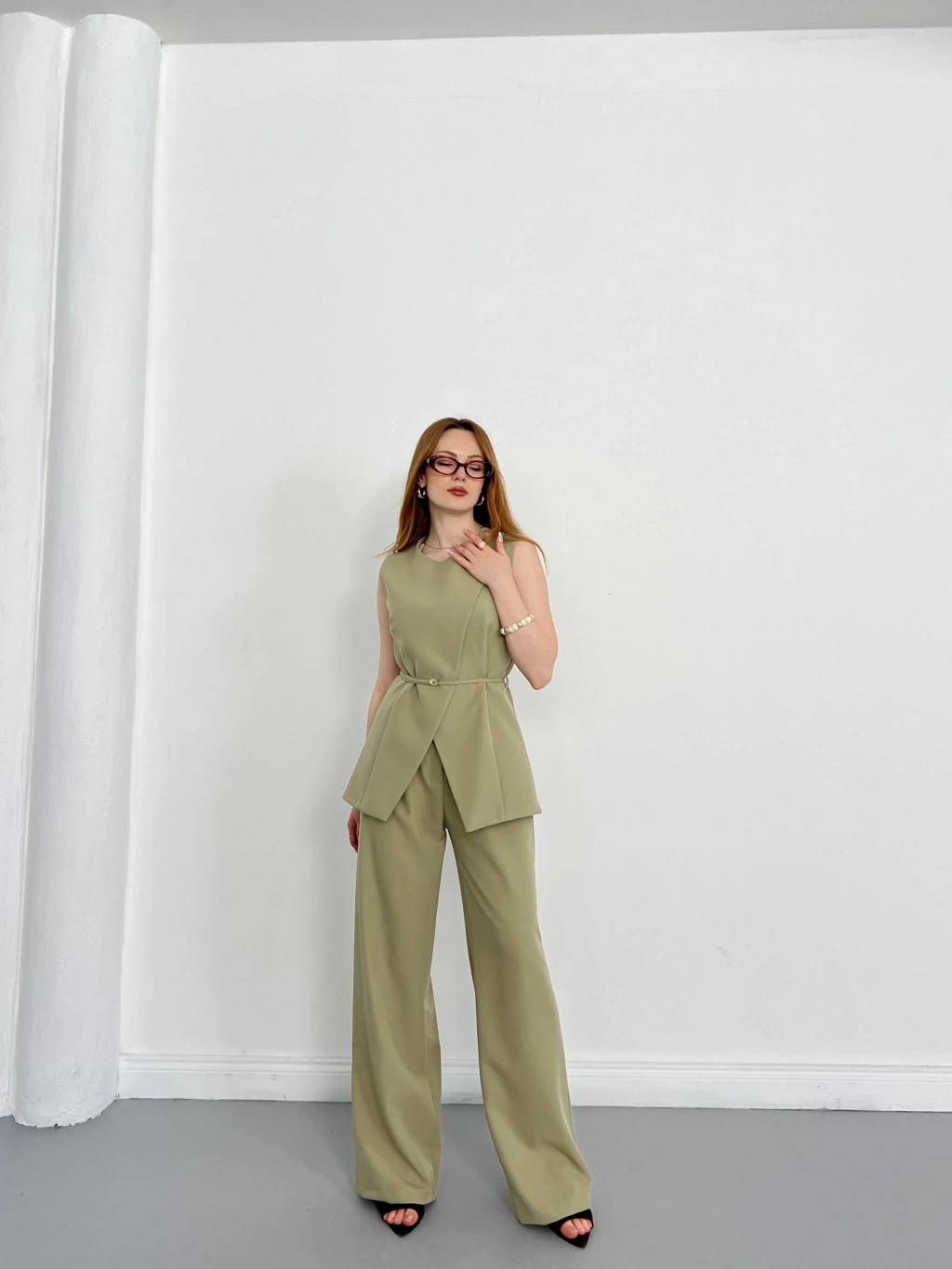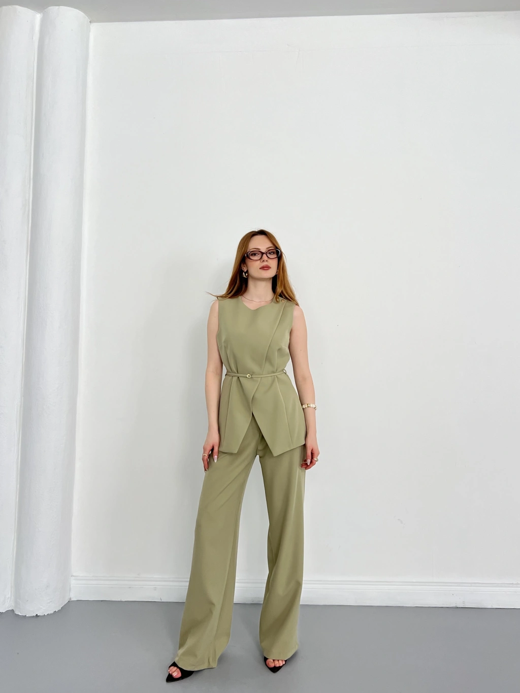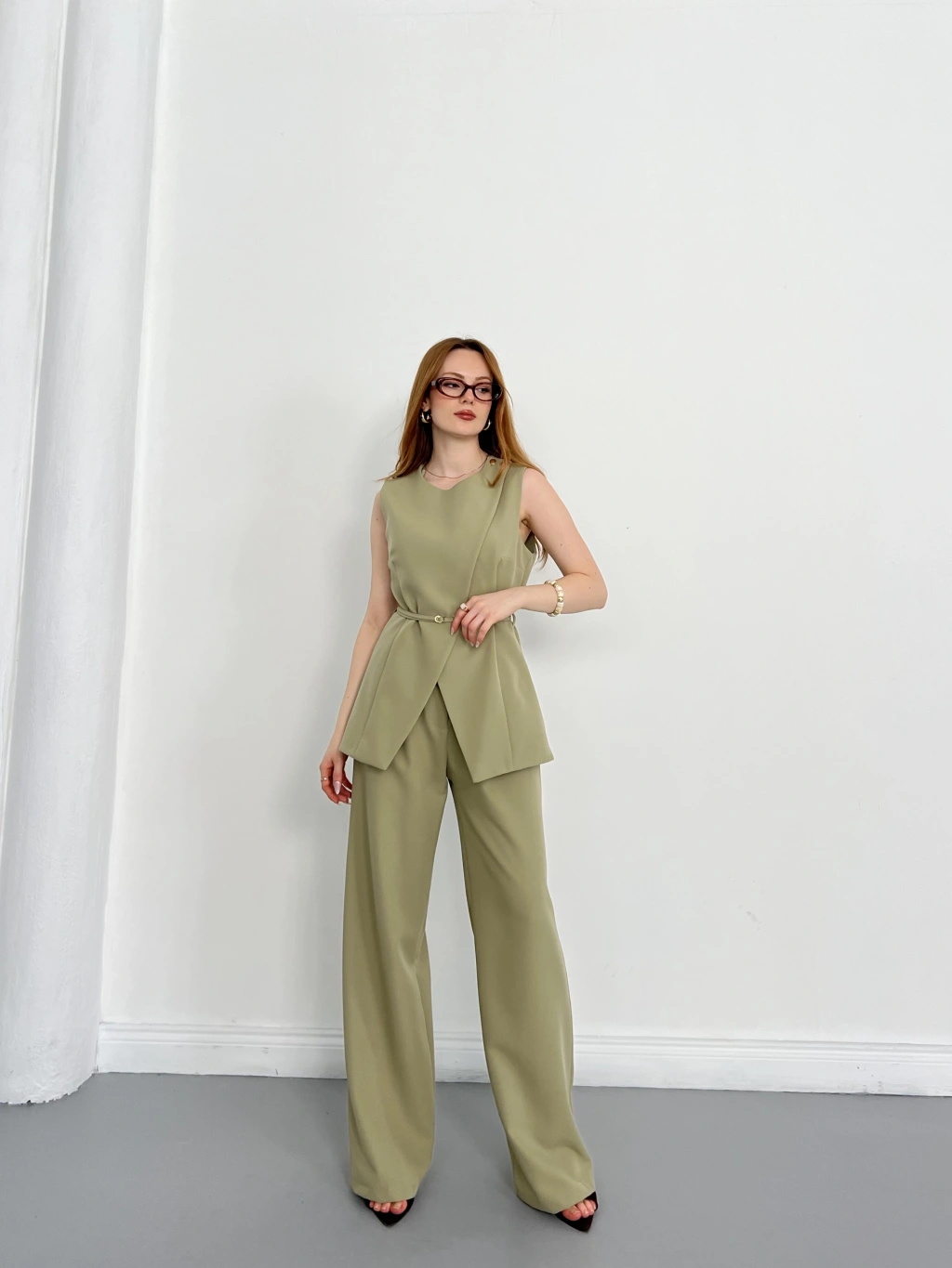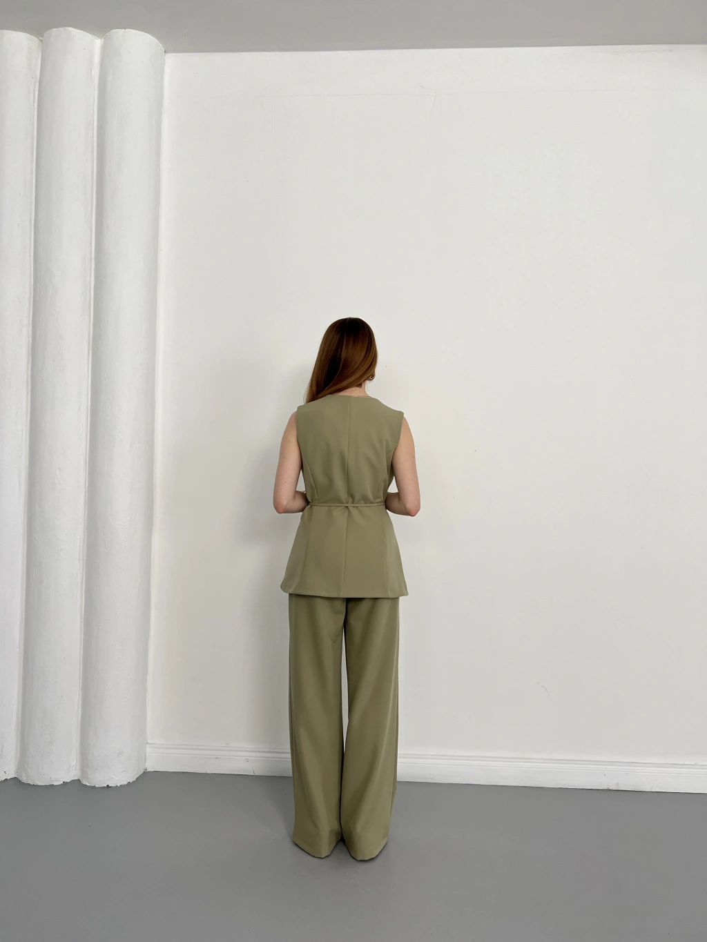 Bel Kemerli Asimetrik Kesim Yelekli Takım Haki