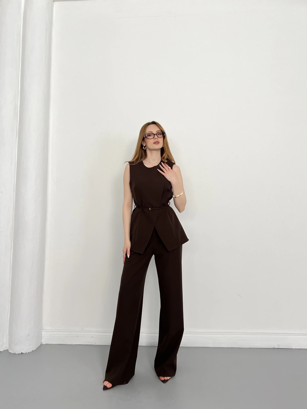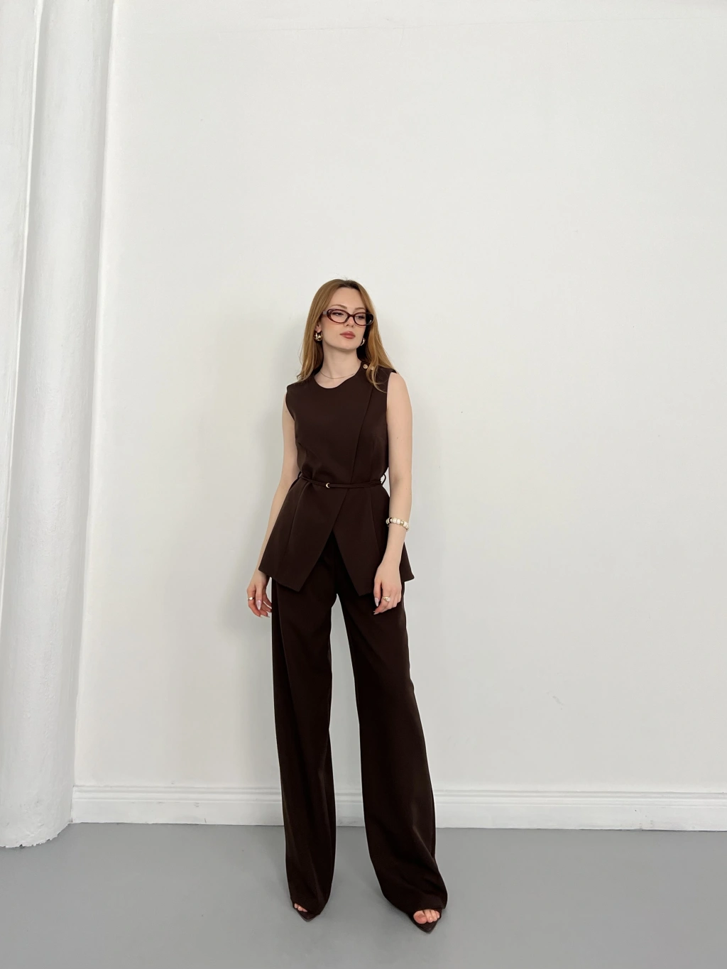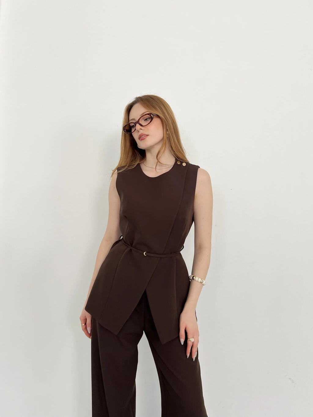 Bel Kemerli Asimetrik Kesim Yelekli Takım Kahve