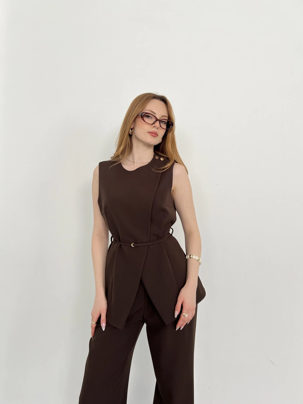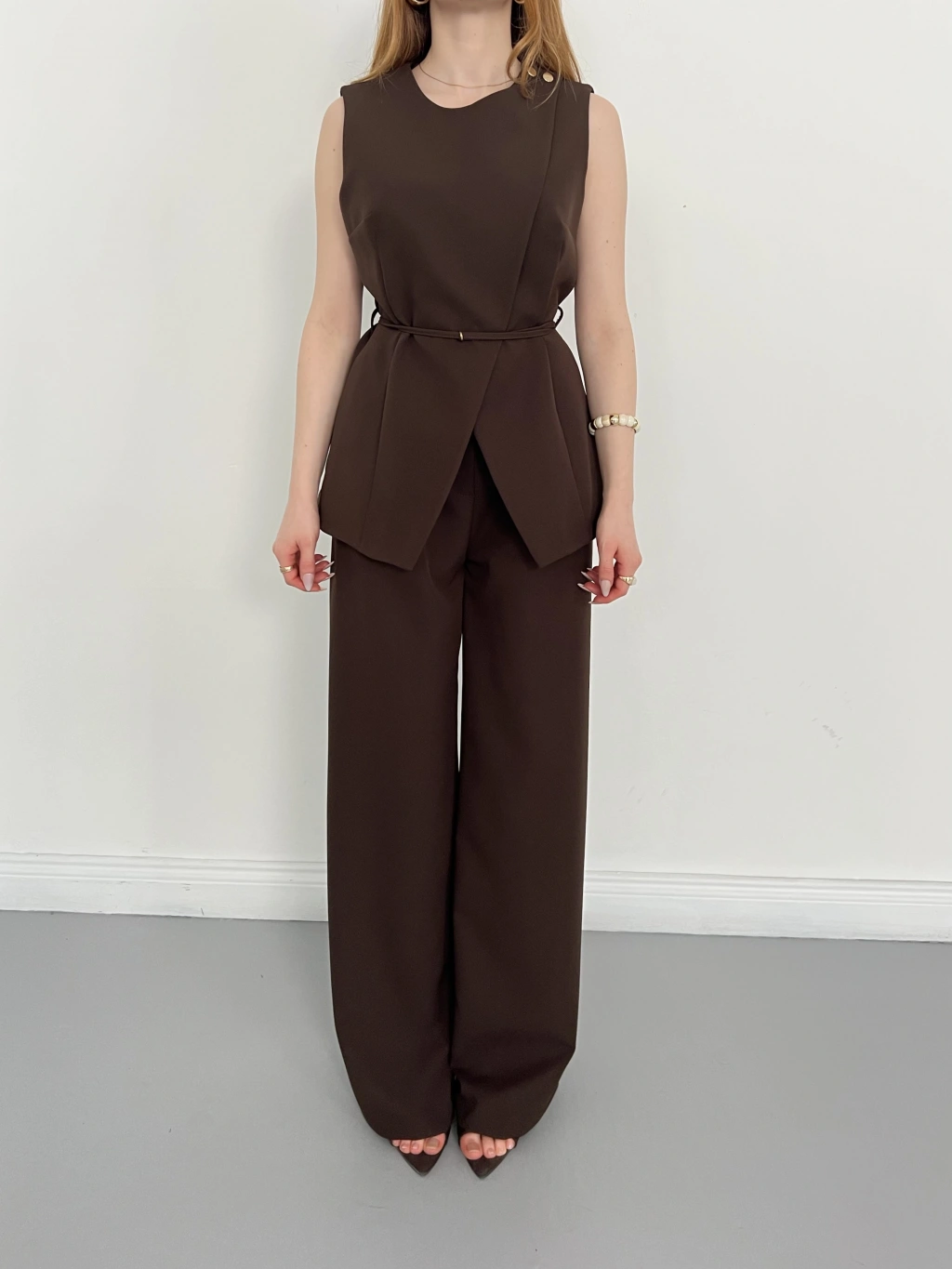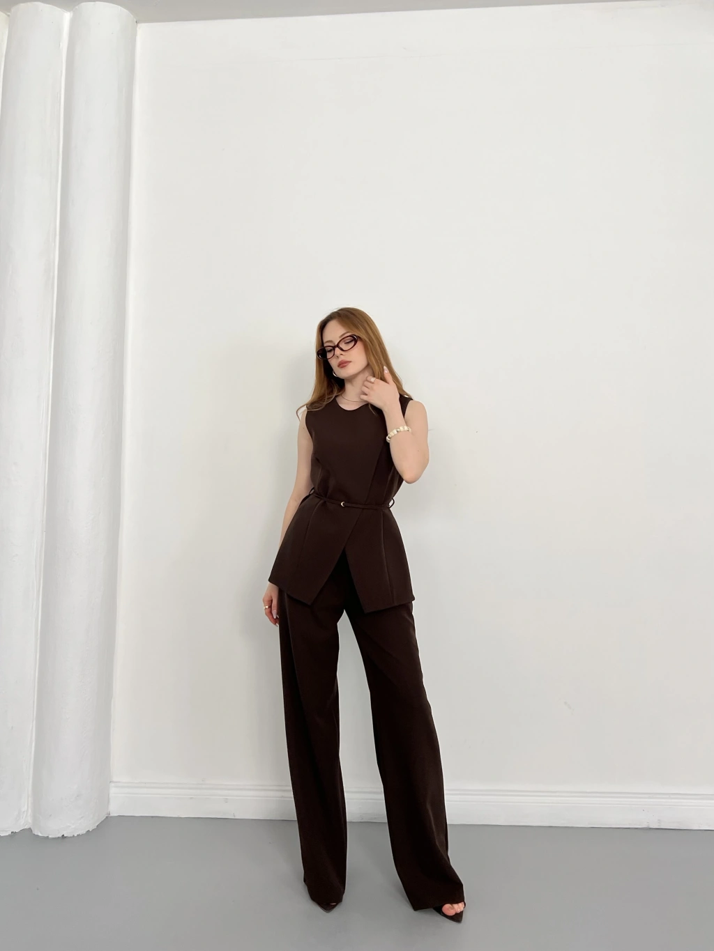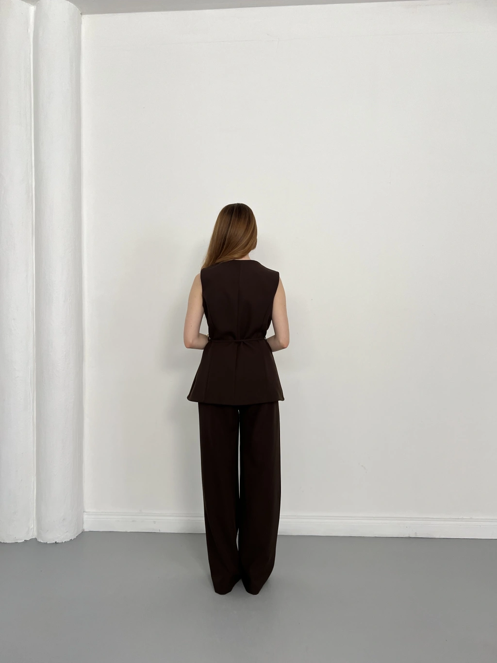Bel Kemerli Asimetrik Kesim Yelekli Takım Kahve
