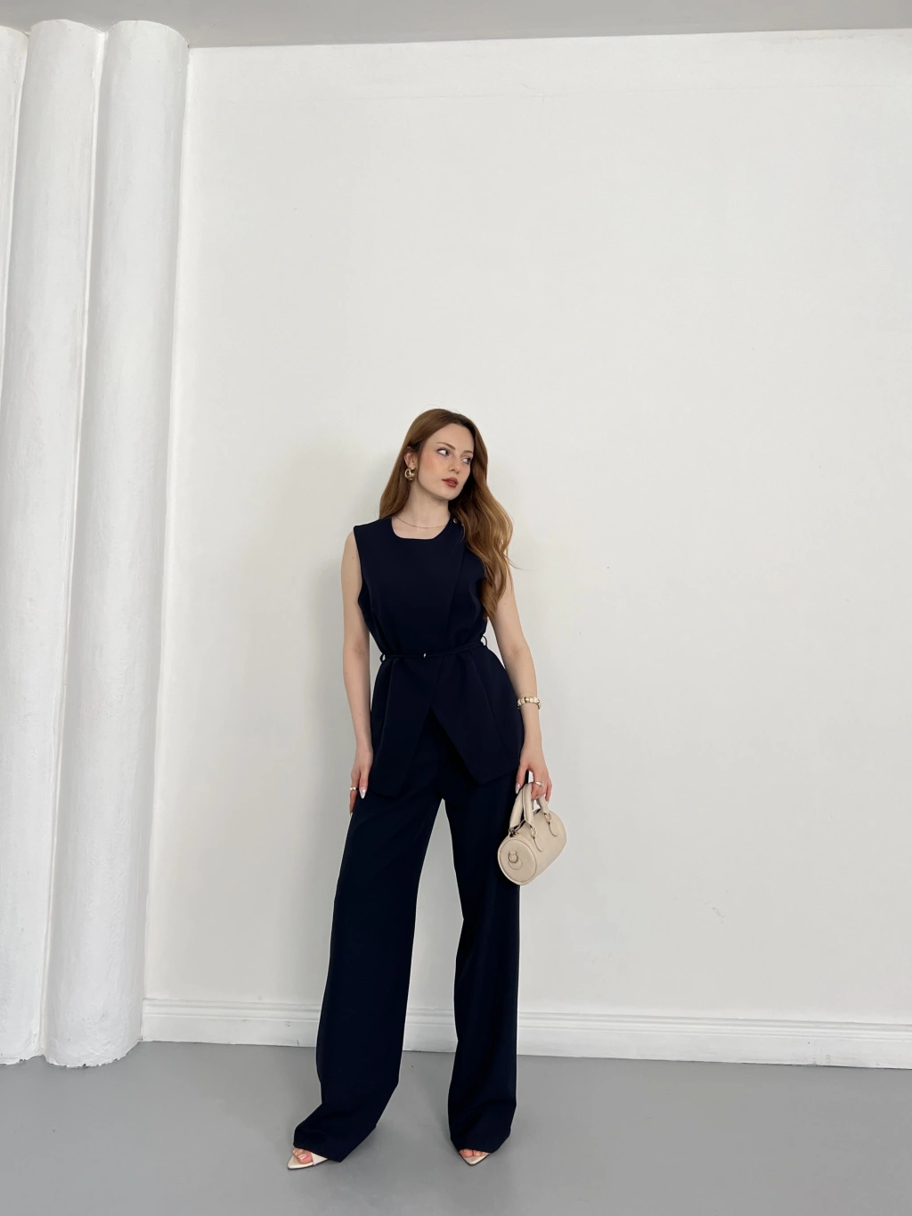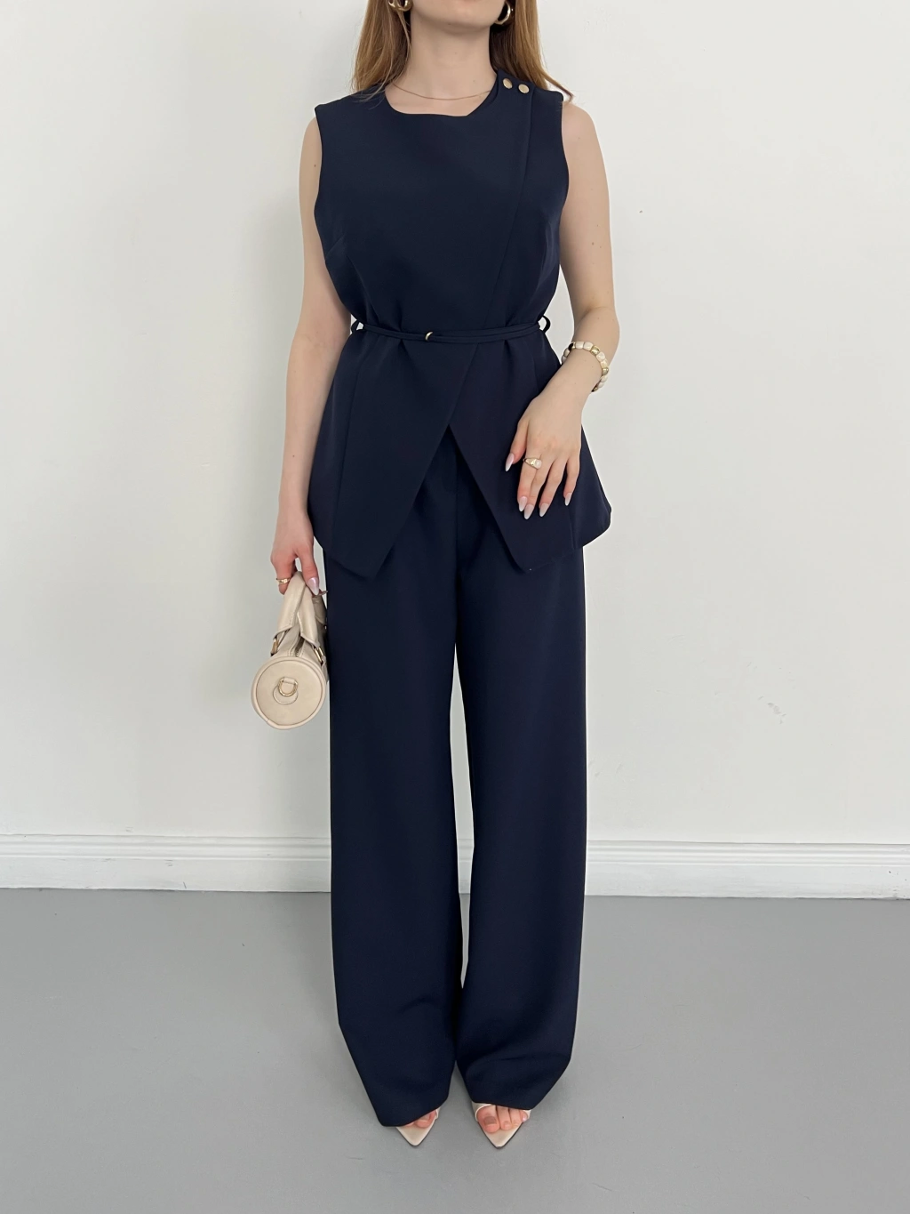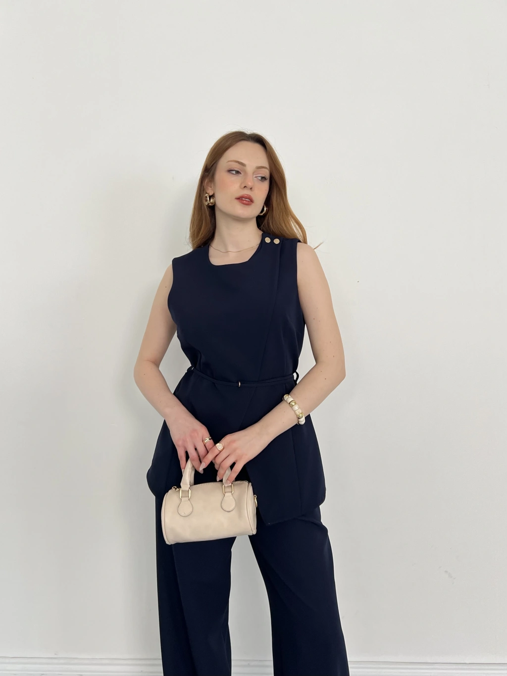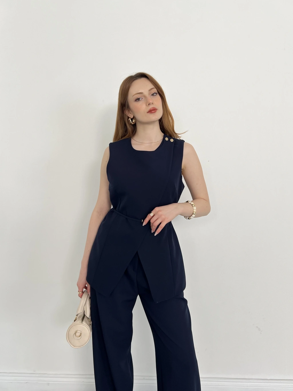 Bel Kemerli Asimetrik Kesim Yelekli Takım Lacivert