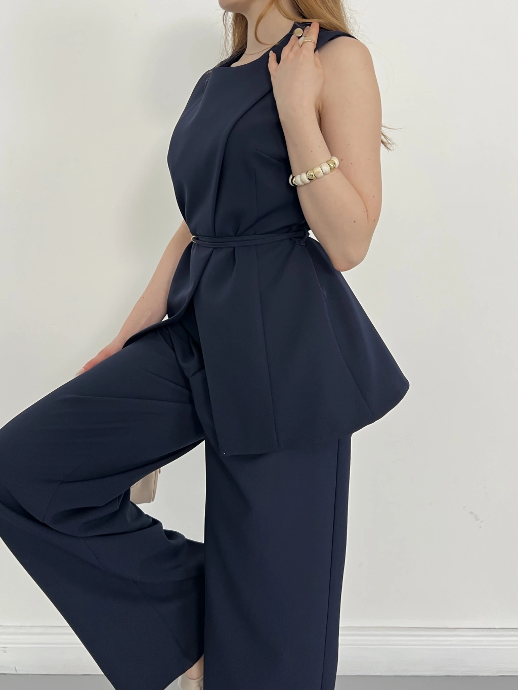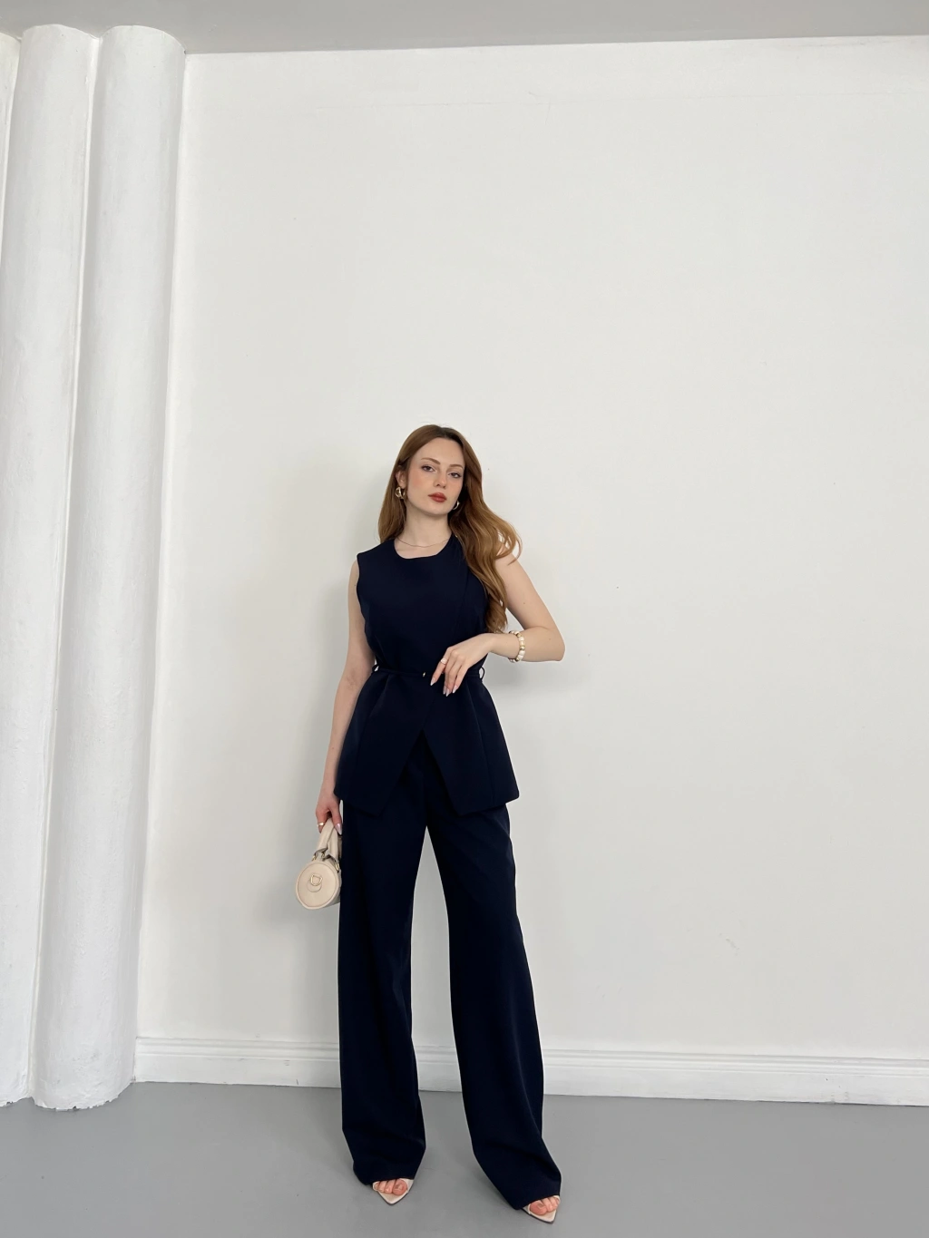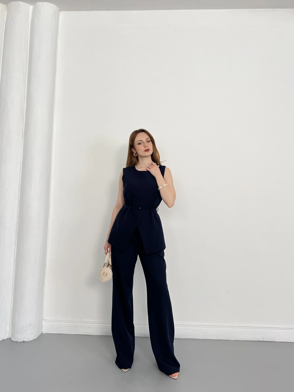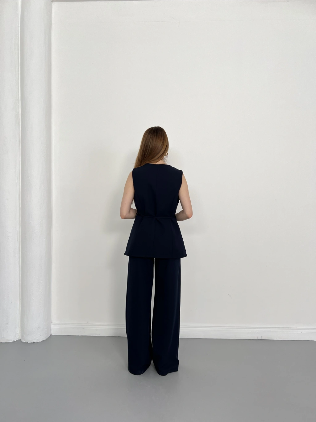 Bel Kemerli Asimetrik Kesim Yelekli Takım Lacivert