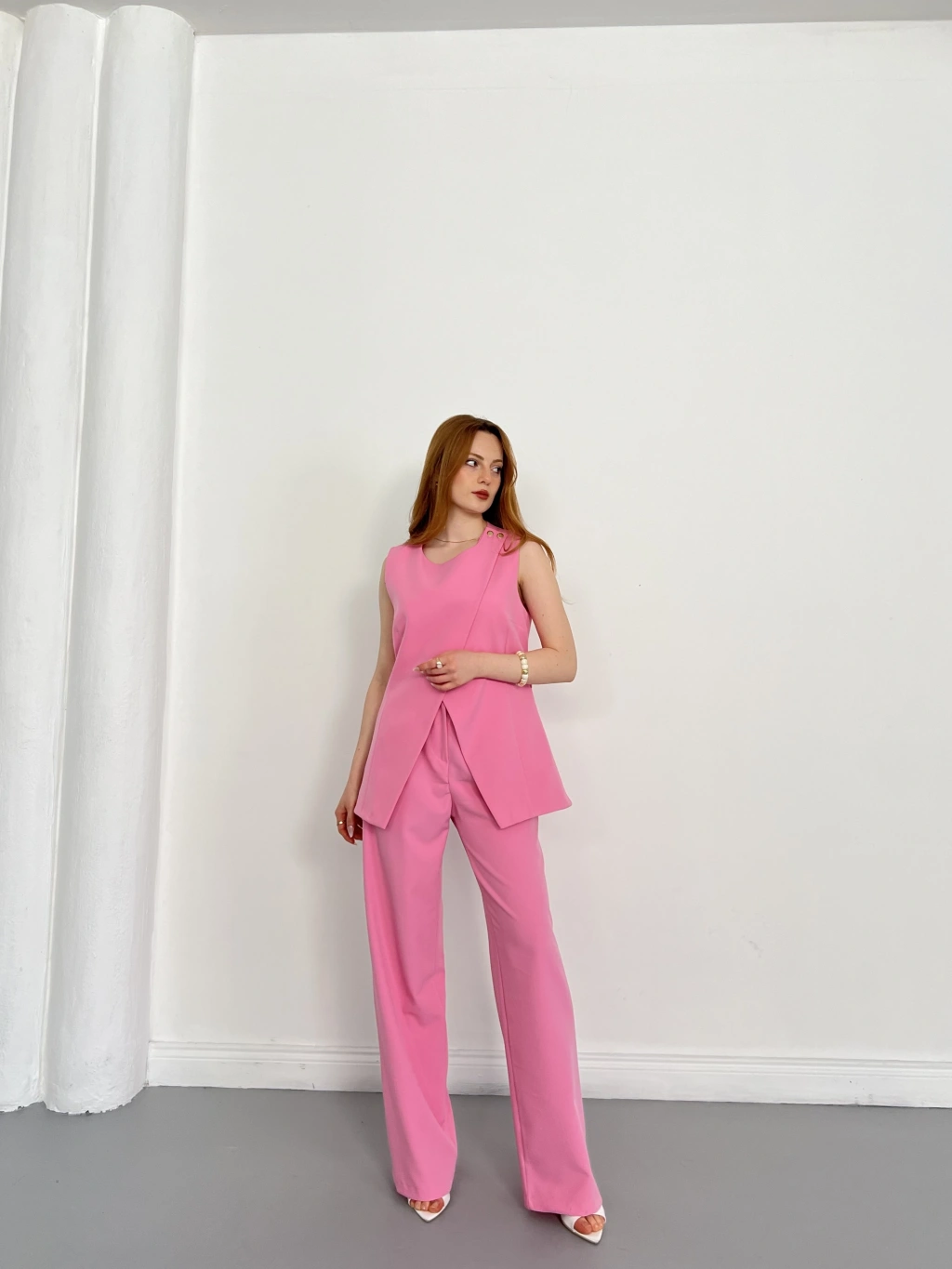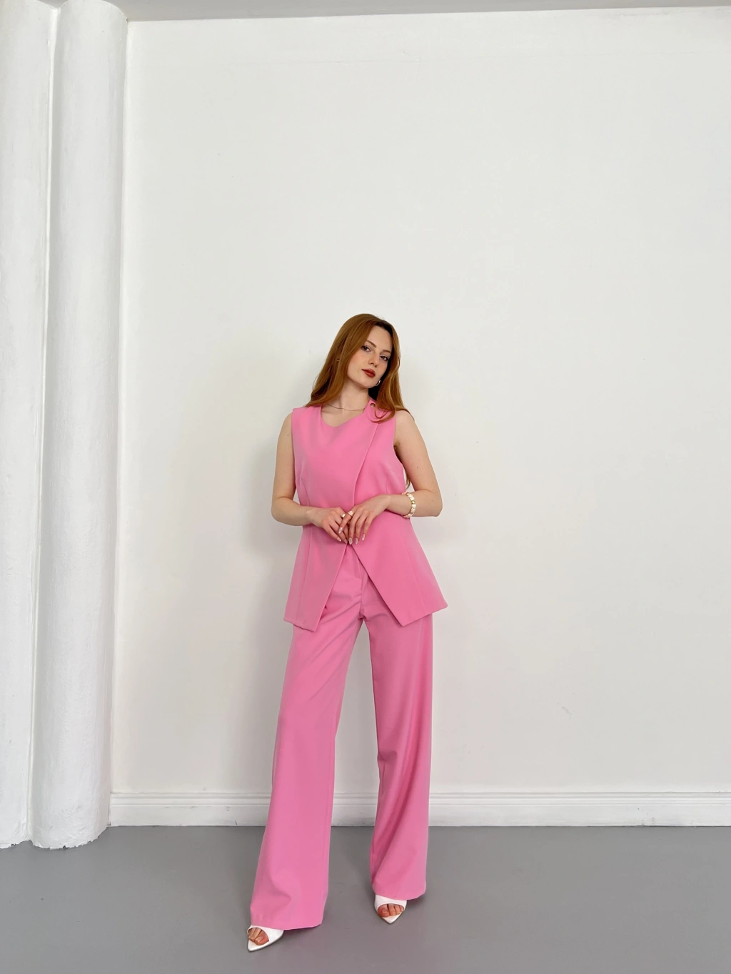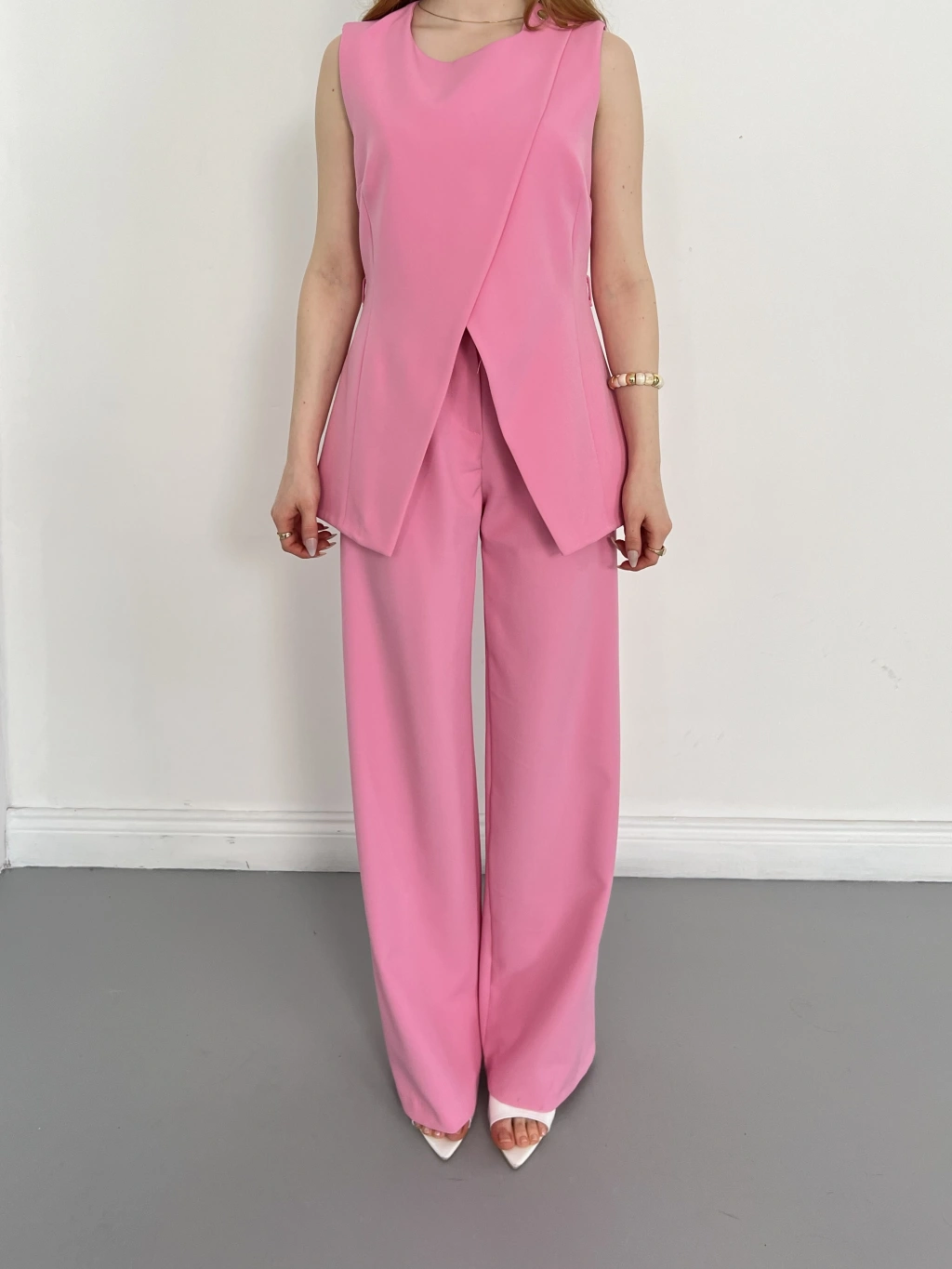 Bel Kemerli Asimetrik Kesim Yelekli Takım Pembe