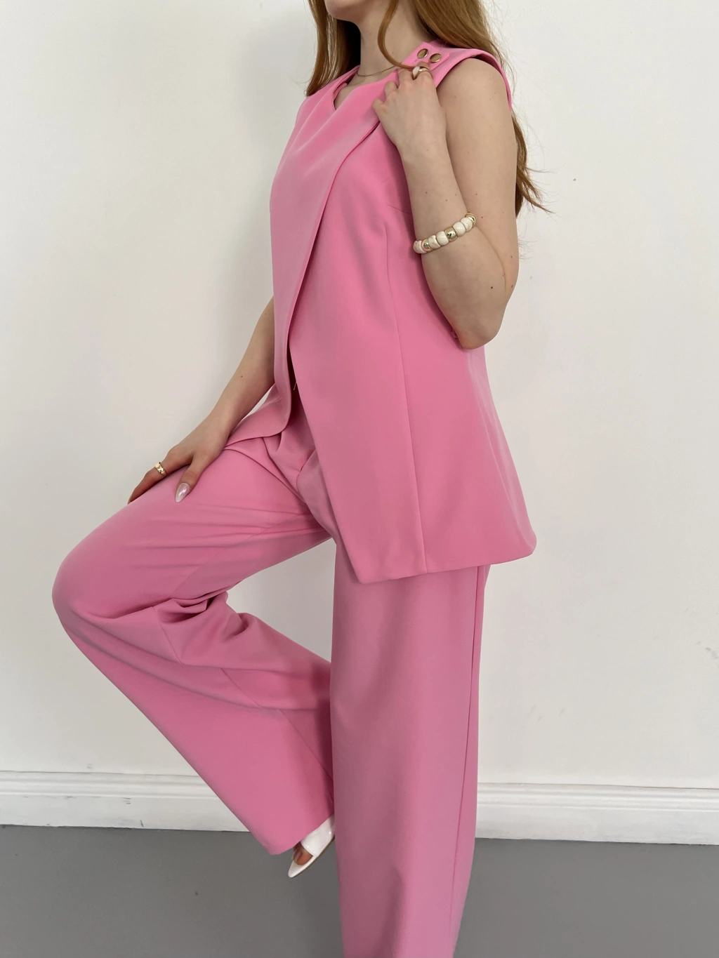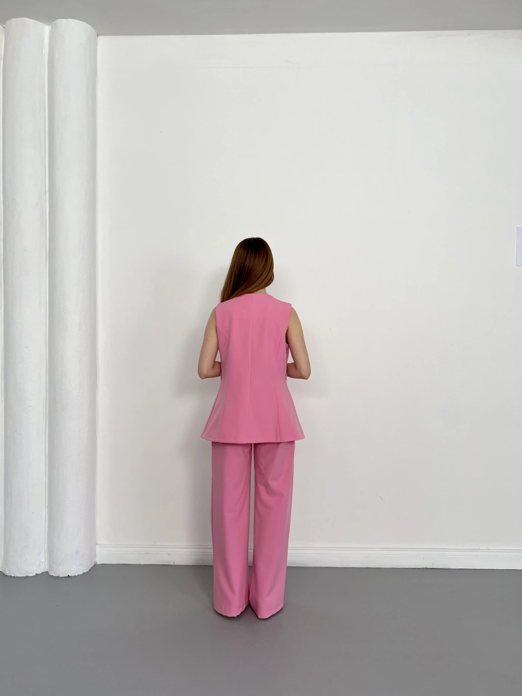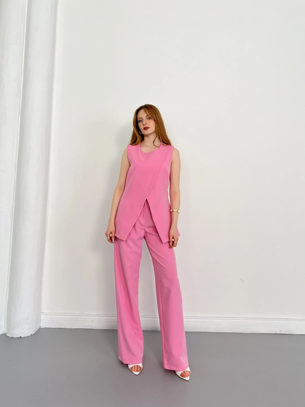 Bel Kemerli Asimetrik Kesim Yelekli Takım Pembe