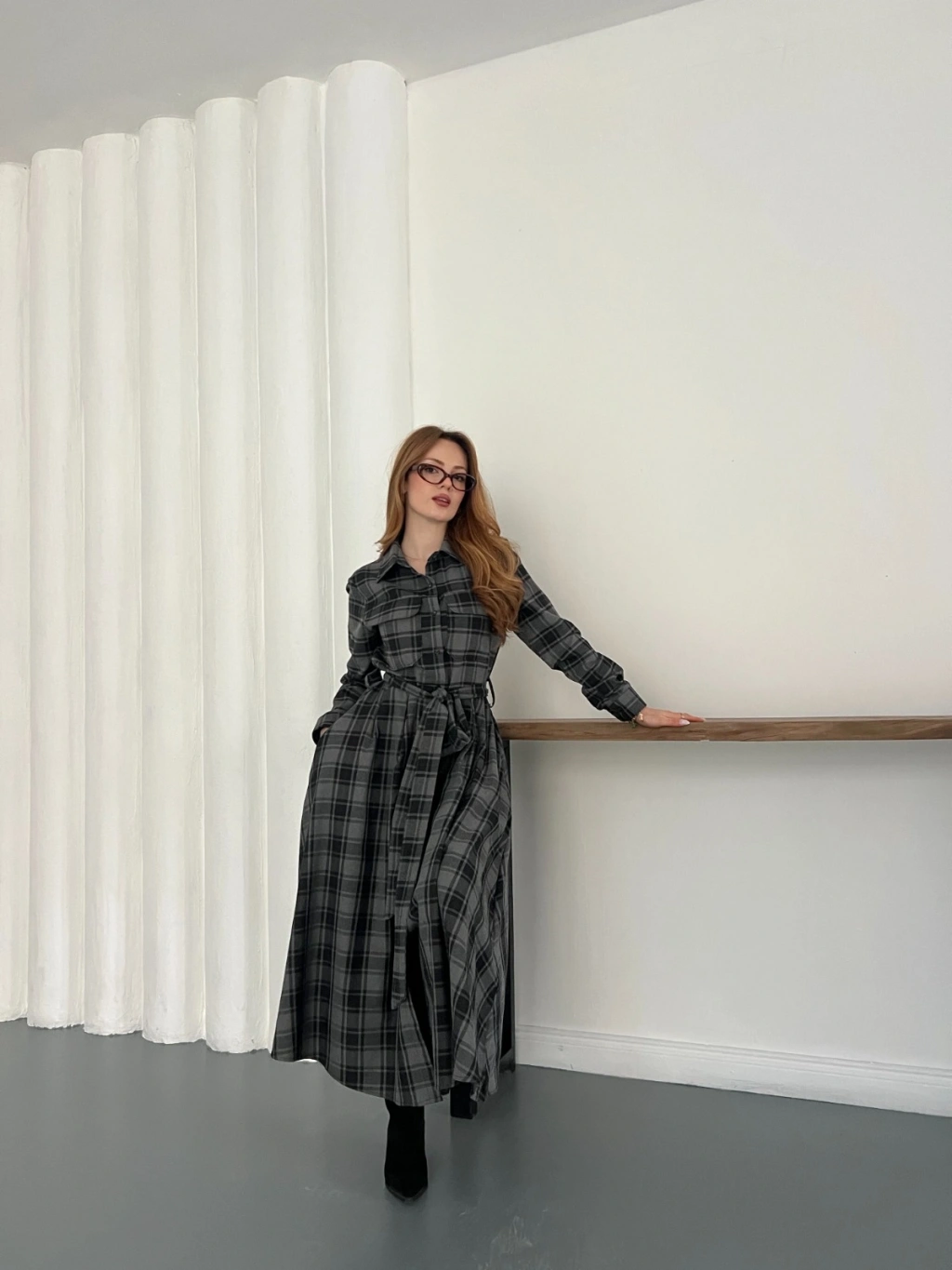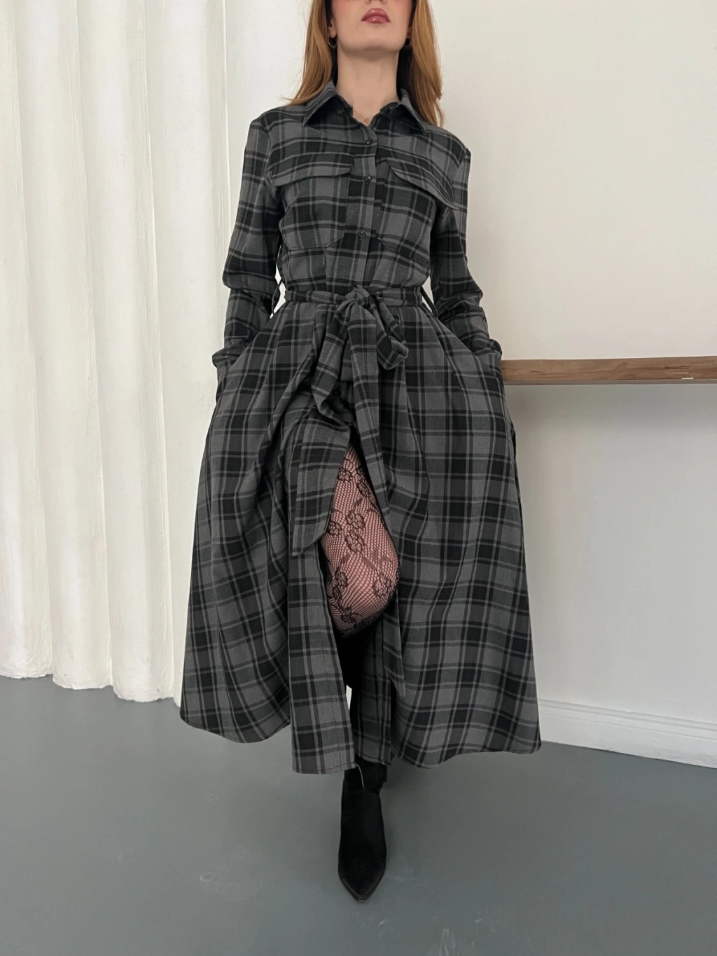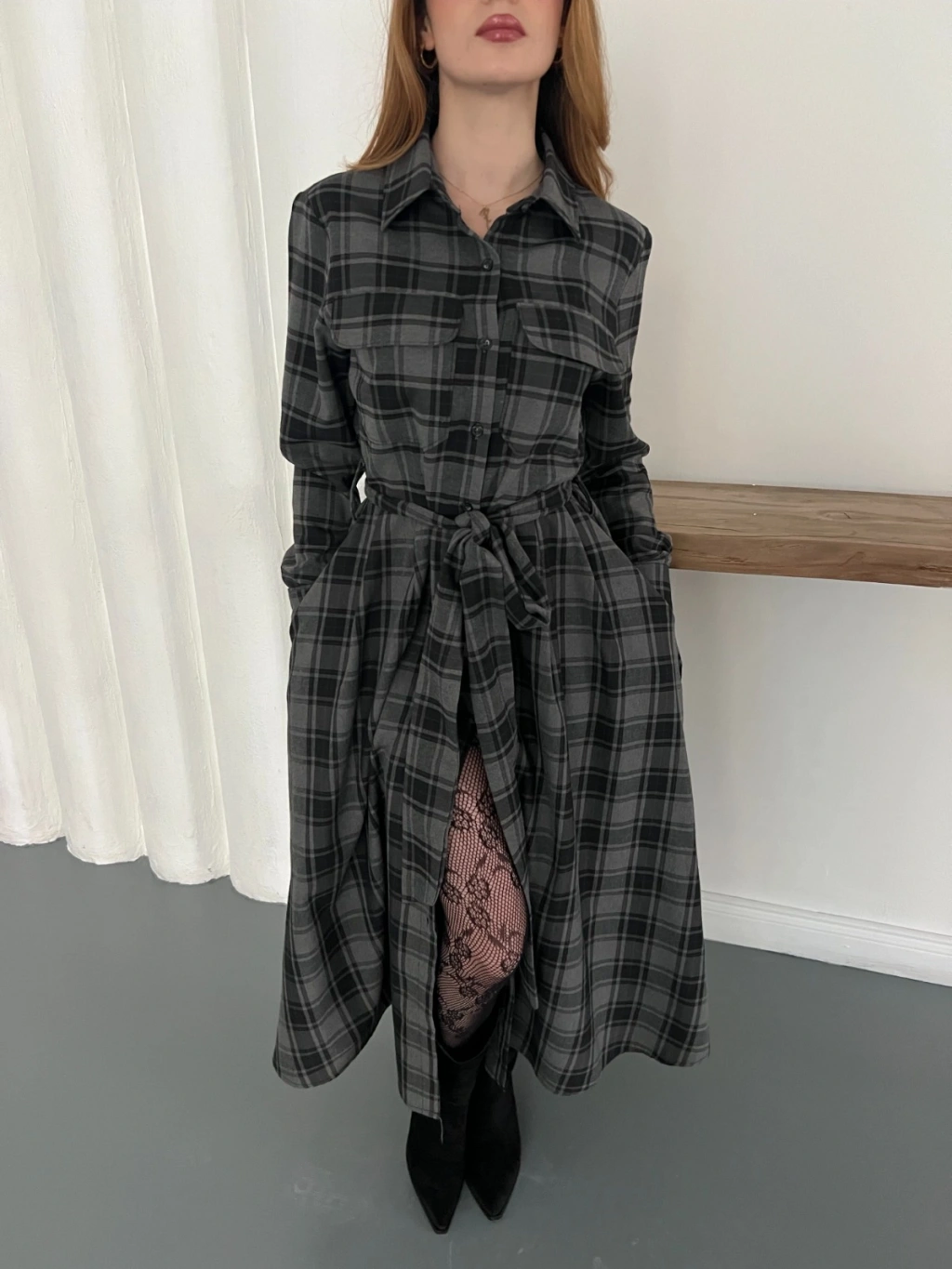 Bel Kuşaklı Ekose Uzun Gömlek Elbise