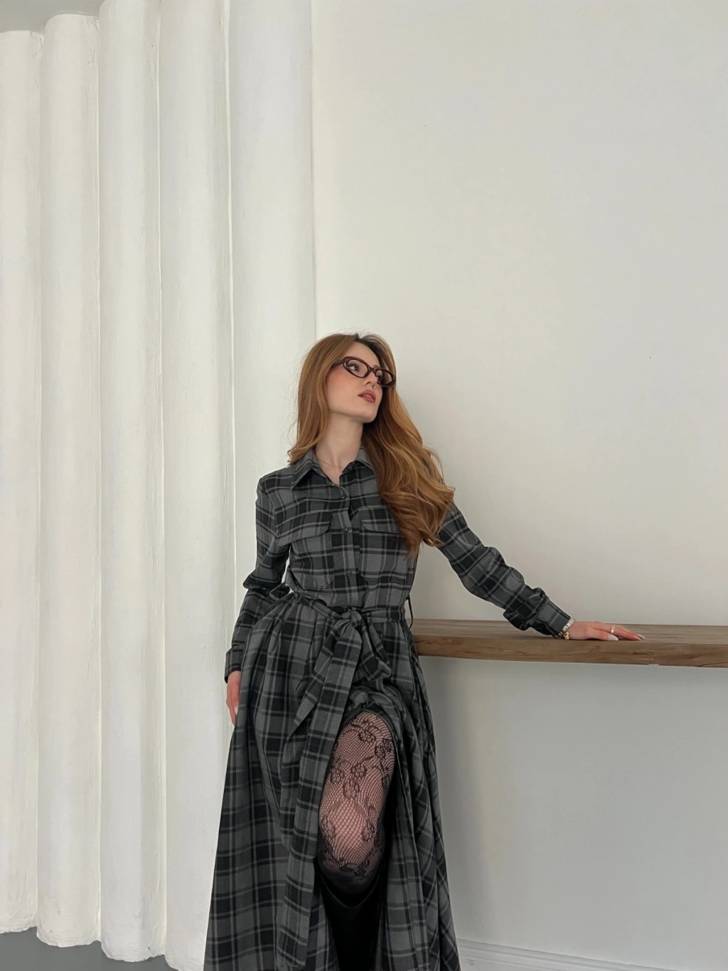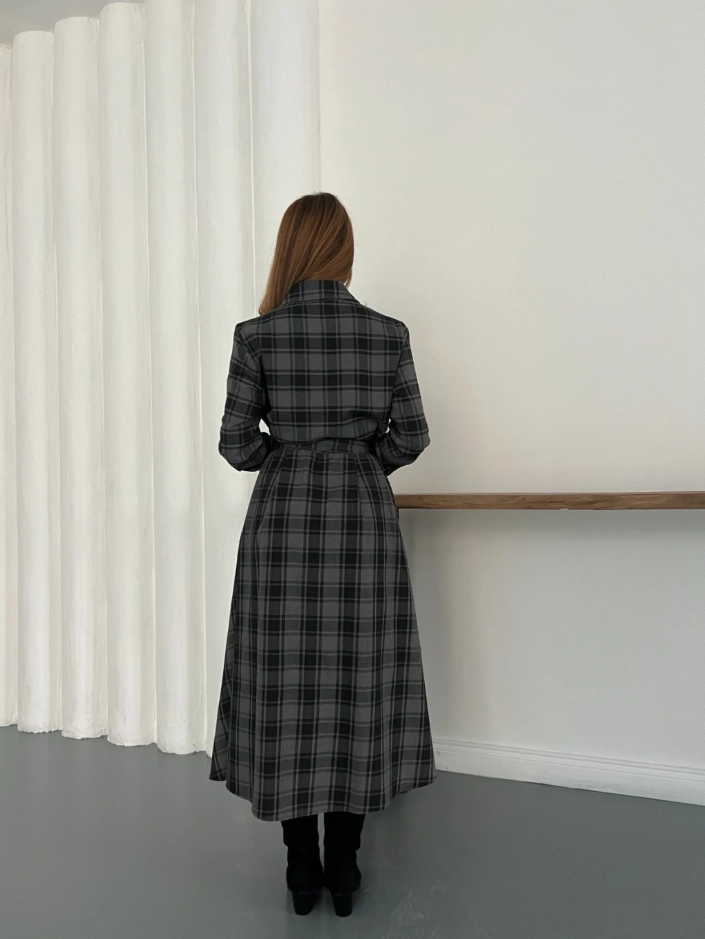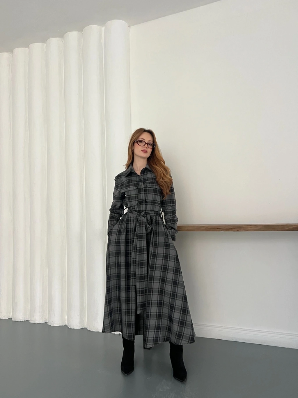 Bel Kuşaklı Ekose Uzun Gömlek Elbise