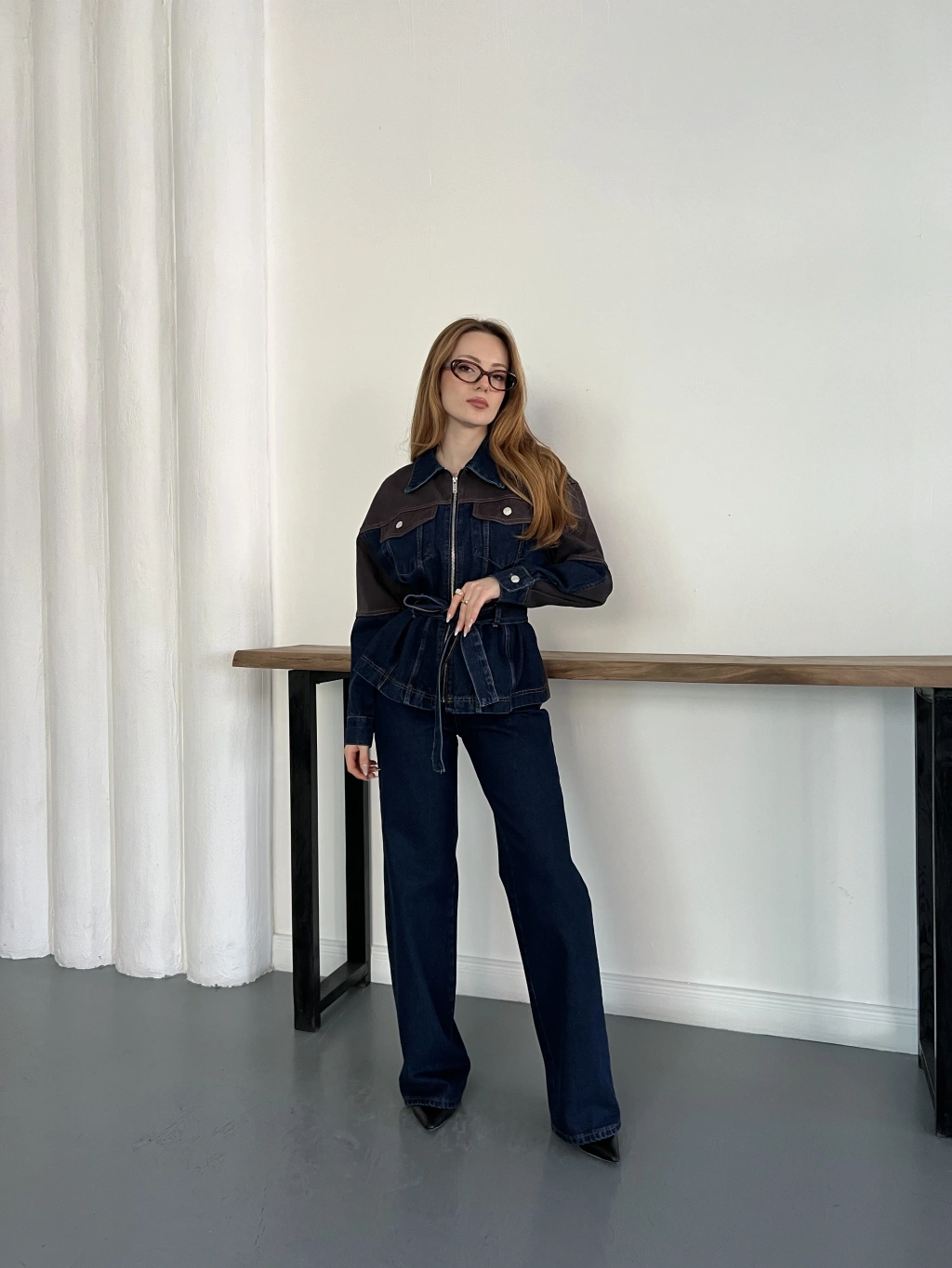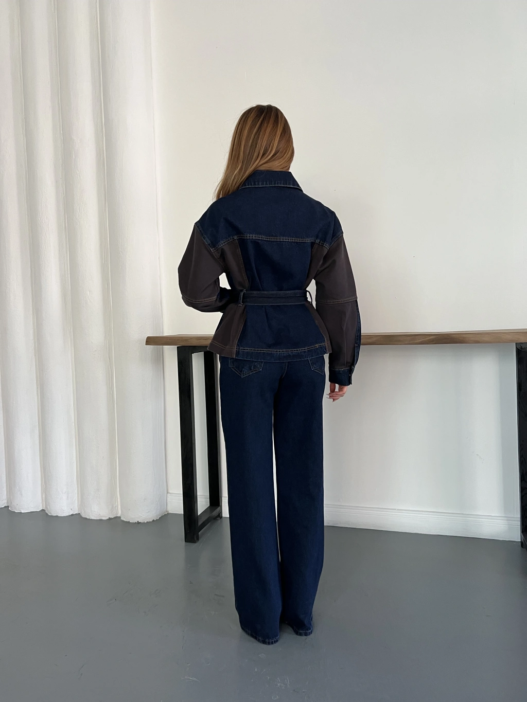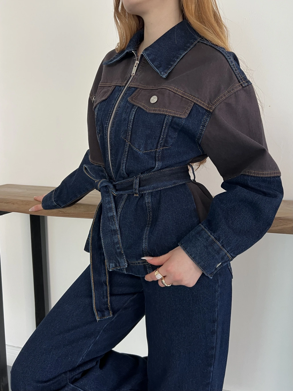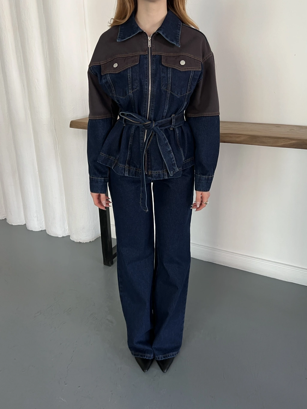 Bel Kuşaklı Fermuar Detaylı Denim Takım