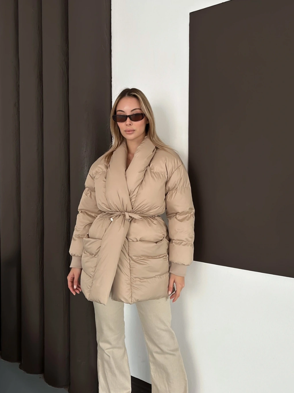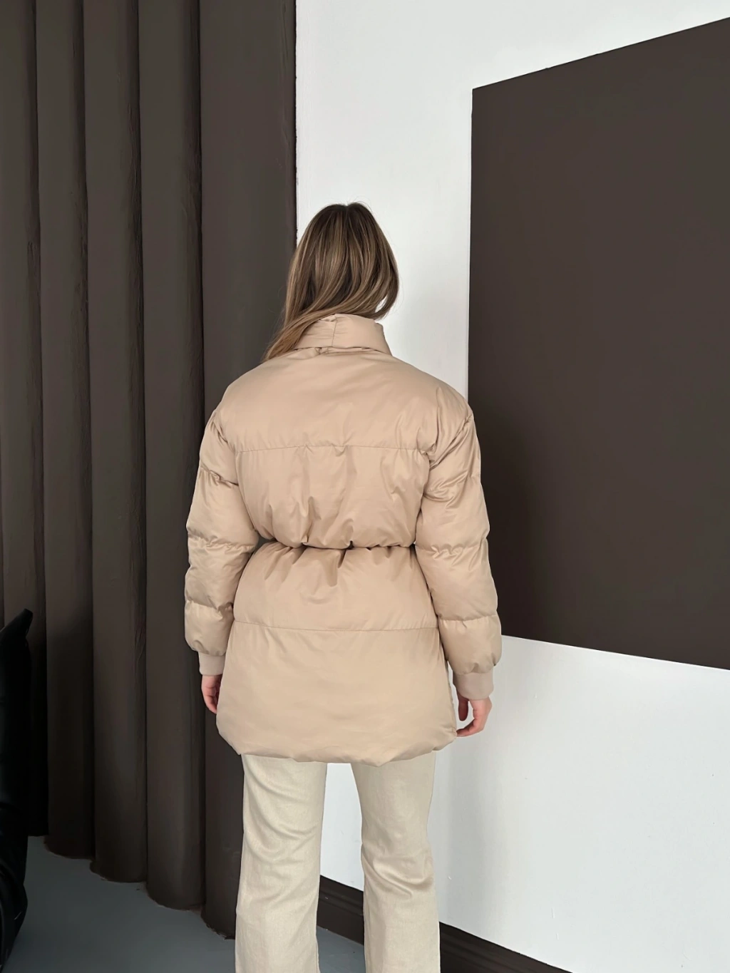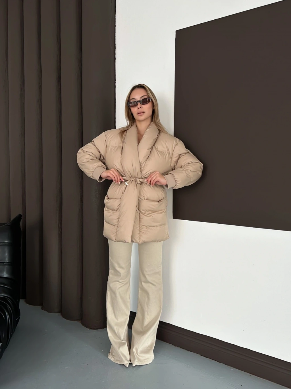 Belden Bağlamalı Cepli Şişme Mont Bej