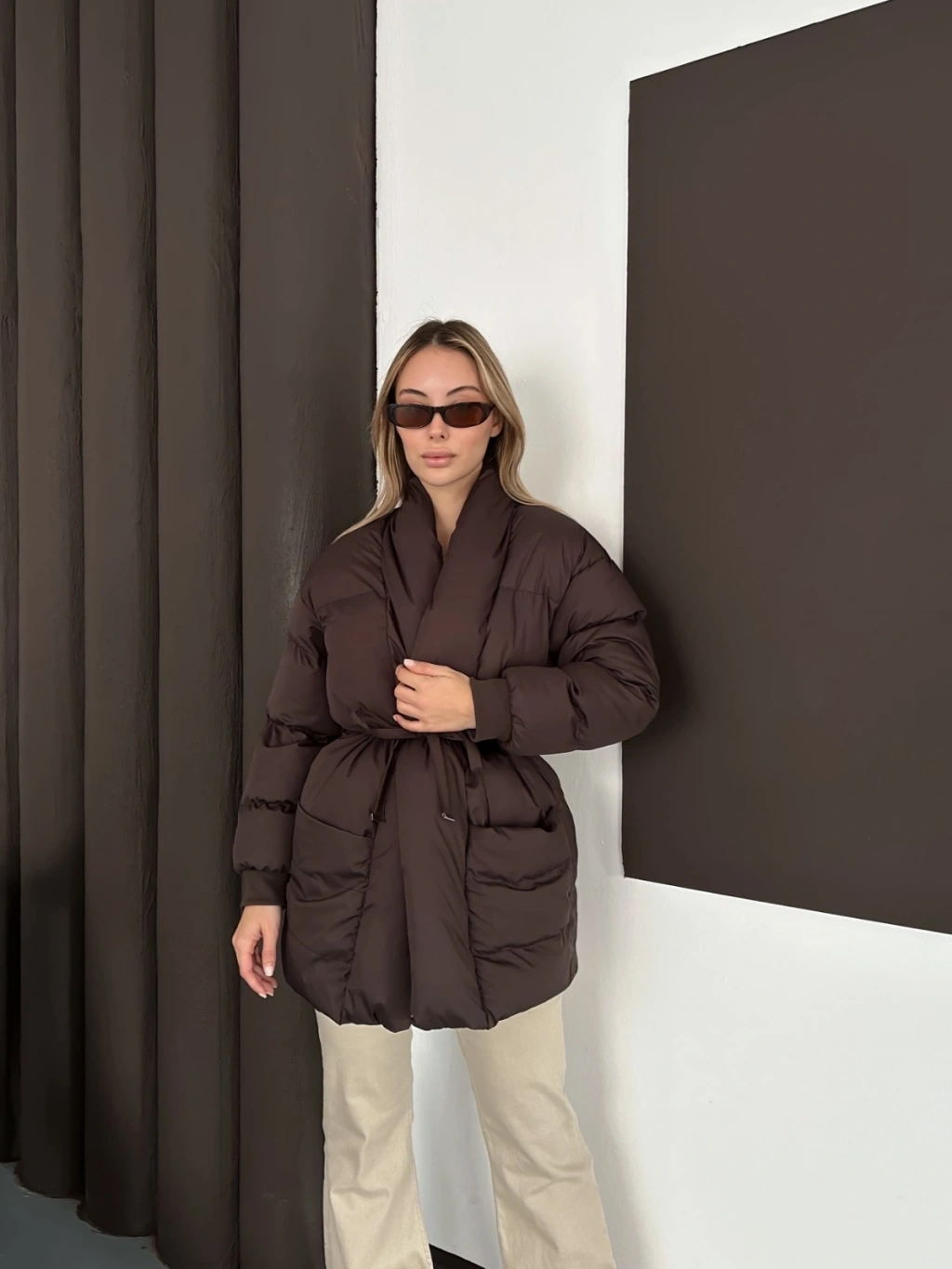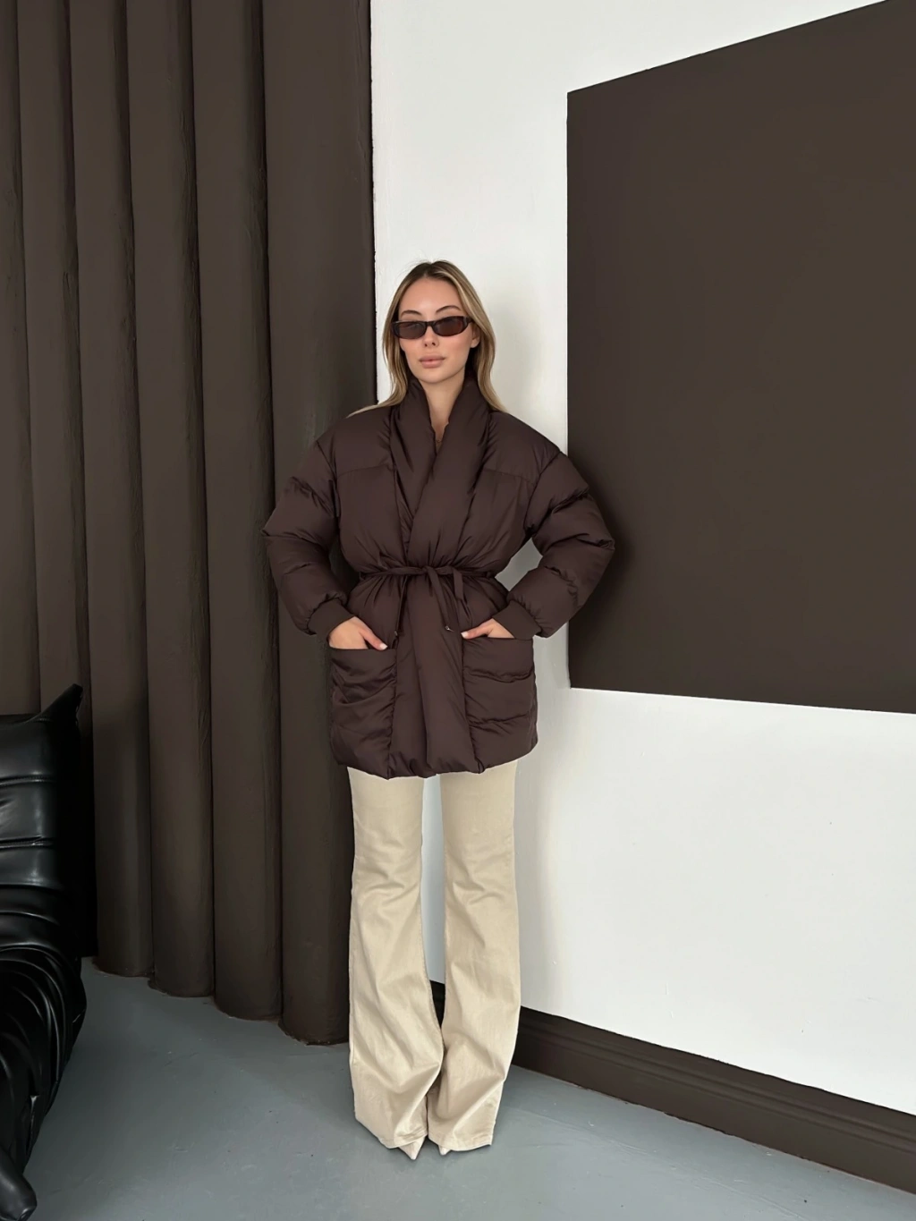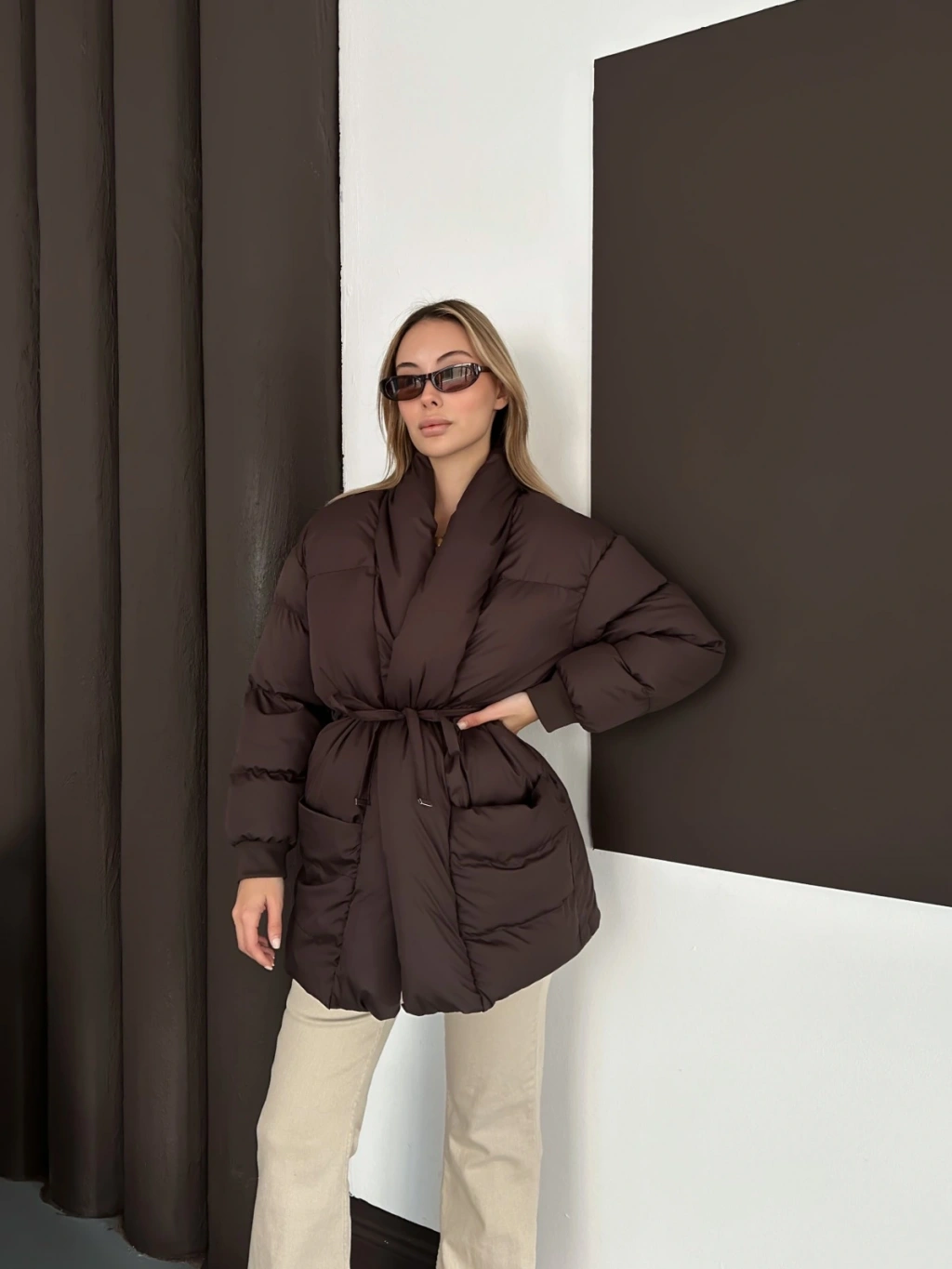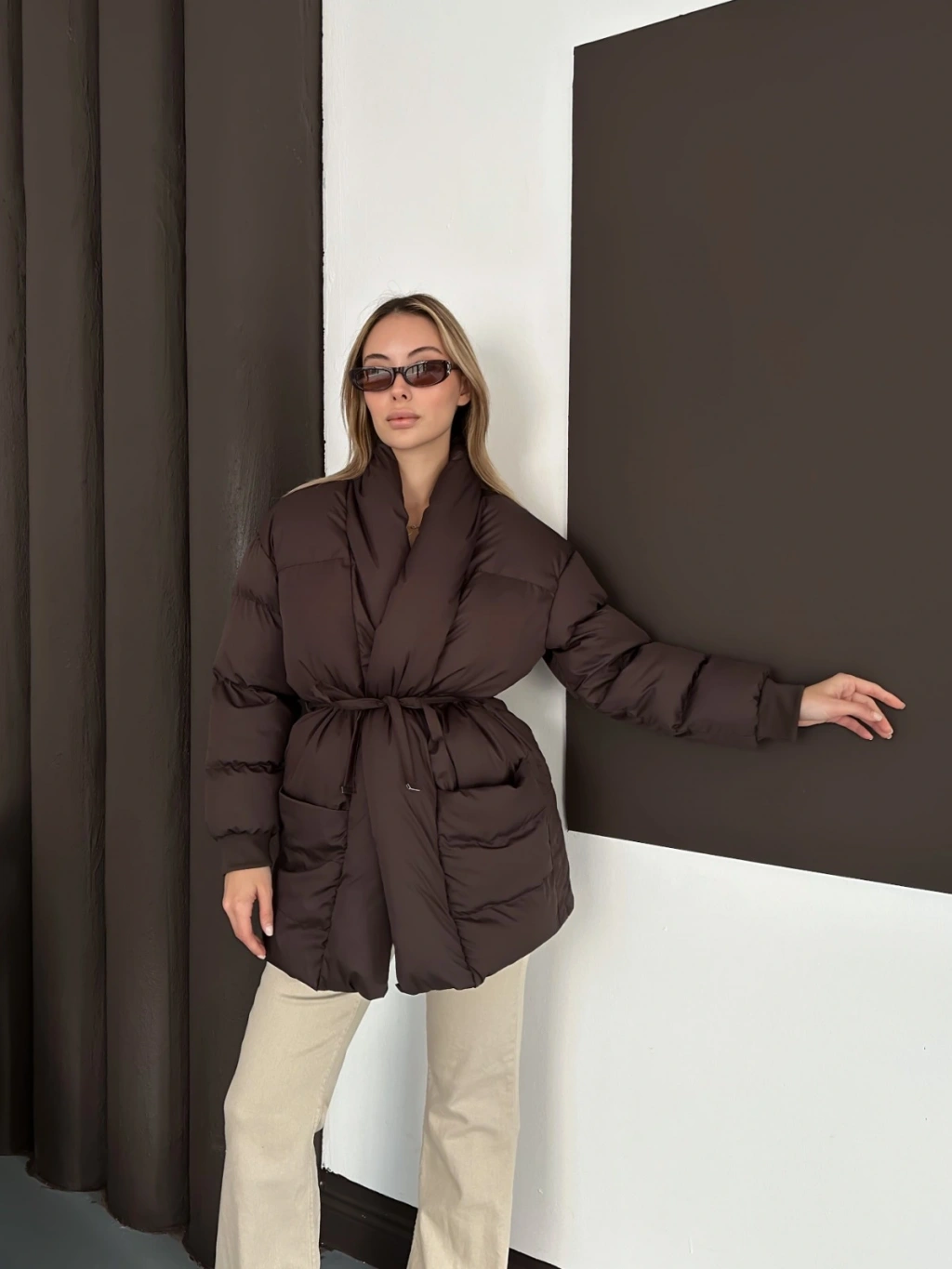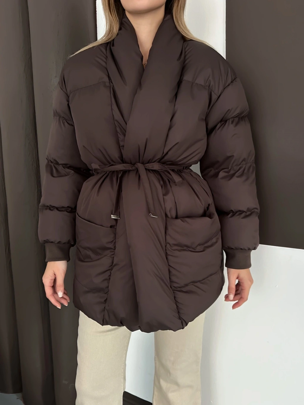 Belden Bağlamalı Cepli Şişme Mont Kahverengi