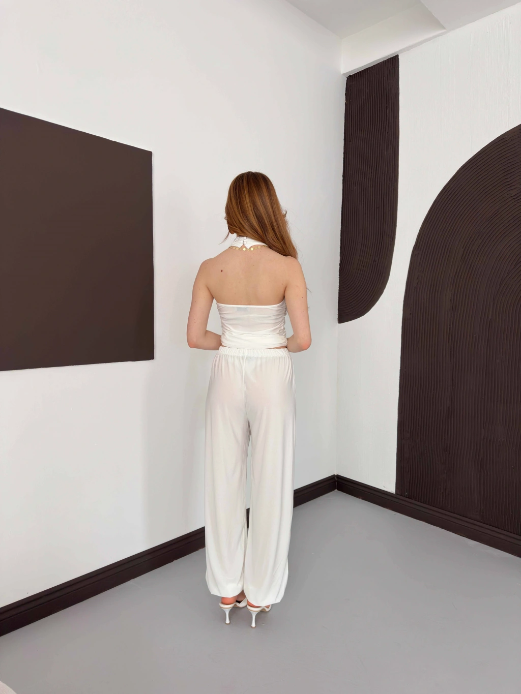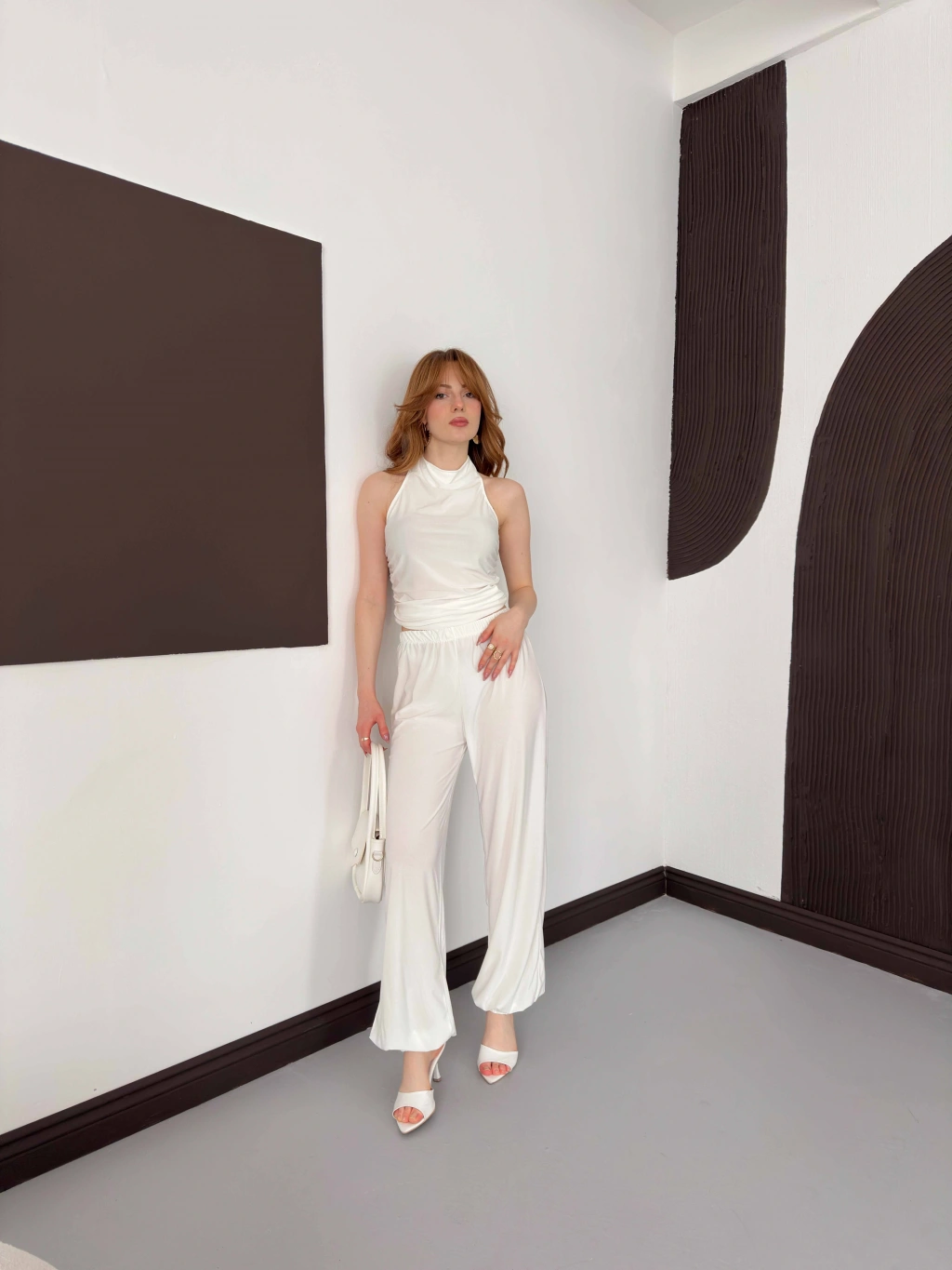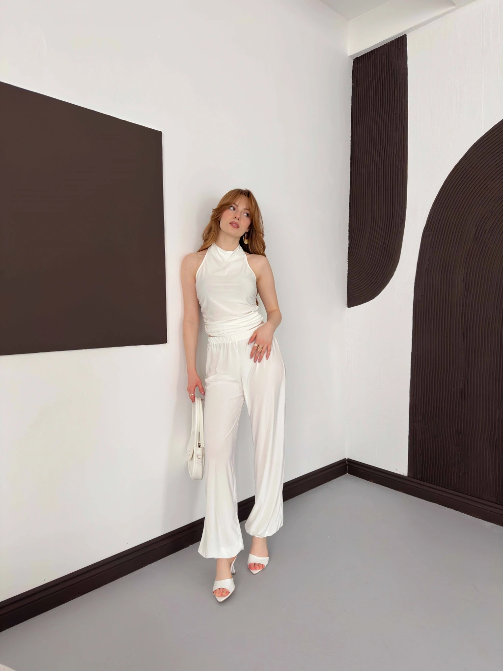 Boyundan Bağlamalı Pantolonlu İkili Takım Beyaz