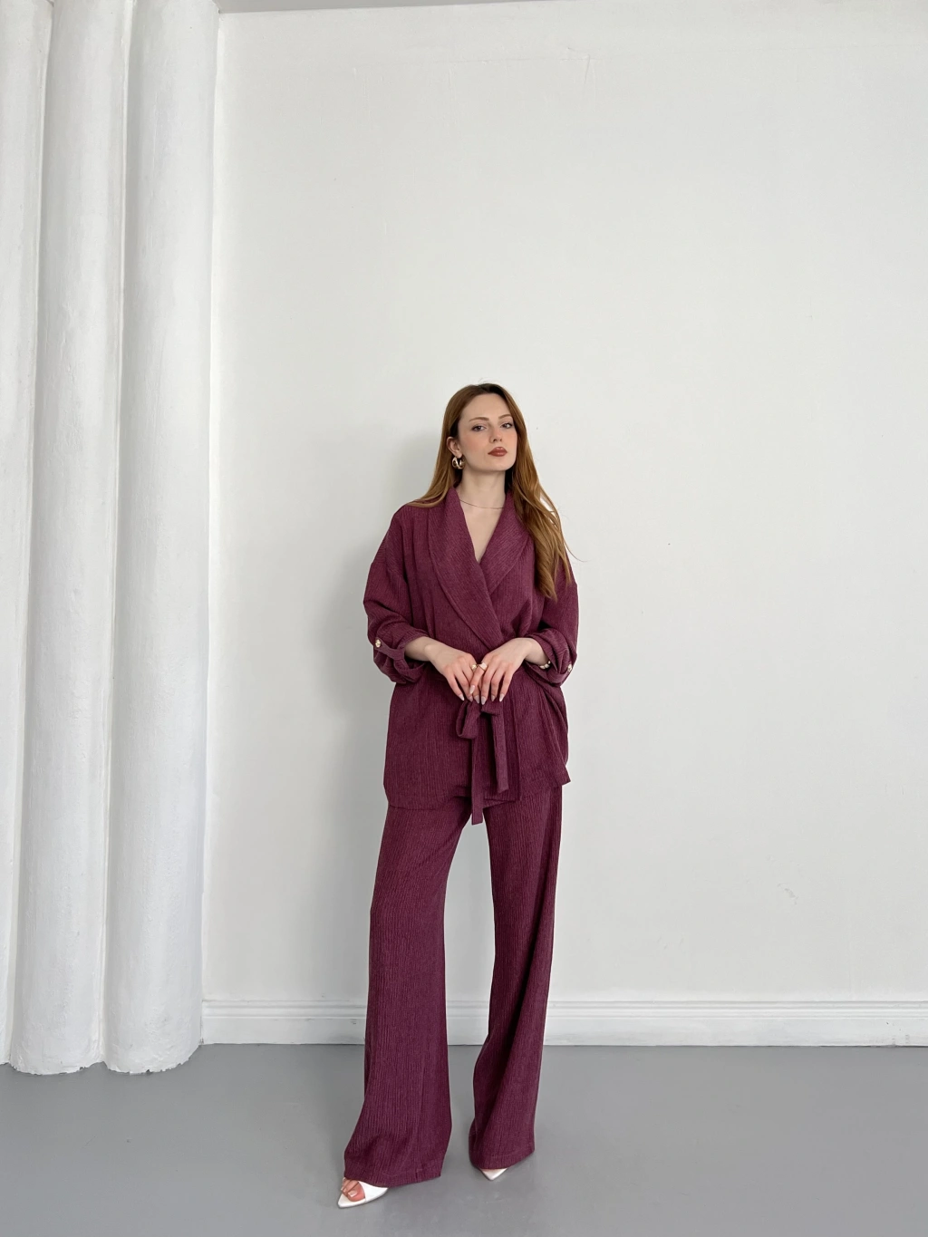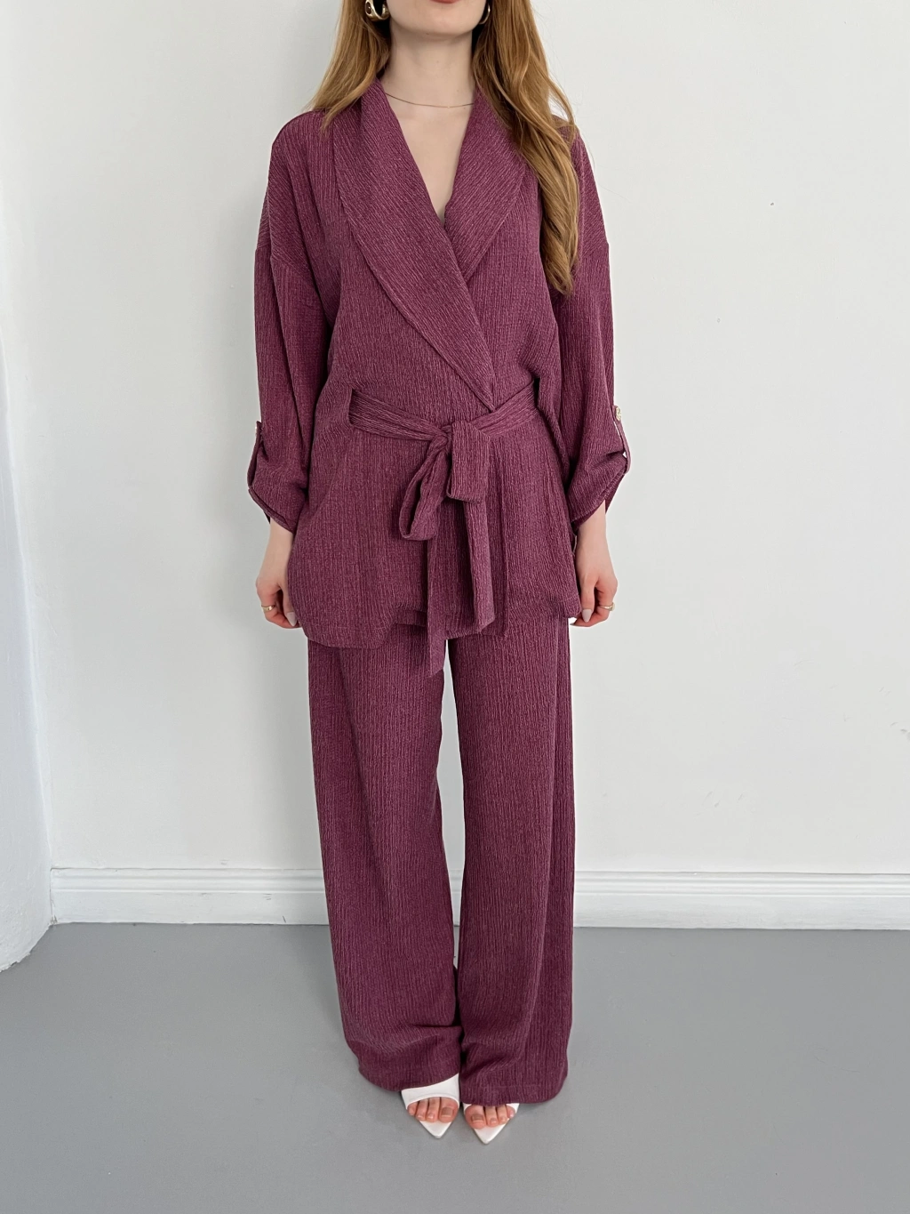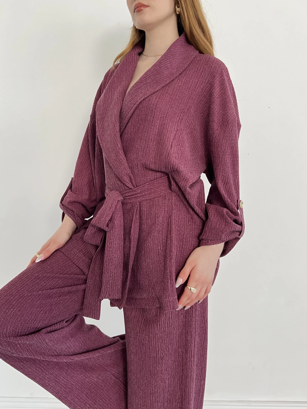 Bürümcük Bel Bağlamalı Kruvaze Yaka Tasarım Takım Mürdüm