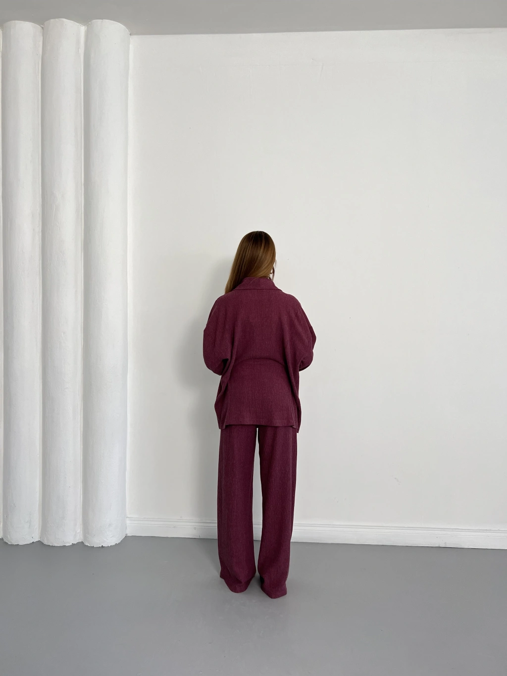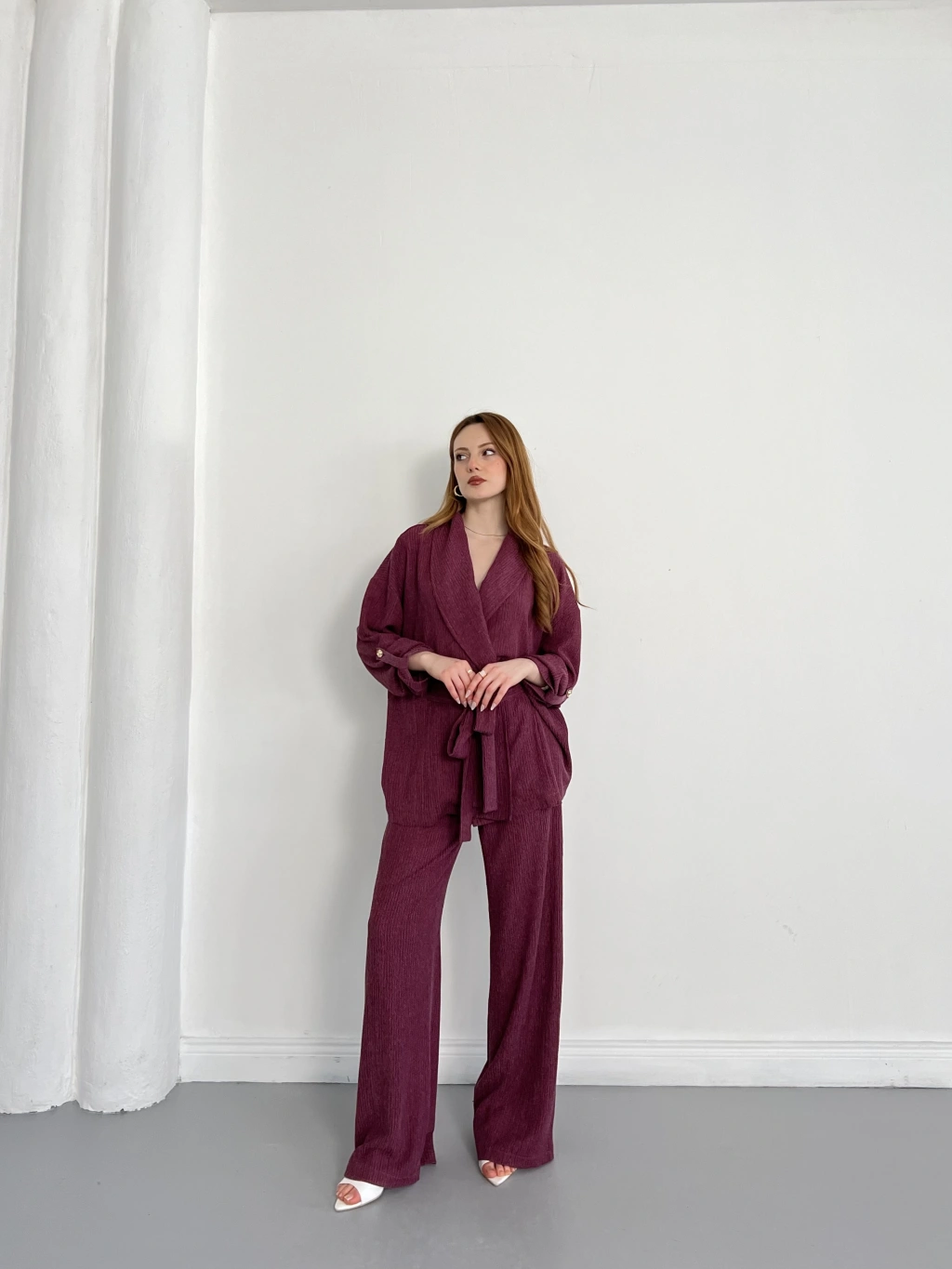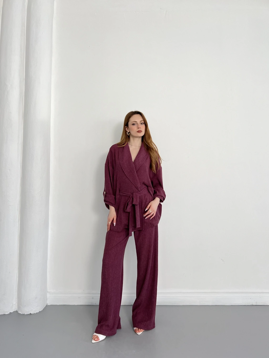 Bürümcük Bel Bağlamalı Kruvaze Yaka Tasarım Takım Mürdüm