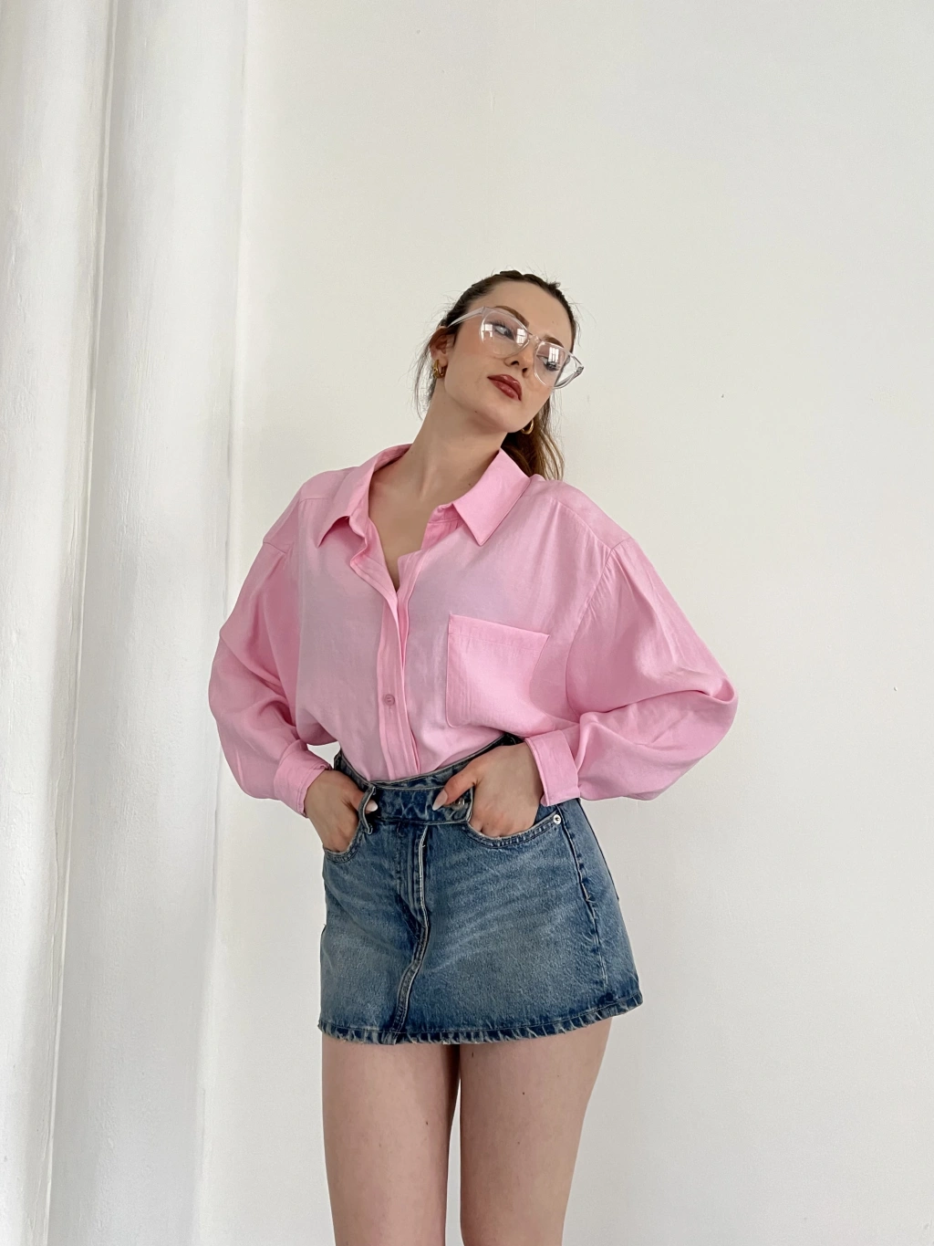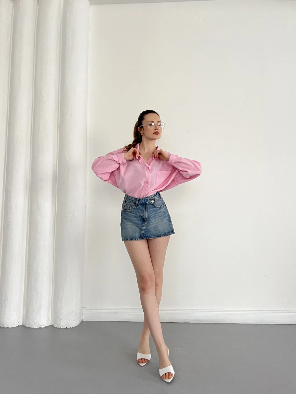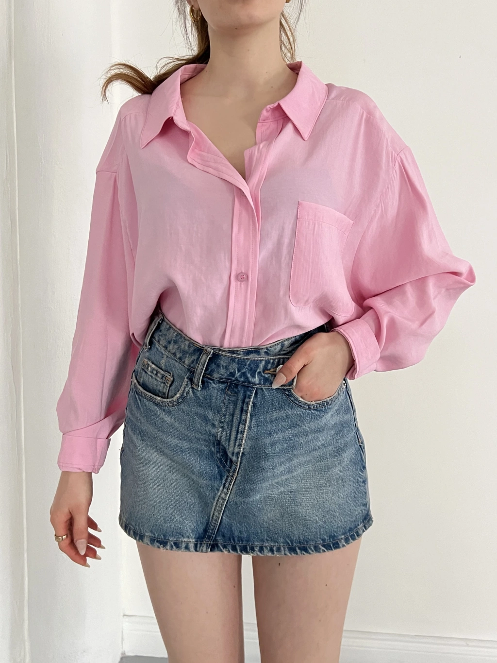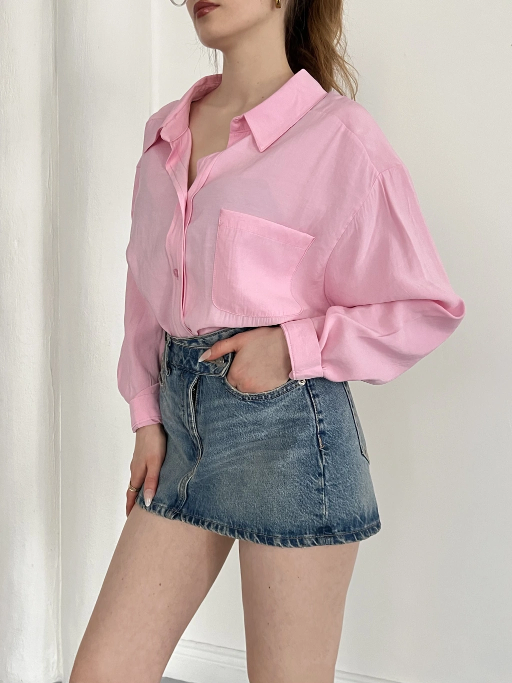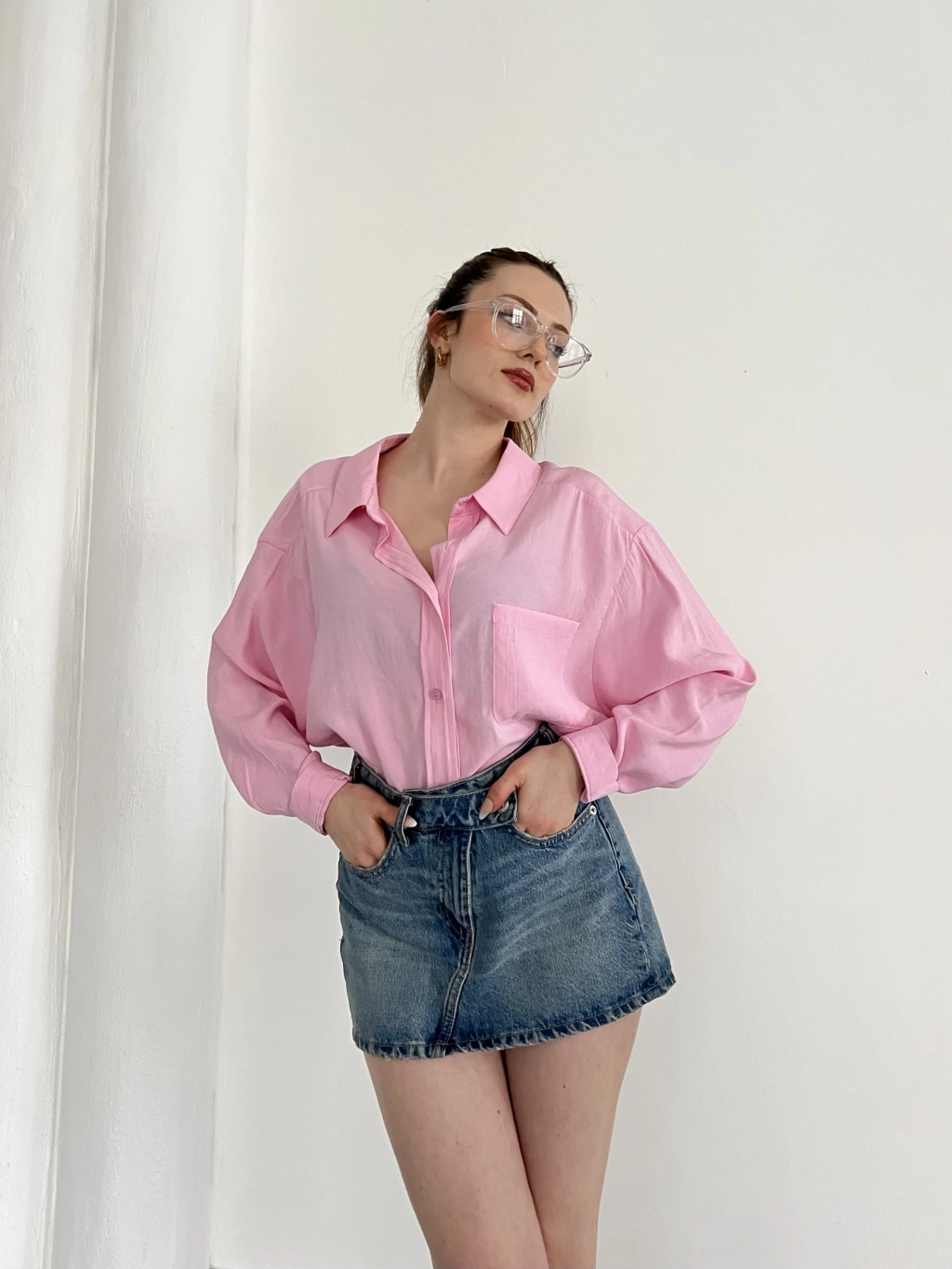 Cep Detaylı Oversize Salaş Crep Gömlek Pembe