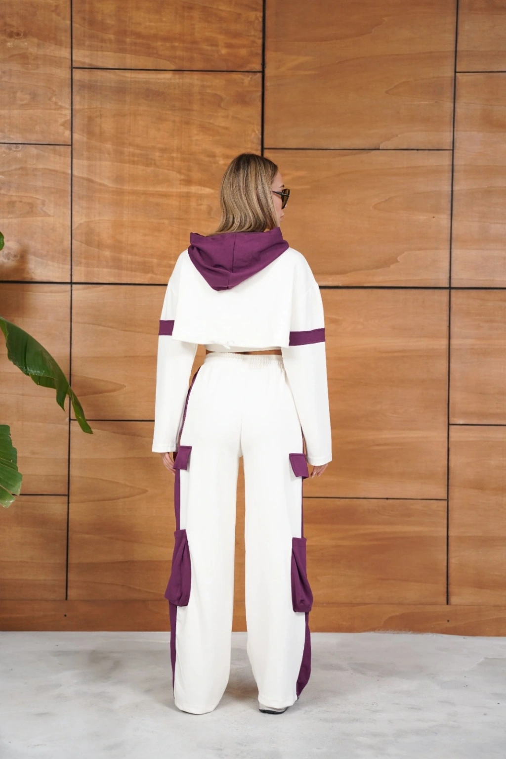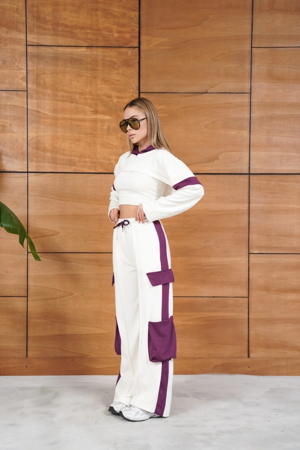 Cep Detaylı Özel Tasarım Eşofman Takımı Beyaz - Mor