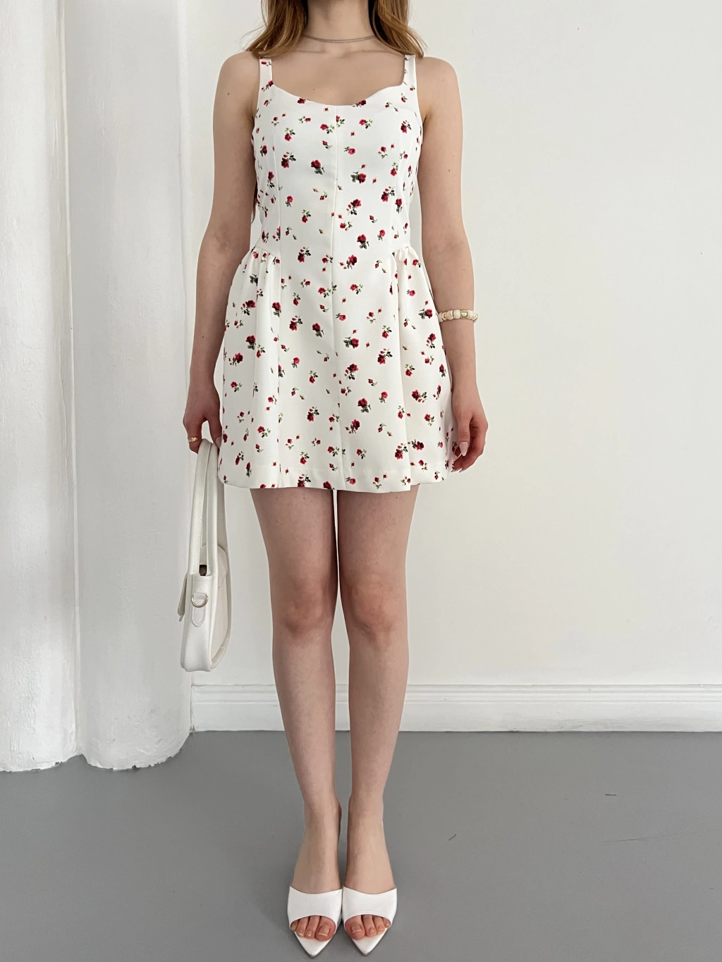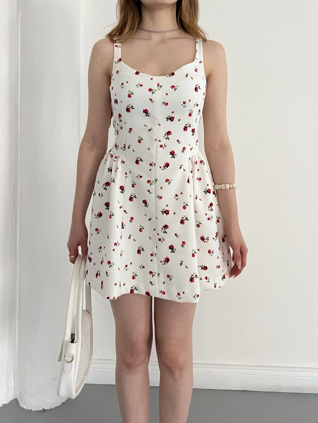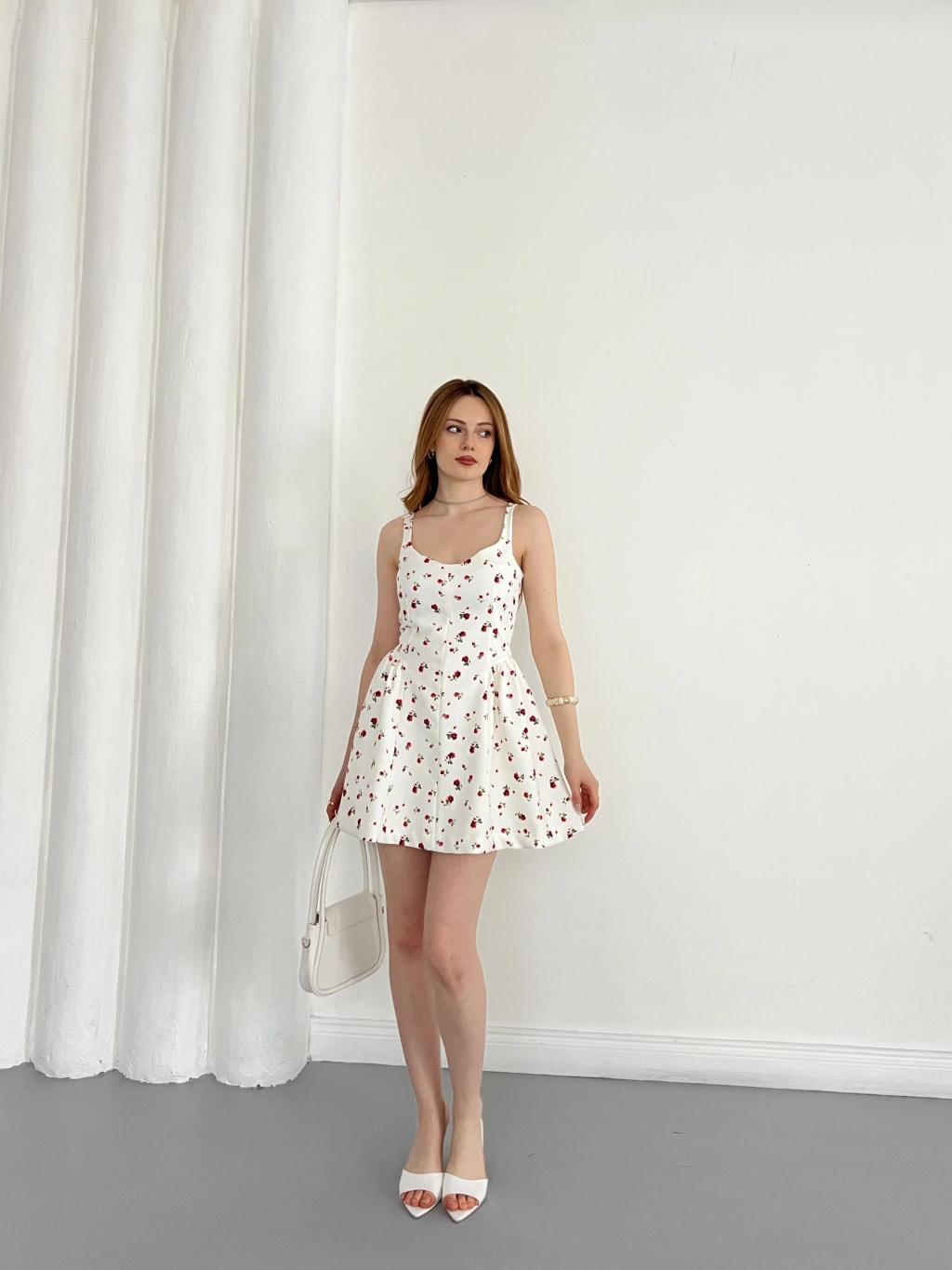 Çiçek Desenli Askılı Mini Elbise Beyaz