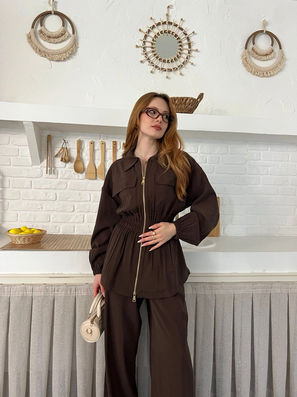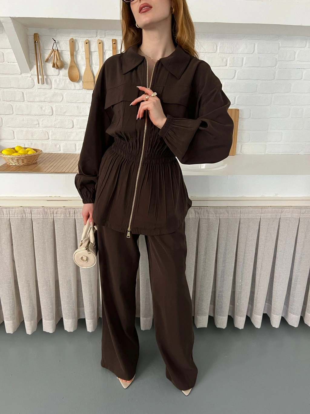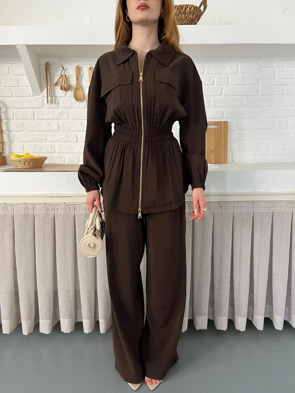 Çift Fermuar Detaylı Bel Büzgülü Modal Takım Kahve