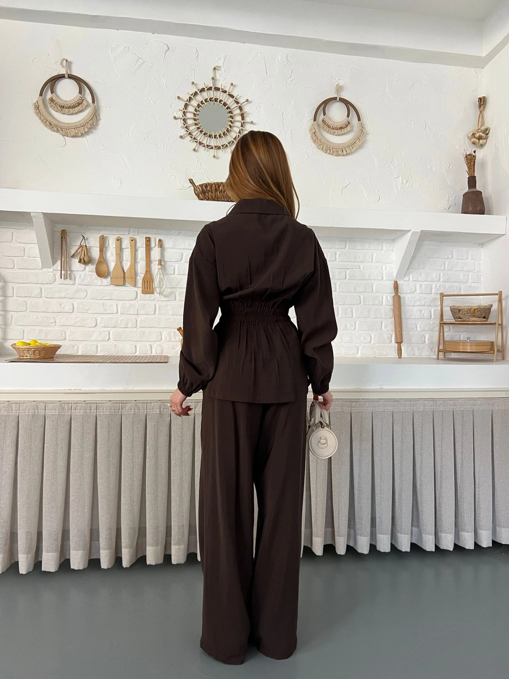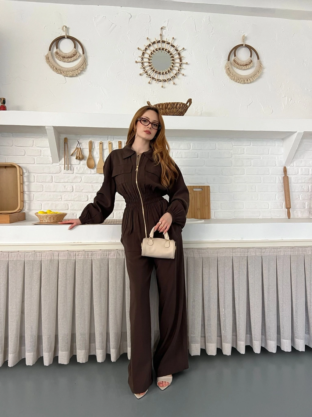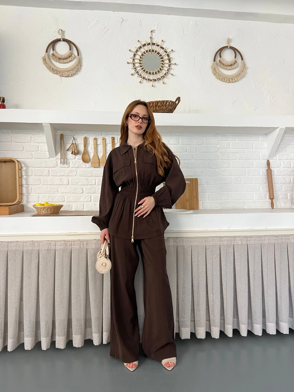 Çift Fermuar Detaylı Bel Büzgülü Modal Takım Kahve