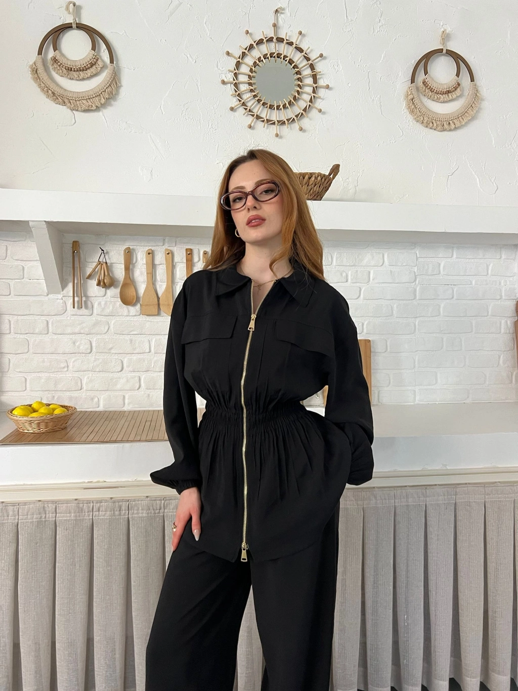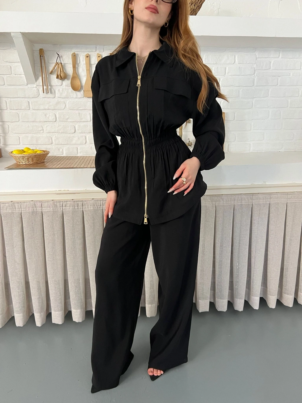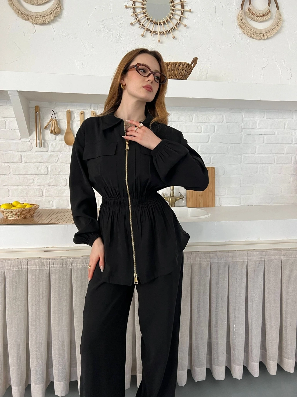 Çift Fermuar Detaylı Bel Büzgülü Modal Takım Siyah