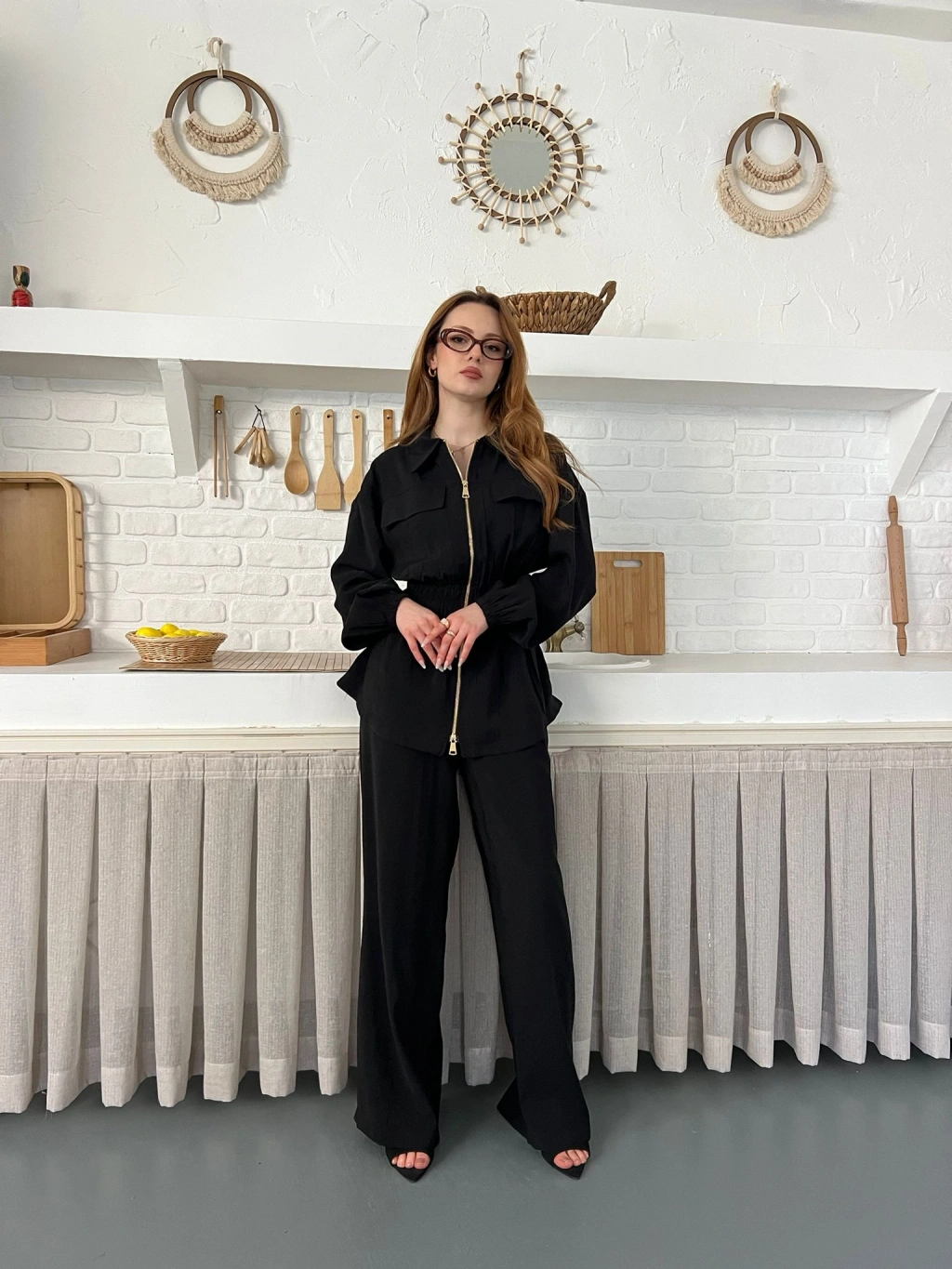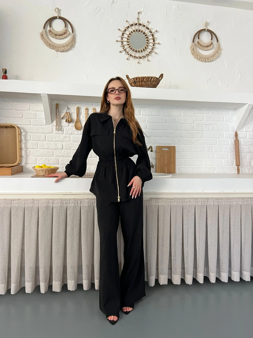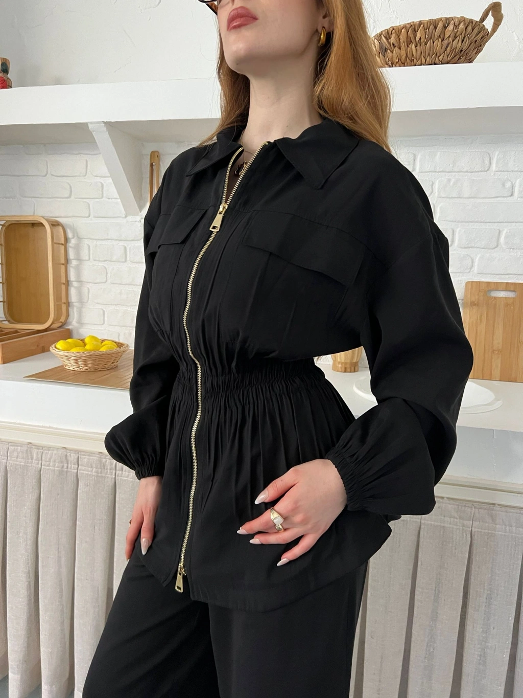 Çift Fermuar Detaylı Bel Büzgülü Modal Takım Siyah
