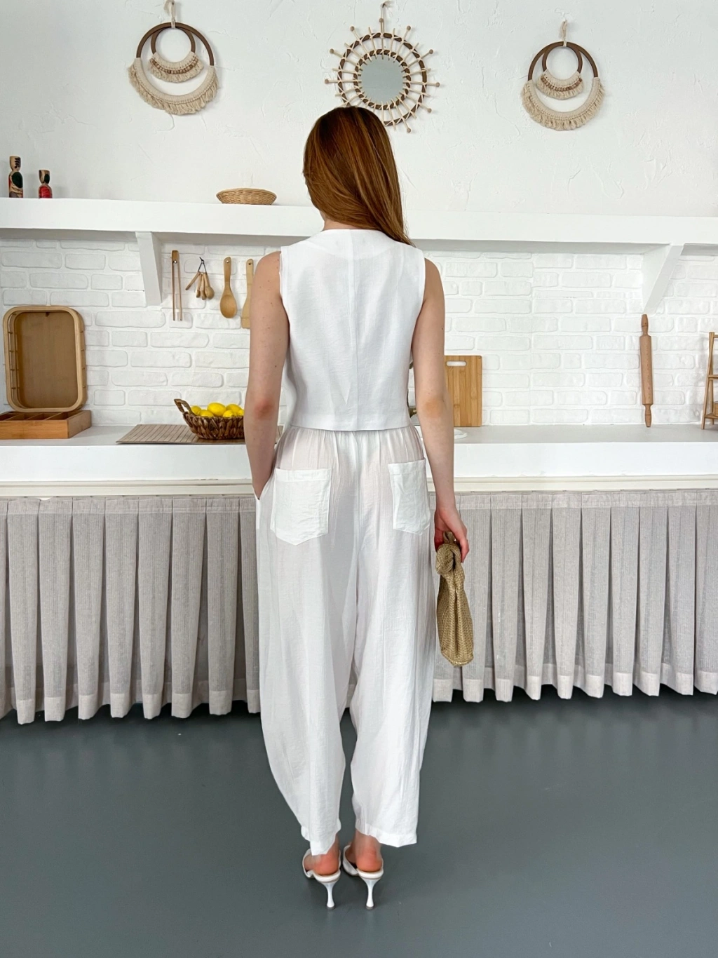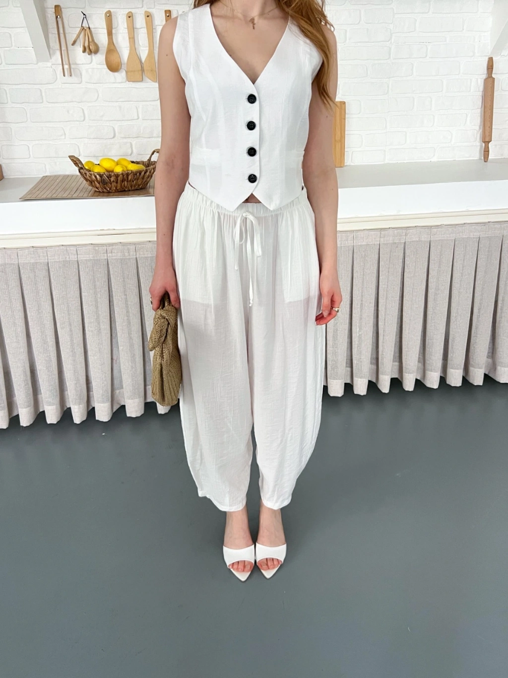Çilek Kumaş Yelekli Takım Beyaz