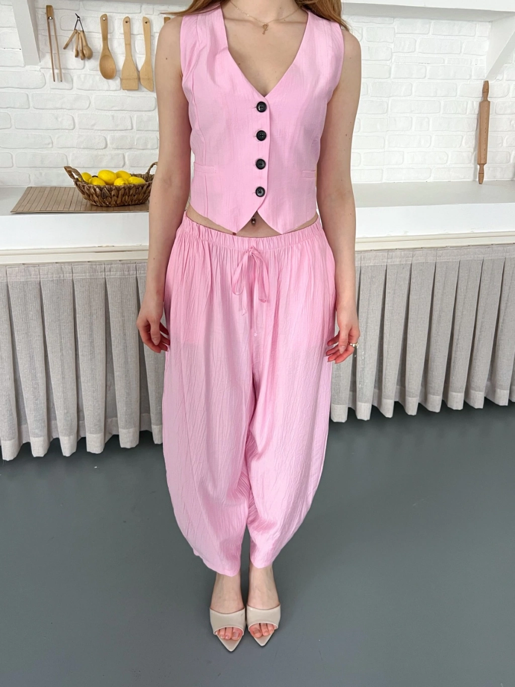 Blok Renk Tasarımlı Çıtçıt Detaylı Bel Lastikli Takım Bej