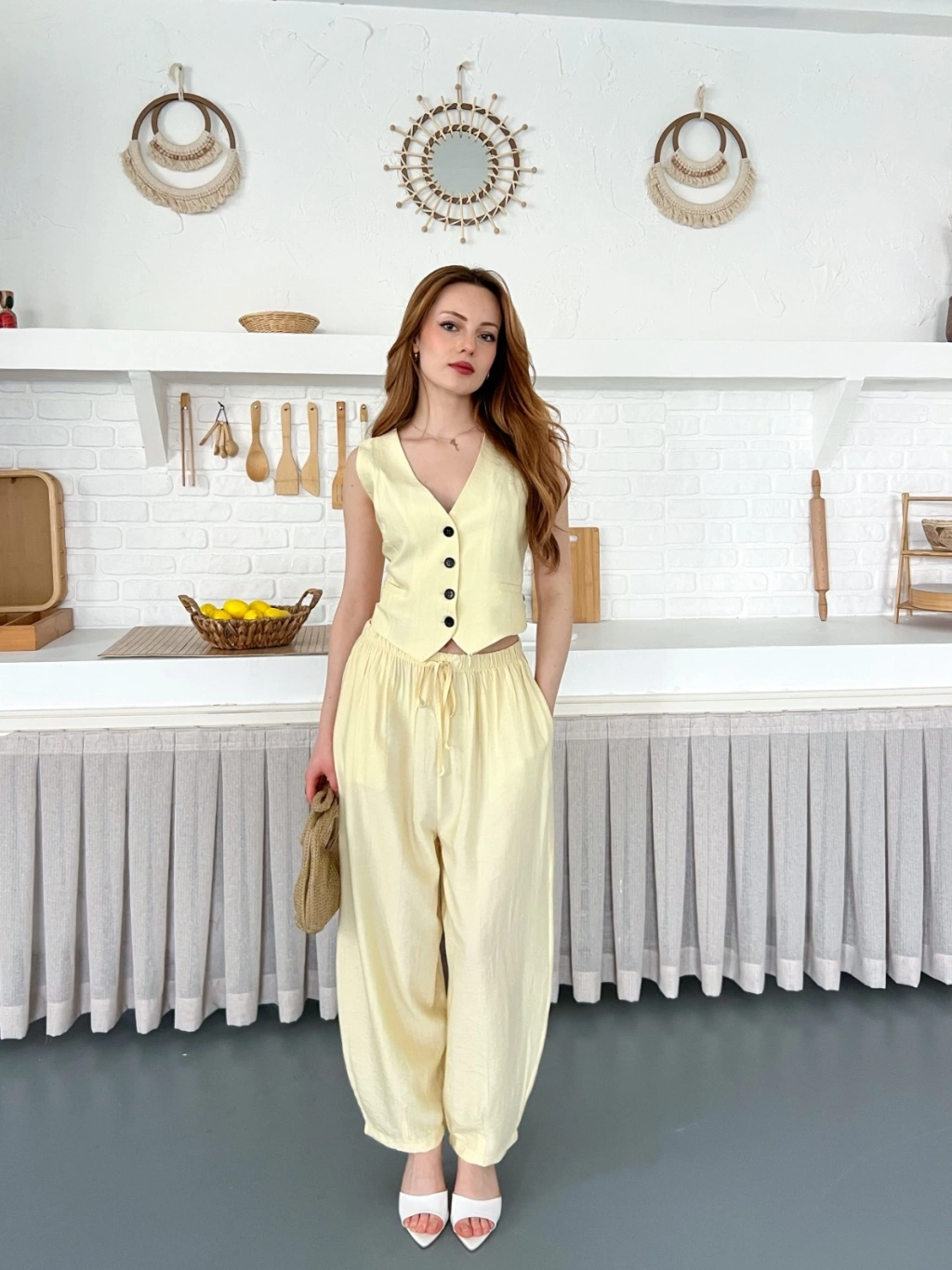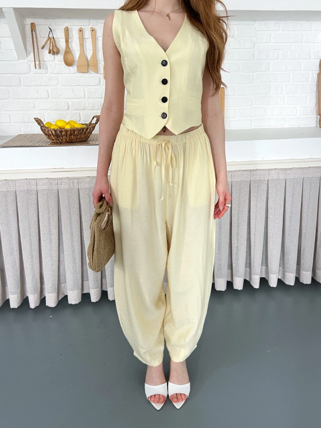 Çilek Kumaş Yelekli Takım Sarı