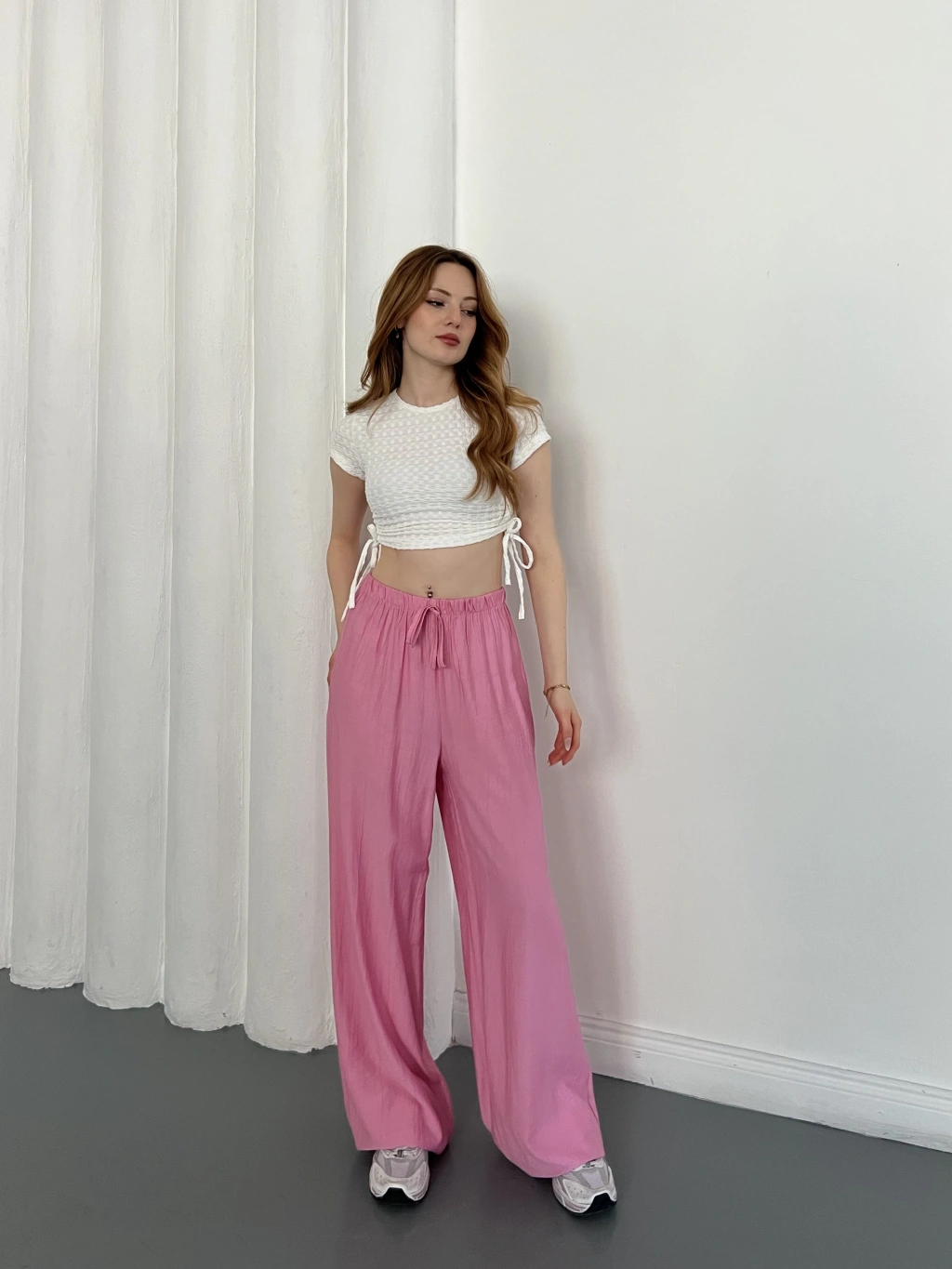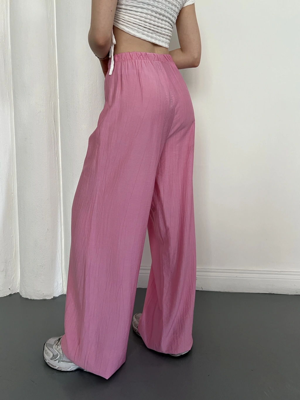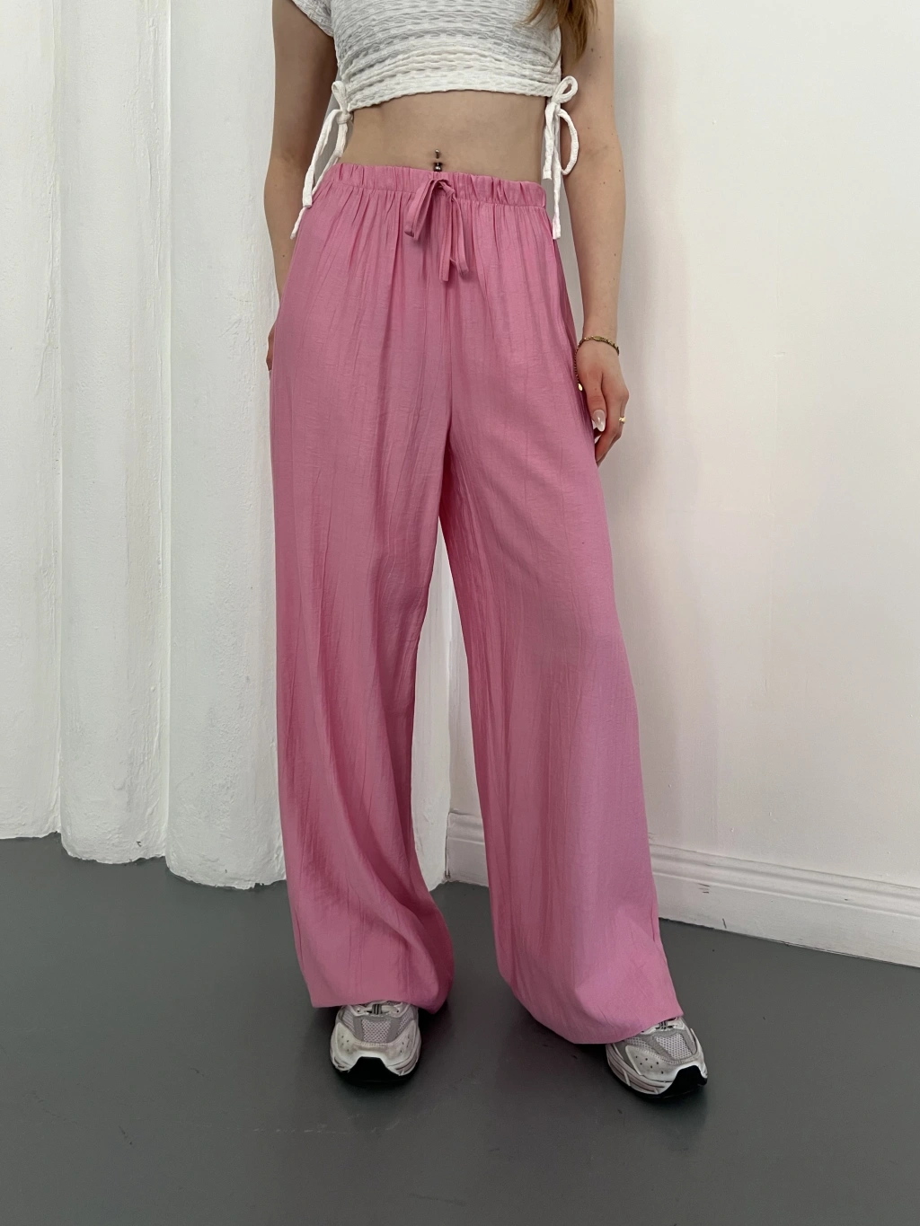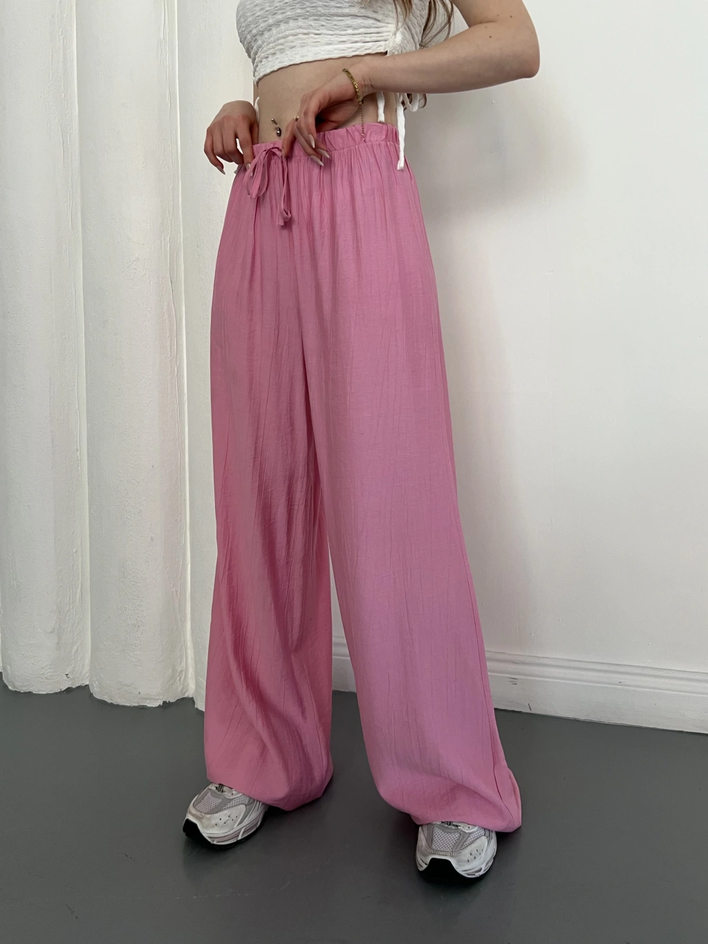 Çilek Kumaş Yüksek Bel Rahat Kalıp Pantolon Pembe