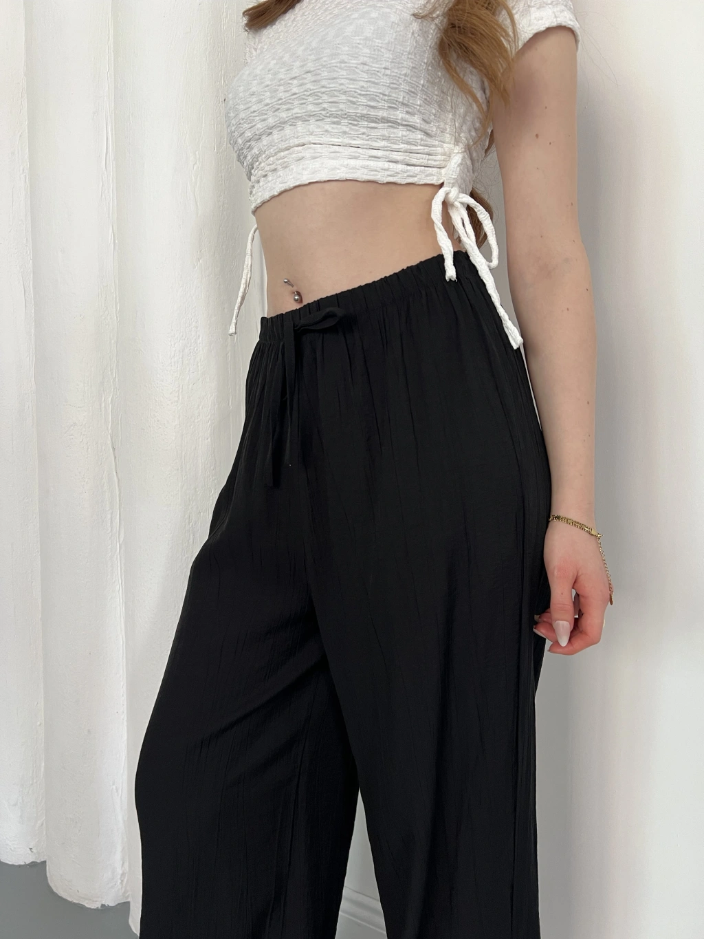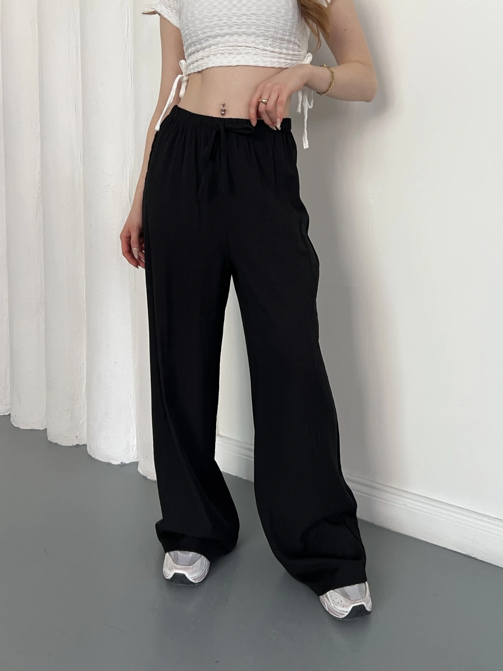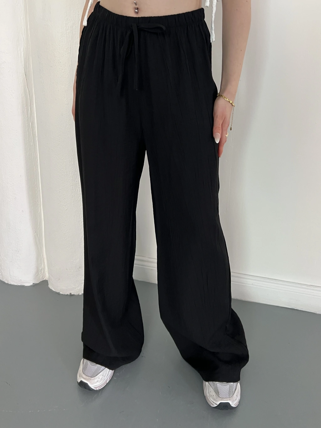 Çilek Kumaş Yüksek Bel Rahat Kalıp Pantolon Siyah
