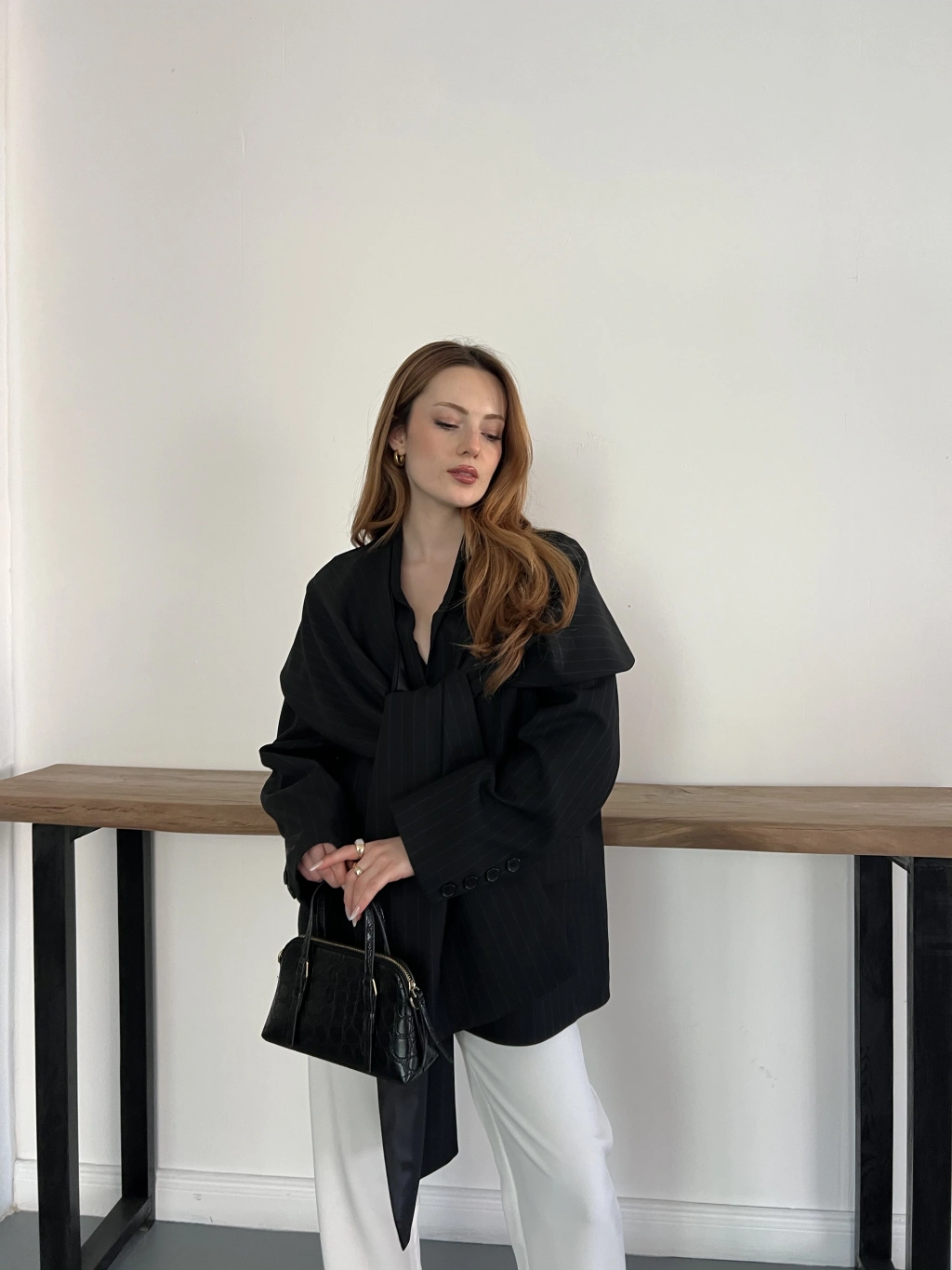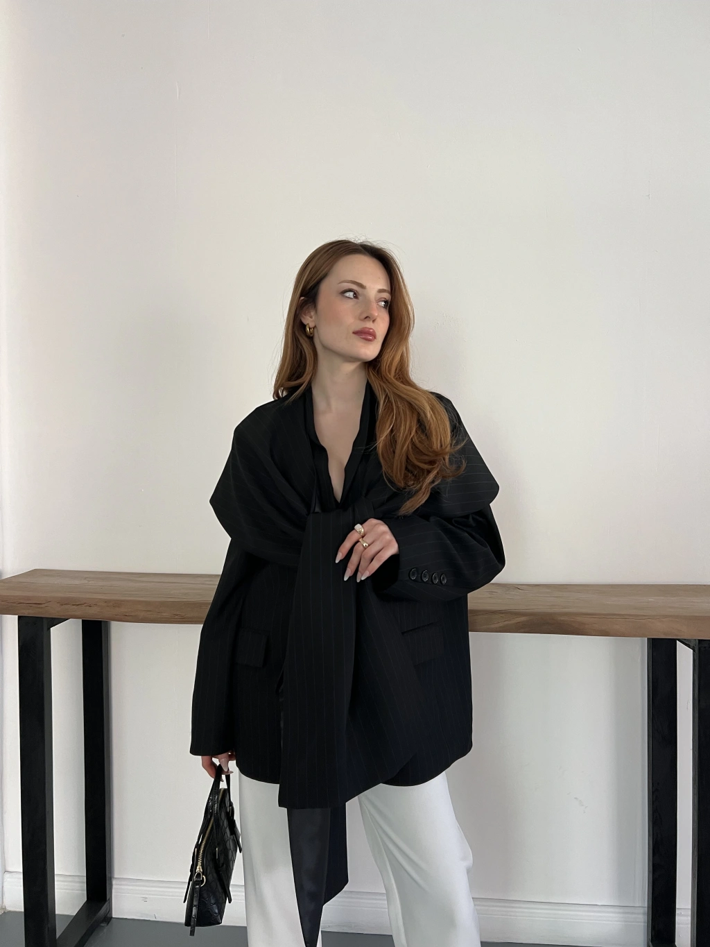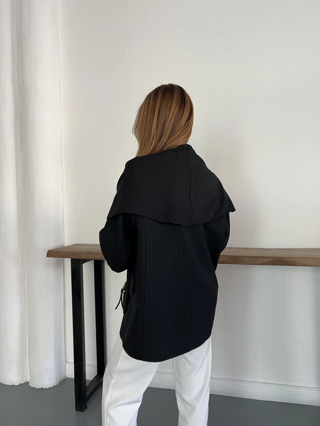 Çizgi Desen Önden Bağlamalı Tasarım Ceket Siyah