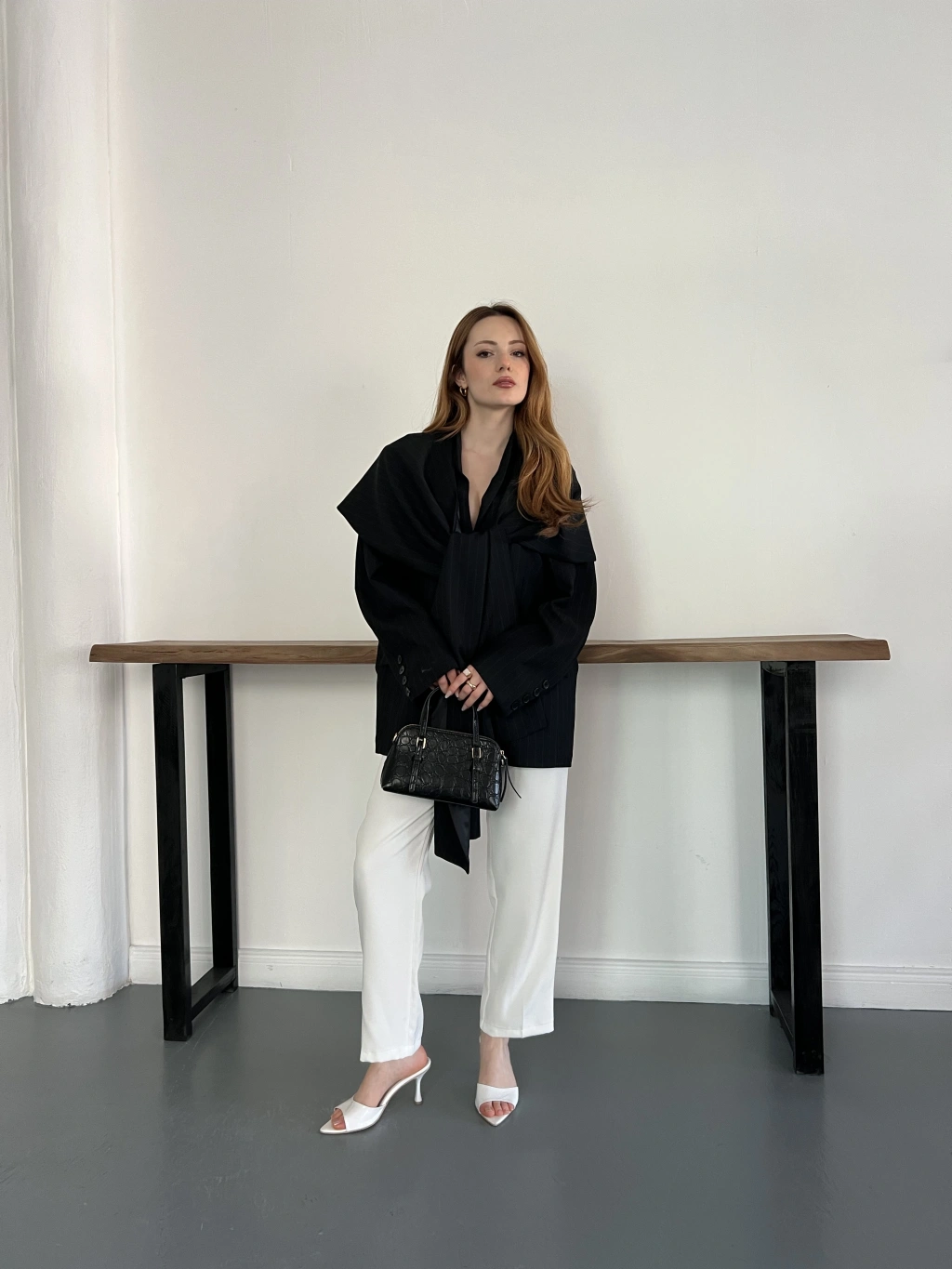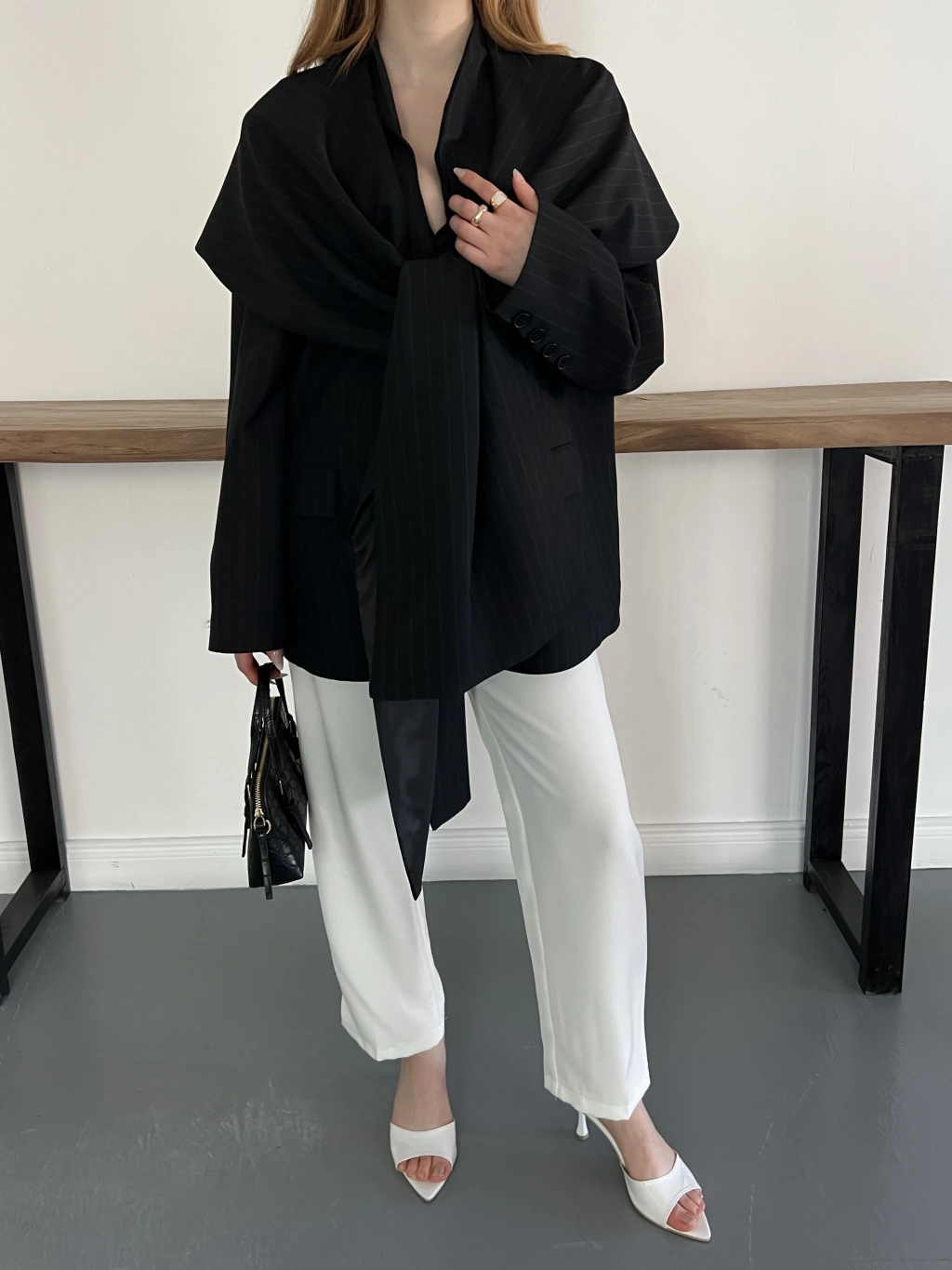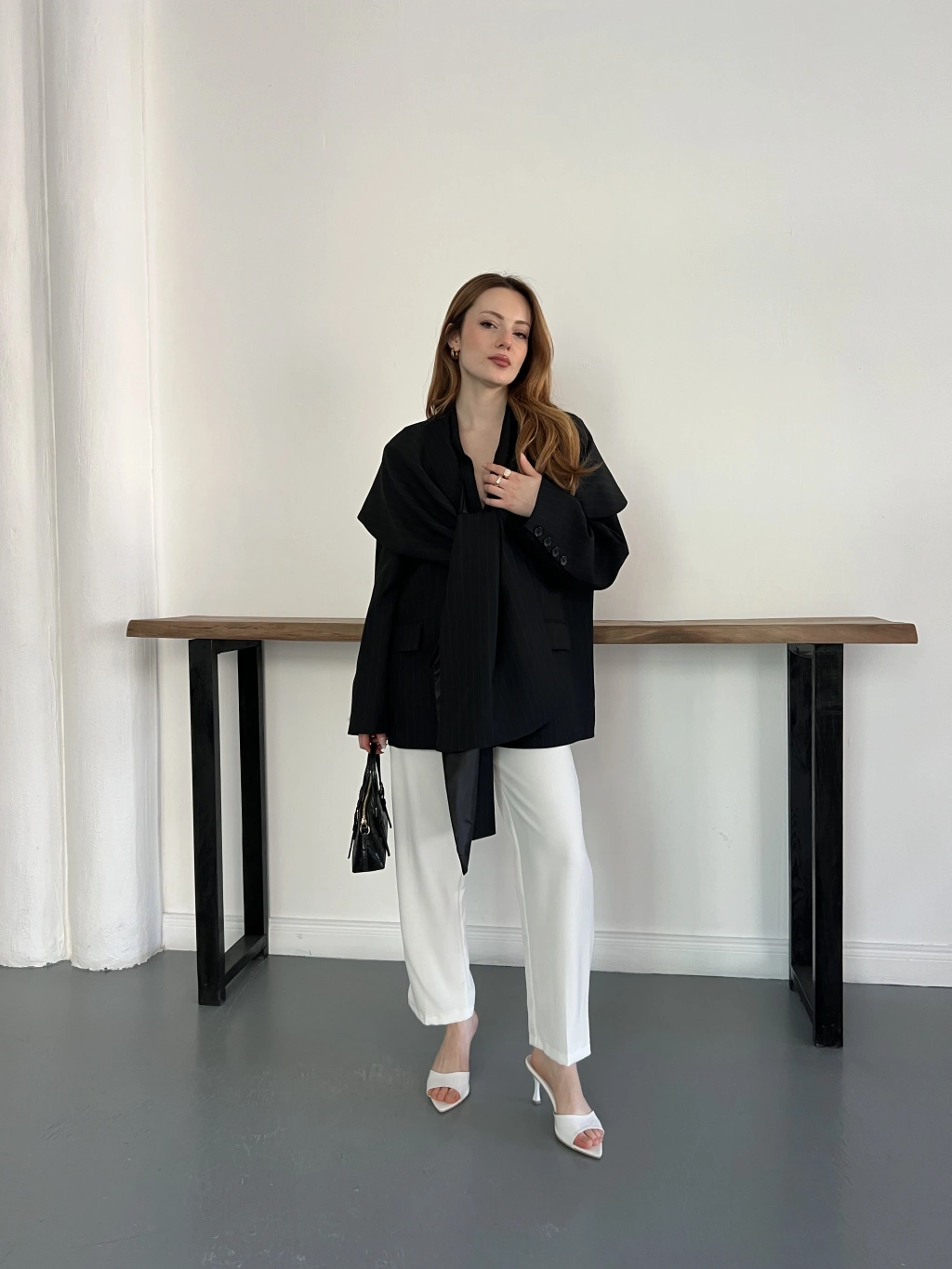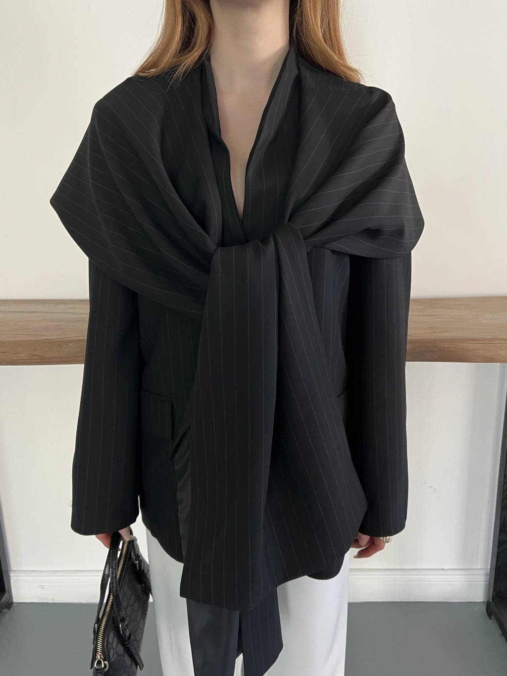 Çizgi Desen Önden Bağlamalı Tasarım Ceket Siyah