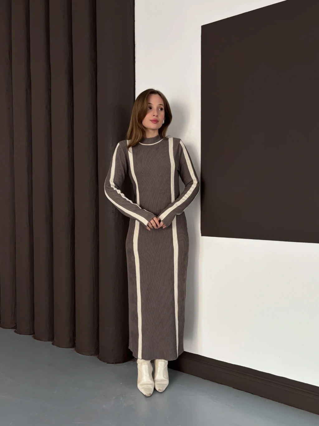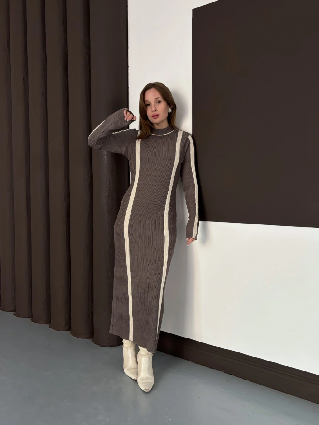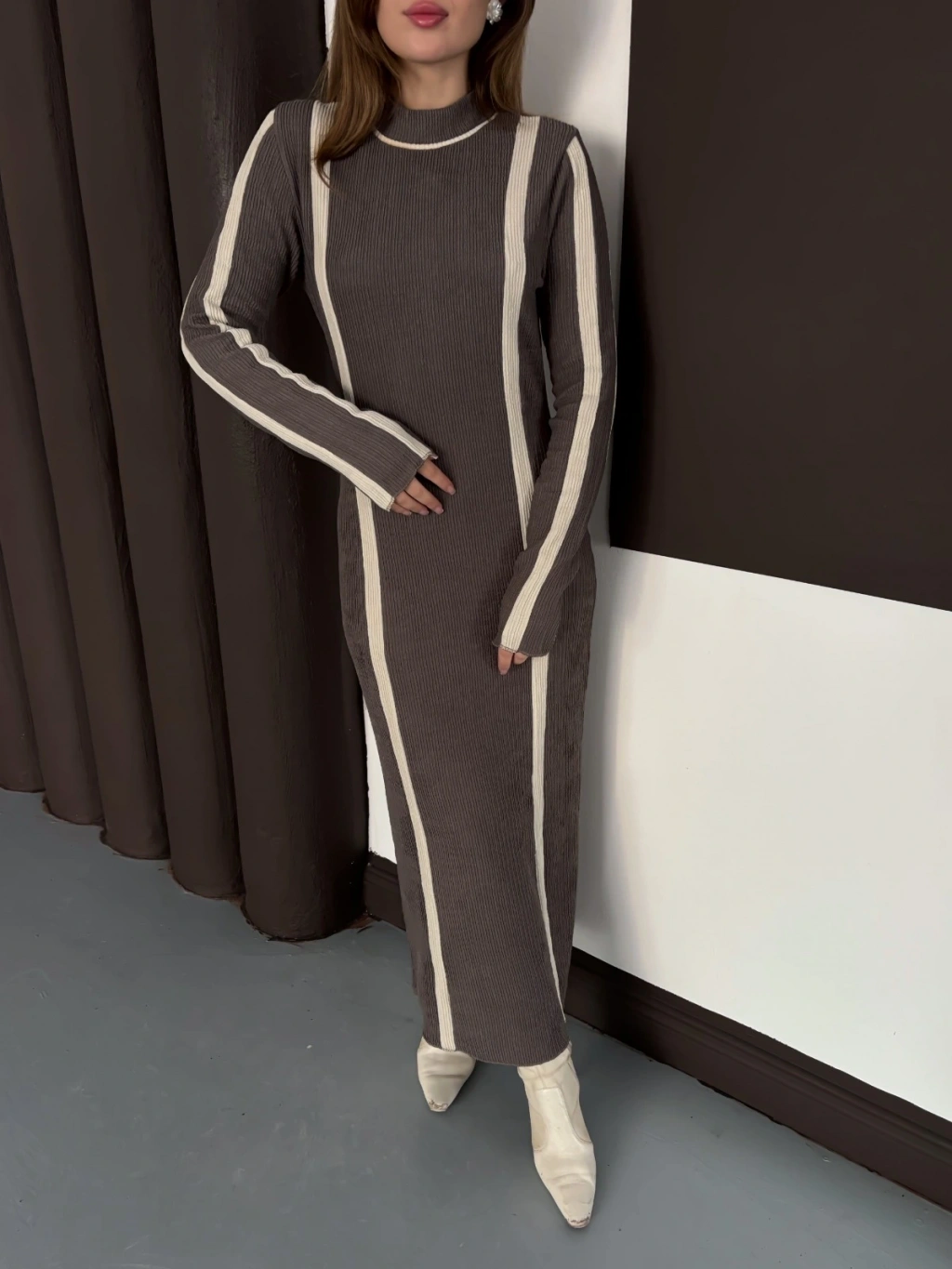 Çizgi Desen Triko Elbise Vizon
