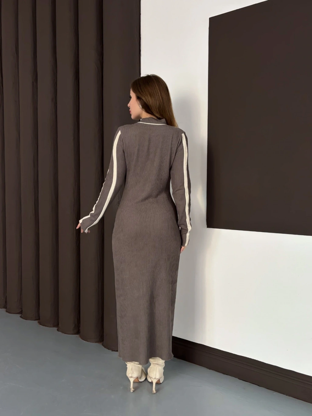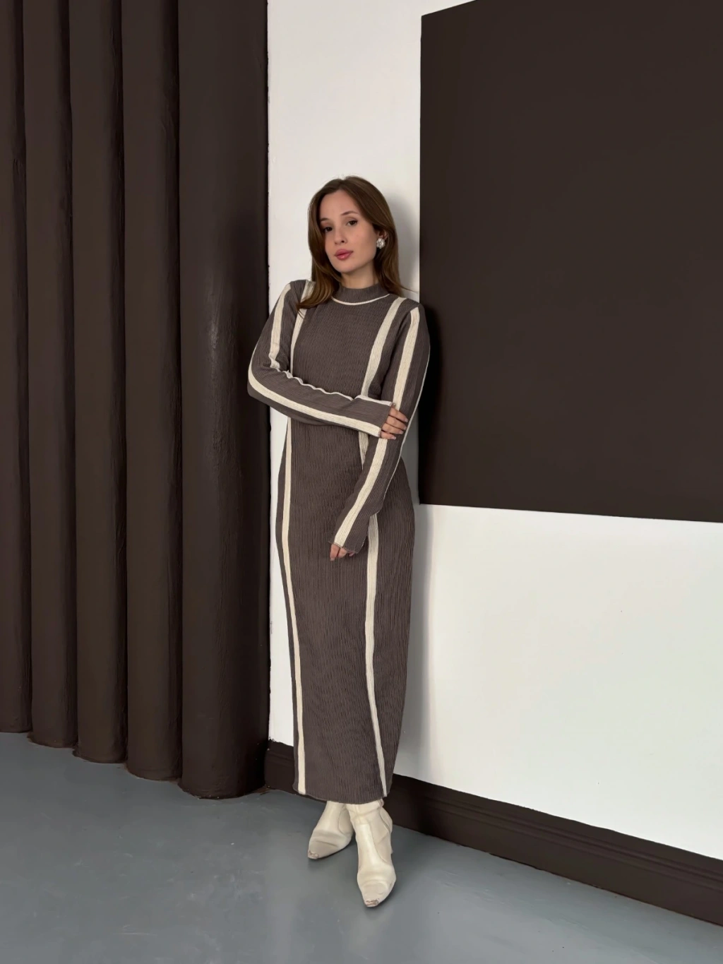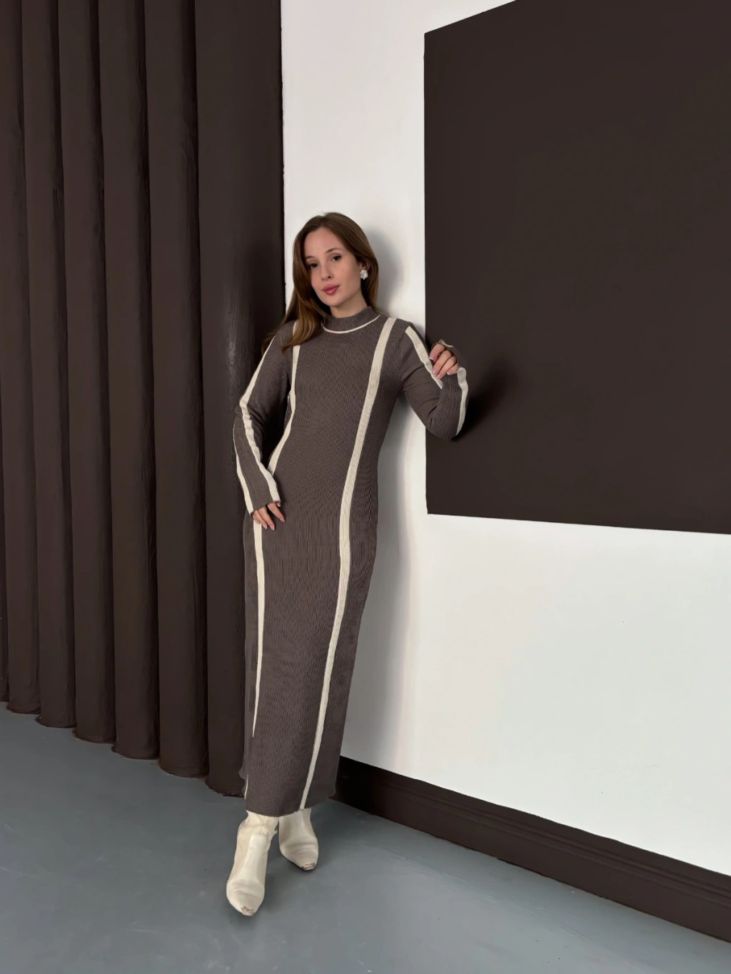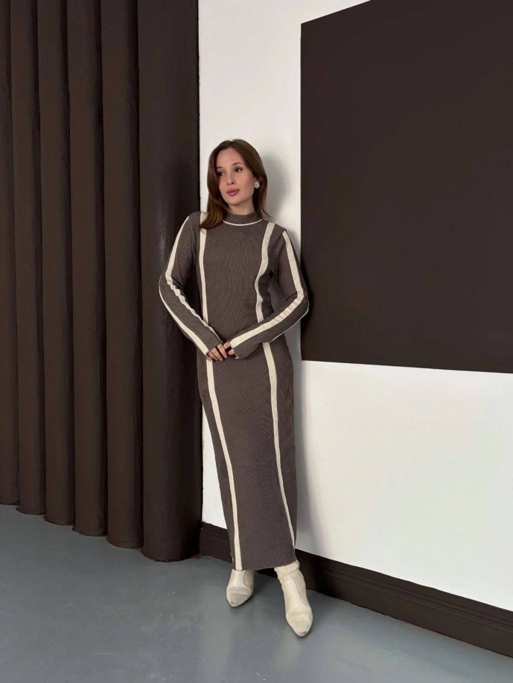 Çizgi Desen Triko Elbise Vizon