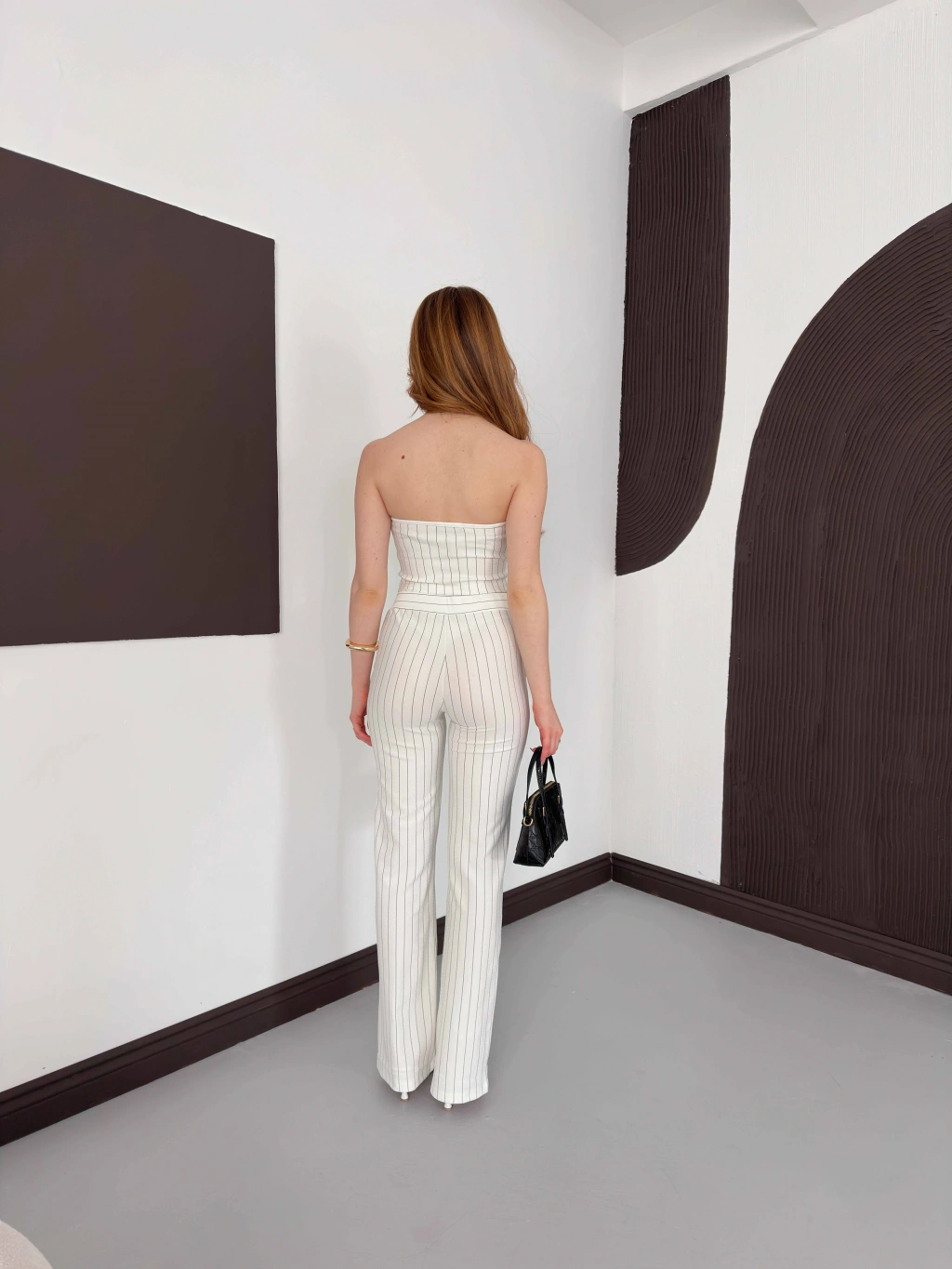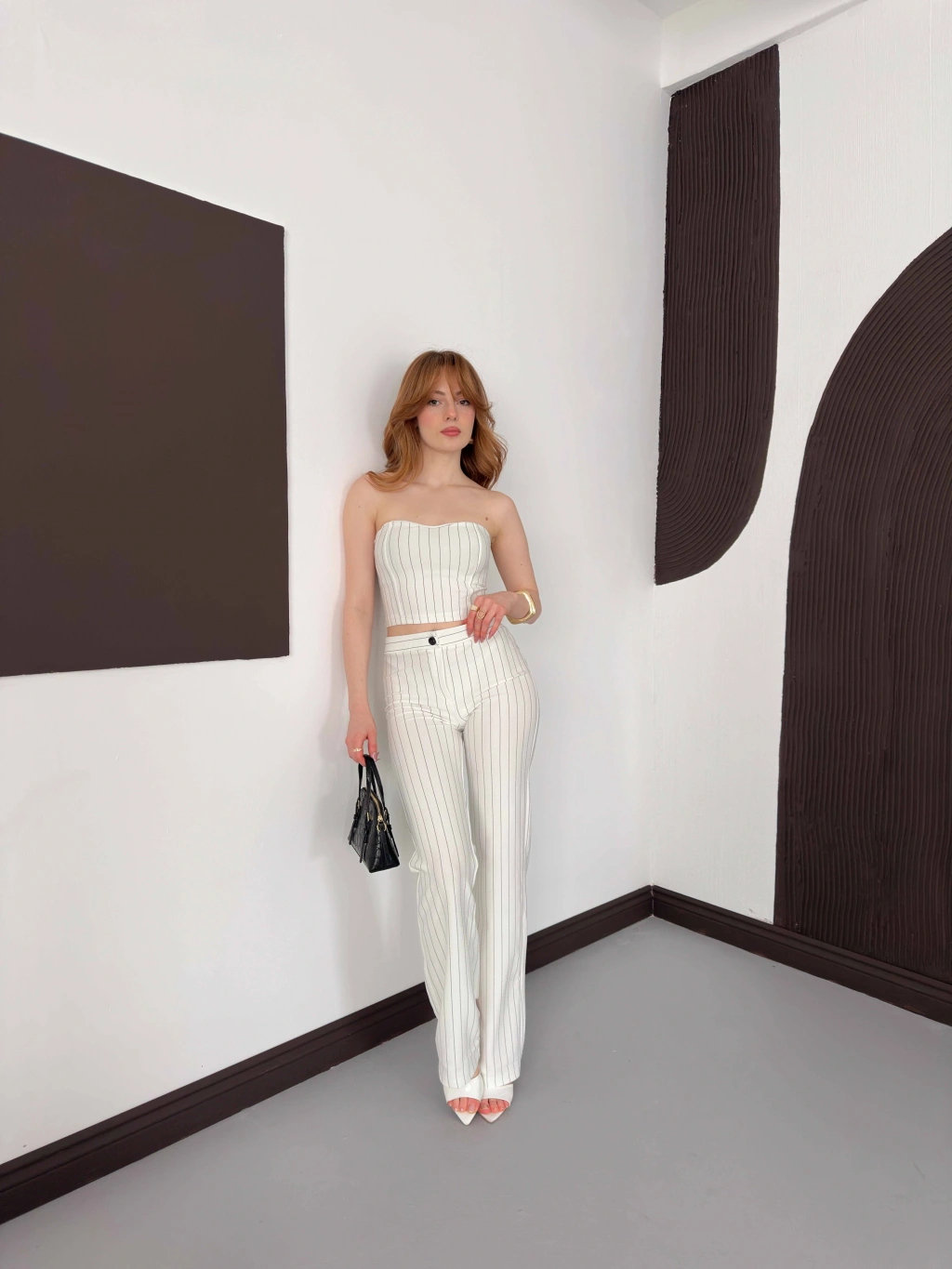 Çizgi Detaylı Crop - Pantolon Takım Beyaz