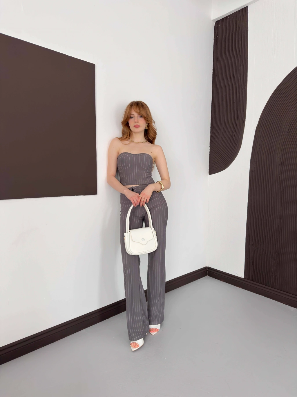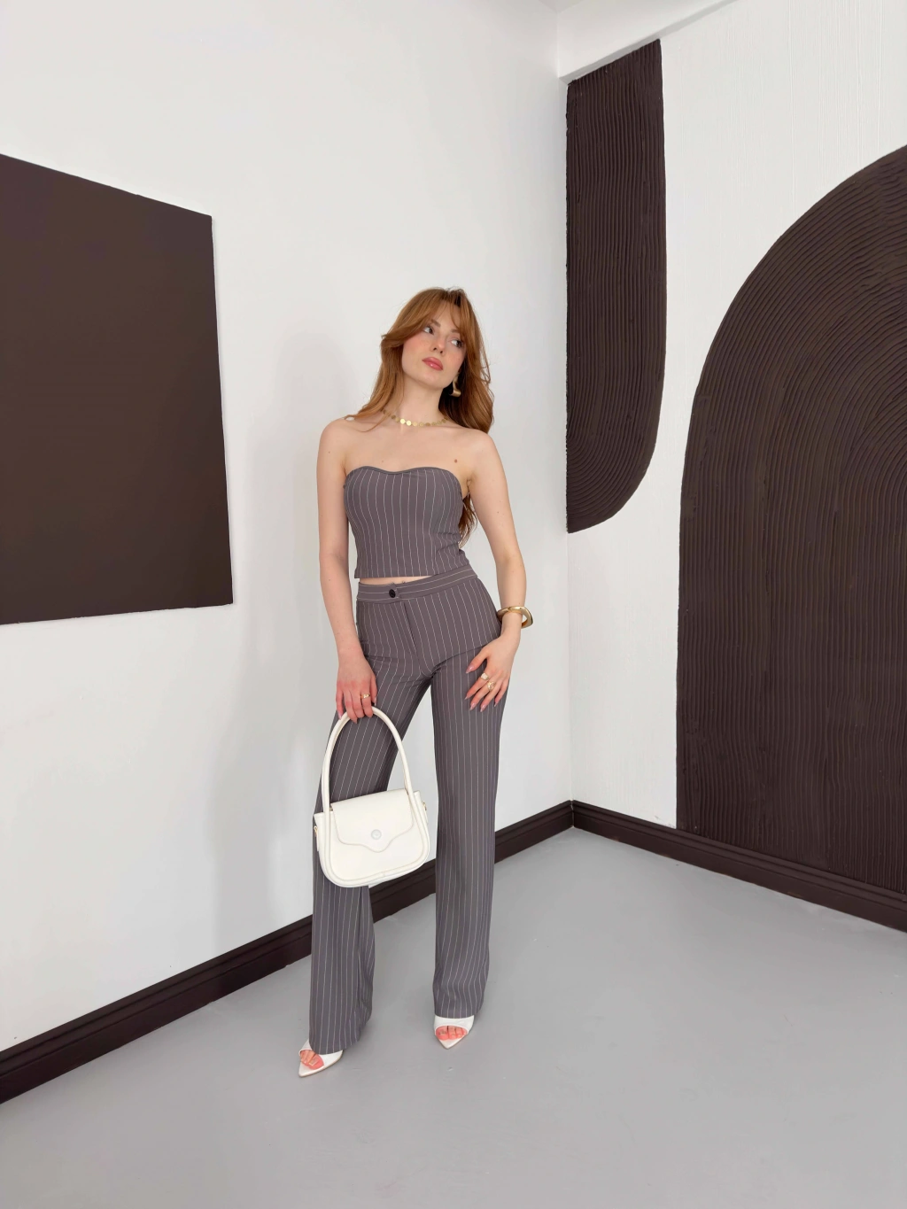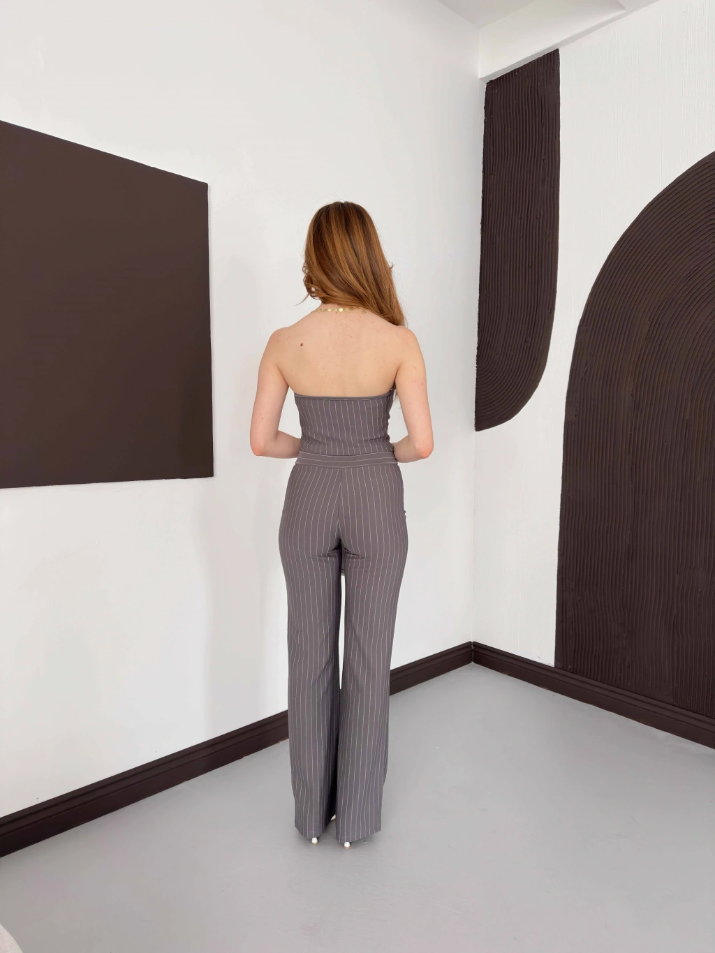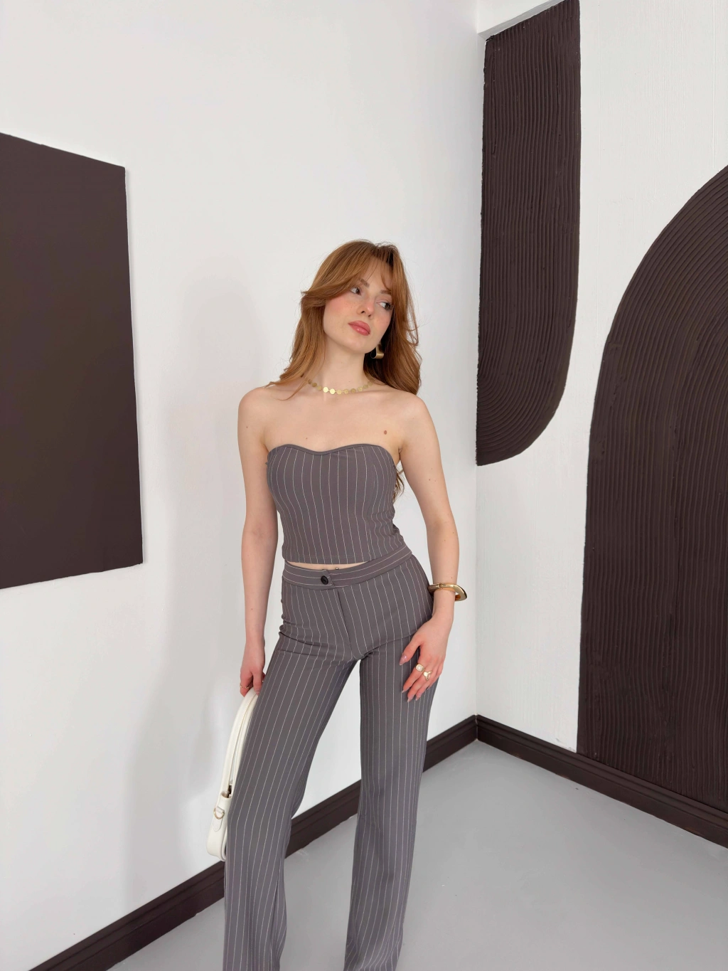 Çizgi Detaylı Crop - Pantolon Takım Gri